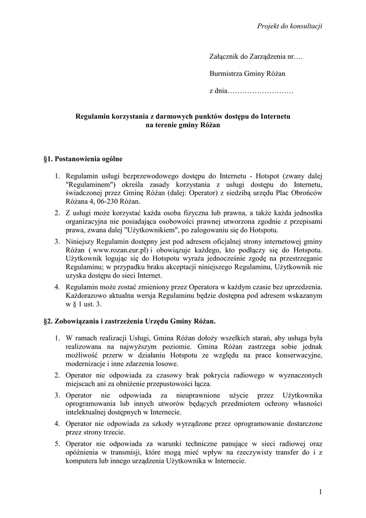 Projekt do konsultacji Załącznik do Zarządzenia nr…. Burmistrza Gminy RóŜan z dnia……………………… Regulamin korzystania z darmowych punktów dostępu do Internetu na terenie gminy RóŜan §1. Postanowienia ogólne 1. Regulamin usługi bezprzewodowego dostępu do Internetu - Hotspot (zwany dalej "Regulaminem") określa zasady korzystania z usługi dostępu do Internetu, świadczonej przez Gminę RóŜan (dalej: Operator) z siedzibą urzędu Plac Obrońców RóŜana 4, 06-230 RóŜan. 2. Z usługi moŜe korzystać kaŜda osoba fizyczna lub prawna, a takŜe kaŜda jednostka organizacyjna nie posiadająca osobowości prawnej utworzona zgodnie z przepisami prawa, zwana dalej "UŜytkownikiem", po zalogowaniu się do Hotspotu. 3. Niniejszy Regulamin dostępny jest pod adresem oficjalnej strony internetowej gminy RóŜan ( www.rozan.eur.pl) i obowiązuje kaŜdego, kto podłączy się do Hotspotu. UŜytkownik logując się do Hotspotu wyraŜa jednocześnie zgodę na przestrzeganie Regulaminu; w przypadku braku akceptacji niniejszego Regulaminu, UŜytkownik nie uzyska dostępu do sieci Internet. 4. Regulamin moŜe zostać zmieniony przez Operatora w kaŜdym czasie bez uprzedzenia. KaŜdorazowo aktualna wersja Regulaminu będzie dostępna pod adresem wskazanym w § 1 ust. 3. §2. Zobowiązania i zastrzeŜenia Urzędu Gminy RóŜan. 1. W ramach realizacji Usługi, Gmina RóŜan dołoŜy wszelkich starań, aby usługa była realizowana na najwyŜszym poziomie. Gmina RóŜan zastrzega sobie jednak moŜliwość przerw w działaniu Hotspotu ze względu na prace konserwacyjne, modernizacje i inne zdarzenia losowe. 2. Operator nie odpowiada za czasowy brak pokrycia radiowego w wyznaczonych miejscach ani za obniŜenie przepustowości łącza. 3. Operator nie odpowiada za nieuprawnione uŜycie przez UŜytkownika oprogramowania lub innych utworów będących przedmiotem ochrony własności intelektualnej dostępnych w Internecie. 4. Operator nie odpowiada za szkody wyrządzone przez oprogramowanie dostarczone przez strony trzecie. 5. Operator nie odpowiada za warunki techniczne panujące w sieci radiowej oraz opóźnienia w transmisji, które mogą mieć wpływ na rzeczywisty transfer do i z komputera lub innego urządzenia UŜytkownika w Internecie. 1 Projekt do konsultacji 6. Operator nie prowadzi wsparcia dla uŜytkowników sieci w zakresie zakupu i konfiguracji kart radiowych lub innych urządzeń odbiorczych, jak równieŜ nie ponosi odpowiedzialności za kompatybilność urządzeń uŜytkownika z infrastrukturą HotSpot. 7. Ze względów bezpieczeństwa nie jest gwarantowana dostępność do wszystkich usług sieciowych. Usługa darmowego Internetu zapewnia dostęp do stron www, poczty elektronicznej, e-administracji, e-bankowości i tym podobnych usług. Zabrania się korzystania z nielegalnego oprogramowania, programów P2P oraz pobierania utworów i/lub oprogramowania niezgodnego z prawem lub w sposób niezgodny z prawem. Operator ma prawo odmówić dostępu lub zablokować dostęp do Hotspotu UŜytkownikowi i/lub urządzeniu końcowemu, wobec którego zostanie wykazane złamanie któregokolwiek z niniejszych zakazów. 8. Transmisja radiowa nie jest szyfrowana. Operator nie ponosi odpowiedzialności za bezpieczeństwo danych przesyłanych i odbieranych przez UŜytkowników za pośrednictwem Hotspotu. 9. Dostęp do Internetu nie ma charakteru komercyjnego. 10. UŜytkownikowi przydzielane jest pasmo o maksymalnej przepustowości: 512Kb/s (download) oraz 512 Kb/s (upload).∗ KaŜdemu uŜytkownikowi lub urządzeniu końcowemu przyznaje się indywidualny kod dostępu do sieci Internet w celu rozliczenia ograniczeń. 11. Miesięczny limit transferu danych przypadający na kaŜdego uŜytkownika nie moŜe przekroczyć wartości 750 MB, przy czym do jego zliczenia sumuje się wartości ruchu przychodzącego (upload) i wychodzącego (download). 12. KaŜda sesja po zalogowaniu trwa 60 minut - po tym czasie istnieje moŜliwość ponownego zalogowania się do sieci. 13. Aby nawiązać połączenie naleŜy dysponować urządzeniem pracującym zgodnie ze standardem IEEE 802.11b lub 802.11g (pasmo 2,4GHz) – popularnie określanym jako WiFi. Do połączenia naleŜy wybrać sieć radiową zgodną z nazwą danej miejscowości. Wykaz nazw stanowi Załącznik do Regulaminu. NaleŜy korzystać z sektora który zapewnia UŜytkownikowi najsilniejszy sygnał. 14. Operator zastrzega moŜliwość analizowania i archiwizowania ruch uŜytkowników oraz udostępniania tej informacji na Ŝądanie uprawnionych organów śledczych i kontrolnych. §3. Obowiązki UŜytkownika 1. Korzystanie z sieci Hotspotów będzie się odbywało na wyłączne ryzyko UŜytkownika. 2. Zalogowanie się do usługi HotSpot oznacza jednocześnie akceptację niniejszego Regulaminu. ∗ Burmistrz Gminy w dniu 11.06.2013 r. wystąpił do Prezesa UKE o modyfikację wniosku w zakresie przepustowości łącza dla uŜytkownika końcowego tj.: zwiększenie prędkości do 1024kbit/s na terenach wiejskich i na terenie miejskim lub do 1024kbit/s na terenach wiejskich i do 512kbit/s na terenie miejskim. Decyzja zostanie podjęta przez Prezesa UKE w toku prowadzonego postępowania. 2 Projekt do konsultacji 3. UŜytkownikowi nie wolno uŜywać udostępnionej sieci punktów dostępowych między innymi do następujących celów: - przesyłania i udostępniania treści, które są niezgodne z prawem lub są przedmiotem ochrony własności intelektualnej, której podmiotem nie jest UŜytkownik, - przesyłania i udostępniania treści mogących naruszyć czyjekolwiek dobra osobiste, - masowego rozsyłania nie zamówionych przez odbiorców treści o charakterze reklamowym (tzw. spam), - rozpowszechniania wirusów komputerowych i innych programów mogących uszkodzić komputery innych uŜytkowników Internetu, - odsprzedawania lub udostępniania dostępu do Internetu innym uŜytkownikom, - permanentnego obciąŜania w znacznym stopniu przyznanego pasm