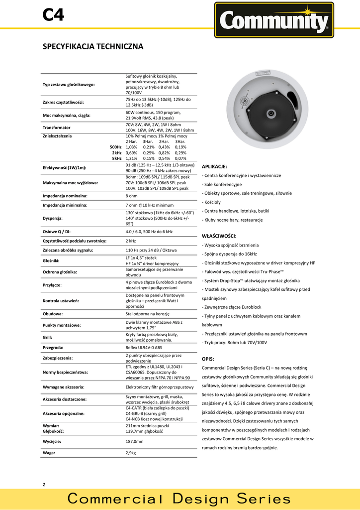 C4 SPECYFIKACJA TECHNICZNA Typ zestawu głośnikowego: Zakres częstotliwości: Moc maksymalna, ciągła: Transformator Zniekształcenia Efektywność (1W/1m): Maksymalna moc wyjściowa: Sufitowy głośnik koaksjalny, pełnozakresowy, dwudrożny, pracujący w trybie 8 ohm lub 70/100V 75Hz do 13.5kHz (-10dB); 125Hz do 12.5kHz (-3dB) 60W continous, 150 program, 21.9Volt RMS, 43.8 (peak) 70V: 8W, 4W, 2W, 1W I 8ohm 100V: 16W, 8W, 4W, 2W, 1W I 8ohm 10% Pełnej mocy 1% Pełnej mocy 2 Har. 3Har. 2Har. 3Har. 500Hz 1,03% 0,21% 0,43% 0,19% 2kHz 0,69% 0,25% 0,82% 0,29% 8kHz 1,21% 0,15% 0,54% 0,07% 91 dB (125 Hz – 12,5 kHz 1/3 oktawy) 90 dB (250 Hz - 4 kHz zakres mowy) 8ohm: 109dB SPL/ 115dB SPL peak 70V: 100dB SPL/ 106dB SPL peak 100V: 103dB SPL/ 109dB SPL peak Impedancja nominalna: 8 ohm Impedancja minimalna: 7 ohm @10 kHz minimum Dyspersja: 130° stożkowo (1kHz do 6kHz +/-60°) 140° stożkowo (500Hz do 6kHz +/65°) Osiowe Q / DI: 4.0 / 6.0, 500 Hz do 6 kHz Częstotliwość podziału zwrotnicy: 2 kHz Zalecana obróbka sygnału: 110 Hz przy 24 dB / Oktawa APLIKACJE: - Centra konferencyjne i wystawiennicze - Sale konferencyjne - Obiekty sportowe, sale treningowe, siłownie - Kościoły - Centra handlowe, lotniska, butiki - Kluby nocne bary, restauracje WŁAŚCIWOŚCI: Głośniki: Ochrona głośnika: LF 1x 4,5” stożek HF 1x ¾” driver kompresyjny Samoresetujące się przerwanie obwodu Przyłącze: 4 pinowe złącze Euroblock z dwoma niezależnymi podłączeniami Kontrola ustawień: Dostępne na panelu frontowym głośnika – przełącznik Watt i oporności Obudowa: Stal odporna na korozję Punkty montażowe: Grill: Przegroda: Zabezpieczenia: Normy bezpieczeństwa: Dwie klamry montażowe ABS z uchwytem 1,75” Kryty farbą proszkową biały, możliwość pomalowania. - Wysoka spójność brzmienia - Spójna dyspersja do 16kHz - Głośniki stożkowe wyposażone w driver kompresyjny HF - Falowód wys. częstotliwości Tru-Phase™ - System Drop-Stop™ ułatwiający montaż głośnika - Mostek szynowy zabezpieczający kafel sufitowy przed spadnięciem - Zewnętrzne złącze Euroblock - Tylny panel z uchwytem kablowym oraz kanałem kablowym - Przełączniki ustawień głośnika na panelu frontowym - Tryb pracy: 8ohm lub 70V/100V Reflex UL94V-0 ABS 2 punkty ubezpieczające przez podwieszenie ETL zgodny z UL1480, UL2043 i CSA60065. Dopuszczony do wieszania przez NFPA 70 i NFPA 90 OPIS: Commercial Design Series (Seria C) – na nową rodzinę zestawów głośnikowych Community składają się głośniki Elektroniczny filtr górnoprzepustowy sufitowe, ścienne i podwieszane. Commercial Design Series to wysoka jakość za przystępna cenę. W rodzinie Wymiar: Głębokość: Szyny montażowe, grill, maska, wzorzec wycięcia, płaski śrubokręt C4-CATR (biała zaślepka do puszki) C4-GRL-B (czarny grill) C4-NCB Kosz nowej konstrukcji 211mm średnica puszki 139,7mm głębokość Wycięcie: 187,0mm Waga: 2,9kg Wymagane akcesoria: Akcesoria dostarczone: Akcesoria opcjonalne: znajdziemy 4.5, 6,5 i 8 calowe drivery znane z doskonałej jakości dźwięku, spójnego przetwarzania mowy oraz niezawodności. Dzięki zastosowaniu tych samych komponentów w poszczególnych modelach i rodzajach zestawów Commercial Design Series wszystkie modele w ramach rodziny brzmią bardzo spójnie. z C4 PASMO PRZENOSZENIA IMPEDANCJA DYSPERSJA Q OSIOWE ODCHYLENIA DYSPERSJI WYMIARY z C4 AKCESORIA DOŁĄCZONE AKCESORIA OPCJONALNE SZYNA BIAŁA ZAŚLEPKA / ADATER ZACZEP SZYNY NOWY KOSZ MONTAŻOWY WZORZEC WYCIĘCIA z