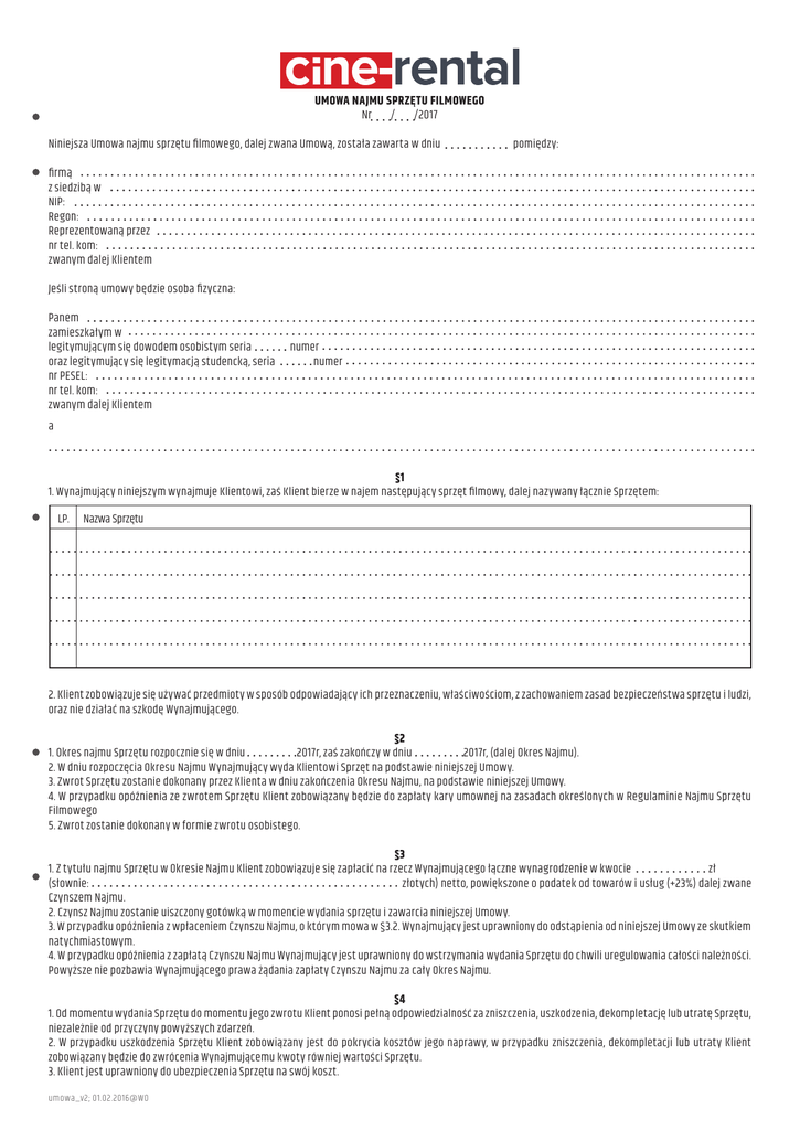 UMOWA NAJMU SPRZĘTU FILMOWEGO Nr / /2017 Niniejsza Umowa najmu sprzętu filmowego, dalej zwana Umową, została zawarta w dniu pomiędzy: firmą z siedzibą w NIP: Regon: Reprezentowaną przez nr tel. kom: zwanym dalej Klientem Jeśli stroną umowy będzie osoba fizyczna: Panem zamieszkałym w legitymującym się dowodem osobistym seria oraz legitymujący się legitymacją studencką, seria nr PESEL: nr tel. kom: zwanym dalej Klientem numer numer a §1 1. Wynajmujący niniejszym wynajmuje Klientowi, zaś Klient bierze w najem następujący sprzęt filmowy, dalej nazywany łącznie Sprzętem: LP. Nazwa Sprzętu 2. Klient zobowiązuje się używać przedmioty w sposób odpowiadający ich przeznaczeniu, właściwościom, z zachowaniem zasad bezpieczeństwa sprzętu i ludzi, oraz nie działać na szkodę Wynajmującego. §2 1. Okres najmu Sprzętu rozpocznie się w dniu 2017r, zaś zakończy w dniu 2017r, (dalej Okres Najmu). 2. W dniu rozpoczęcia Okresu Najmu Wynajmujący wyda Klientowi Sprzęt na podstawie niniejszej Umowy. 3. Zwrot Sprzętu zostanie dokonany przez Klienta w dniu zakończenia Okresu Najmu, na podstawie niniejszej Umowy. 4. W przypadku opóźnienia ze zwrotem Sprzętu Klient zobowiązany będzie do zapłaty kary umownej na zasadach określonych w Regulaminie Najmu Sprzętu Filmowego 5. Zwrot zostanie dokonany w formie zwrotu osobistego. §3 1. Z tytułu najmu Sprzętu w Okresie Najmu Klient zobowiązuje się zapłacić na rzecz Wynajmującego łączne wynagrodzenie w kwocie zł (słownie: złotych) netto, powiększone o podatek od towarów i usług (+23%) dalej zwane Czynszem Najmu. 2. Czynsz Najmu zostanie uiszczony gotówką w momencie wydania sprzętu i zawarcia niniejszej Umowy. 3. W przypadku opóźnienia z wpłaceniem Czynszu Najmu, o którym mowa w §3.2. Wynajmujący jest uprawniony do odstąpienia od niniejszej Umowy ze skutkiem natychmiastowym. 4. W przypadku opóźnienia z zapłatą Czynszu Najmu Wynajmujący jest uprawniony do wstrzymania wydania Sprzętu do chwili uregulowania całości należności. Powyższe nie pozbawia Wynajmującego prawa żądania zapłaty Czynszu Najmu za cały Okres Najmu. §4 1. Od momentu wydania Sprzętu do momentu jego zwrotu Klient ponosi pełną odpowiedzialność za zniszczenia, uszkodzenia, dekompletację lub utratę Sprzętu, niezależnie od przyczyny powyższych zdarzeń. 2. W przypadku uszkodzenia Sprzętu Klient zobowiązany jest do pokrycia kosztów jego naprawy, w przypadku zniszczenia, dekompletacji lub utraty Klient zobowiązany będzie do zwrócenia Wynajmującemu kwoty równiej wartości Sprzętu. 3. Klient jest uprawniony do ubezpieczenia Sprzętu na swój koszt. umowa_v2; 01.02.2016@WO §5 1. Celem zabezpieczenia roszczeń wynikających z niniejszej Umowy, na warunkach określonych Regulaminie Najmu Sprzętu Filmowego Wynajmujący przed wydaniem Sprzętu ma prawo żądać ustanowienia dodatkowych zabezpieczeń. §6 1. Wszelkie zmiany niniejszej Umowy wymagają formy pisemnej pod rygorem nieważności. 2. Strony ustalają, iż niniejsza Umowa oraz załączniki do niej mają charakter poufny. 3. Strony zobowiązują się informować wzajemnie na piśmie, elektronicznie lub telefonicznie o wszelkich pojawiających się zmianach, a korespondencja przesyłana na powyższy odpowiedni adres, jest uważana za doręczoną właściwie. W razie wynikłego sporu będzie stanowić dowód i załącznik do niniejszej umowy w dowolnej formie. 4. Załączniki dołączone do niniejszej Umowy stanowią jej integralną część. Klient oświadcza iż zapoznał się z Regulaminem Najmu Sprzętu Filmowego, stanowiącymi załącznik do niniejszej Umowy oraz akceptuje ich treść i zobowiązuje się do ich przestrzegania. W razie rozbieżności pomiędzy postanowieniami niniejszej Umowy a postanowieniami zawartymi w Regulaminie Najmu Sprzętu Filmowego, pierwszeństwo mają postanowienia Umowy. 5. Niniejsza Umowa podlega prawu polskiemu i zgodnie z nim powinna być interpretowana. 6. Wszelkie spory, które wynikną między Stronami w związku z niniejszą Umową mają być wnoszone przed Sąd miejscowo właściwy dla Wynajmującego. 7. Niniejsza Umowa została sporządzona w dwóch egzemplarzach, po jednym egzemplarzu dla każdej ze Stron. Załączniki: 1. Regulamin Najmu Sprzętu Filmowego; 2. Faktura VAT; 3. Zdjęcie dowodu osobistego i drugiego dokumentu Klienta (kserokopia lub w formie cyfrowej); 4. Zaświadczenie o prowadzeniu działalności gospodarczej (kserokopia). Klient: Wynajmujący: WYDANIE Wydanie sprzętu nastąpiło zgodnie z treścią zawartą w tej UMOWIE NAJMU SPRZĘTU FILMOWEGO oraz załączonymi do niej REGULAMINEM NAJMU SPRZĘTU FILMOWEGO. Klient nie zgłasza żadnych zastrzeżeń. Klient: Wynajmujący: ZWROT Zwrot sprzętu nastąpiło zgodnie z treścią zawartą w tej UMOWIE NAJMU SPRZĘTU FILMOWEGO oraz załączonymi do niej REGULAMINEM NAJMU SPRZĘTU FILMOWEGO. Wynajmujący ma prawo zgłosić zastrzeżenia w przeciągu 48h od daty i godziny Zwrotu Sprzętu podanego w § 2.1 tej Umowy Najmu Sprzętu Filmowego. Opis zastrzeżeń: Klient: umowa_v2; 01.02.2016@WO Wynajmujący: