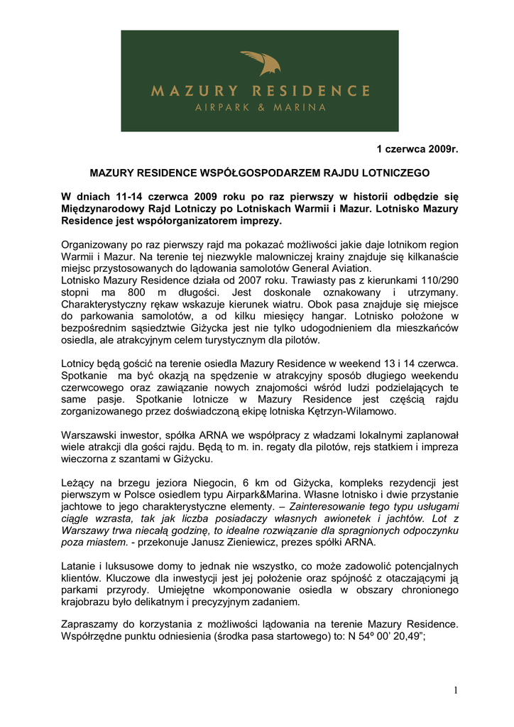 1 czerwca 2009r. MAZURY RESIDENCE WSPÓŁGOSPODARZEM RAJDU LOTNICZEGO W dniach 11-14 czerwca 2009 roku po raz pierwszy w historii odbędzie się Międzynarodowy Rajd Lotniczy po Lotniskach Warmii i Mazur. Lotnisko Mazury Residence jest współorganizatorem imprezy. Organizowany po raz pierwszy rajd ma pokazać możliwości jakie daje lotnikom region Warmii i Mazur. Na terenie tej niezwykle malowniczej krainy znajduje się kilkanaście miejsc przystosowanych do lądowania samolotów General Aviation. Lotnisko Mazury Residence działa od 2007 roku. Trawiasty pas z kierunkami 110/290 stopni ma 800 m długości. Jest doskonale oznakowany i utrzymany. Charakterystyczny rękaw wskazuje kierunek wiatru. Obok pasa znajduje się miejsce do parkowania samolotów, a od kilku miesięcy hangar. Lotnisko położone w bezpośrednim sąsiedztwie Giżycka jest nie tylko udogodnieniem dla mieszkańców osiedla, ale atrakcyjnym celem turystycznym dla pilotów. Lotnicy będą gościć na terenie osiedla Mazury Residence w weekend 13 i 14 czerwca. Spotkanie ma być okazją na spędzenie w atrakcyjny sposób długiego weekendu czerwcowego oraz zawiązanie nowych znajomości wśród ludzi podzielających te same pasje. Spotkanie lotnicze w Mazury Residence jest częścią rajdu zorganizowanego przez doświadczoną ekipę lotniska Kętrzyn-Wilamowo. Warszawski inwestor, spółka ARNA we współpracy z władzami lokalnymi zaplanował wiele atrakcji dla gości rajdu. Będą to m. in. regaty dla pilotów, rejs statkiem i impreza wieczorna z szantami w Giżycku. Leżący na brzegu jeziora Niegocin, 6 km od Giżycka, kompleks rezydencji jest pierwszym w Polsce osiedlem typu Airpark&Marina. Własne lotnisko i dwie przystanie jachtowe to jego charakterystyczne elementy. – Zainteresowanie tego typu usługami ciągle wzrasta, tak jak liczba posiadaczy własnych awionetek i jachtów. Lot z Warszawy trwa niecałą godzinę, to idealne rozwiązanie dla spragnionych odpoczynku poza miastem. - przekonuje Janusz Zieniewicz, prezes spółki ARNA. Latanie i luksusowe domy to jednak nie wszystko, co może zadowolić potencjalnych klientów. Kluczowe dla inwestycji jest jej położenie oraz spójność z otaczającymi ją parkami przyrody. Umiejętne wkomponowanie osiedla w obszary chronionego krajobrazu było delikatnym i precyzyjnym zadaniem. Zapraszamy do korzystania z możliwości lądowania na terenie Mazury Residence. Współrzędne punktu odniesienia (środka pasa startowego) to: N 54º 00’ 20,49”; 1 E 021º 49’ 13,89”; kierunek pasa 110º / 290º (GEO); krąg południowy 300 m AGL; wysokość pola wzlotów 124 m n.p.m. PLAN RAJDU 11.06.2009r – czwartek (Boże Ciało) 00 00 11 -18 Przylot załóg do Kętrzyna; Program zorganizowany przez lotnisko Kętrzyn-Wilamowo; 00 30 18 -19 Zakwaterowanie w hotelach i pensjonatach zgłoszeniami załóg; 1930-2300 Wieczór integracyjny, z grillowaniem i muzyką; zgodnie z wcześniejszymi 12.06.2009r – piątek 0900-0930 Odprawa pilotów – omówienie trasy, procedur i konkurencji; 0930-1000 Przygotowanie samolotów do wylotu z Kętrzyna; 1000-1100 Przelot do Elbląga na lotnisko Aeroklubu Elbląskiego (lądowanie punktowane); 1100-1300 Pobyt w Elblągu wg programu gospodarzy Miasta Elbląskiego; 00 45 przewidzianych i Aeroklubu 13 -13 Przelot do Olsztyna na lotnisko Dajtki (lądowanie punktowane); 1345-1600 Pobyt w Olsztynie wg programu gospodarzy Miasta i Aeroklubu Warmińsko – Mazurskiego; 1600-1630 Przelot na lotnisko w Gryźlinach (lądowanie punktowane); 1630-1745 Pobyt w Gryźlinach wg programu Starostwa Powiatowego w Olsztynie i Gminy; 1745-1815 Przelot na lotnisko Szymany; 15 00 18 -19 Zapoznanie się z infrastrukturą lotniska – planami Zarządu Spółki uruchomienia Lotniska Regionalnego; 1900-1945 Przelot – powrót na lotnisko Kętrzyn Wilamowo; 00 00 20 -23 i Wieczór w Tawernie Awiatorów z udziałem załogi samolotu Dacota DC-3 ze Szwecji lub alternatywnie wyprawa na kolację do Zamku w Rynie; 2 13.06.2009r. sobota 0900-0930 Odprawa pilotów –omówienie programu dnia i planowanych konkurencji ocenianych przez Jury; 0930-1000 Przygotowanie samolotów do wylotu; 00 30 10 -10 Przelot na lądowisko w Babiętach (lądowanie punktowane); 1030-1200 Program pełen niespodzianek wg inwencji Marcina Stana - gospodarza lądowiska; 1200-1230 Przelot na lądowisko Rostki (lądowanie punktowane); 1230-1315 Spotkanie z przedstawicielami samorządu Gminy i Powiatu Pisz oraz dyrektorem ZUA PZL Mielec; 1315-1345 Przelot na lotnisko Mazury Residence w Gminie Giżycko nad jez. Niegocin (lądowanie punktowane); 1345 -2200 W programie atrakcje na lądzie i wodzie. Regaty dla pilotów, rejs statkiem, impreza integracyjna z szantami. Pobyt na terenie Mazury Residence ma być okazją do szerszego poznania możliwości aktywnego spędzenia weekendu; 00 00 22 -23 Wieczorna podróż statkiem do hoteli na nocny odpoczynek; 14.06.2009r niedziela 1000-1100 Przejazd z hoteli na lotnisko Mazury Residence; 1100-1115 Odprawa pilotów; 1115-1130 Przygotowanie samolotów do wylotu; 30 15 11 -12 Trasa nawigacyjna – Mazury Residence – Giżycko – Łabędzi Szlak – Sztynort – Węgorzewo – Mamerki i Kanał Mazurski – Wilczy Szaniec – Kętrzyn – oraz lądowanie na lotnisku Wilamowo; 1215-1300 Lotniczy lunch w Tawernie Awiatorów; 1300-1400 Oficjalne zakończenie Rajdu, ogłoszenie wyników rywalizacji, wręczenie zwycięzcom pucharów i dyplomów oraz certyfikatów uczestnictwa w Rajdzie dla wszystkich załóg; 3 INFORMACJE DODATKOWE Infrastruktura osiedla Mazury Residence: - lotnisko dla samolotów turystycznych - hotel - restauracja - dwie przystanie jachtowe - stajnia (planowana) - plaża - korty tenisowe - planowane 18 dołkowe pole golfowe (graniczące z inwestycją) - boiska do gier zespołowych - zaplecze medyczne, w tym lotnicze pogotowie ratunkowe i baza WOPR - ochrona i monitoring Ceny: Na cenę każdej rezydencji składają się dwa elementy: dom którego 1m2 koszt