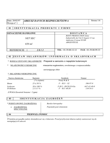 Data: 20/02/97 Wersja n° 1 01 IDENTYFIKACJA PRODUKTU I FIRMY OZNACZENIE HANDLOWE DOSTAWCA O S T A W C Zone A RONTd PRODUCTION Industrielle du Val d’Argent 12 rue Ambroise Croizat 95100 ARGENTEUIL NET SEC 650 ml REFERENCJE 02 Strona 1/6 ARKUSZ DANYCH BEZPIECZEŃSTWA | TEL : 01.39.80.12.12 2012 FAX : 01.39.80.99.33 ZESTAW SKŁADNIKÓW / INFORMACJA O SKŁADNIKACH * RODZAJ ZESTAWU SKŁADNIKÓW Preparat w aerozolu o napędzie butanowym * WŁAŚCIWOŚCI CHEMICZNE mieszanina węglowodoru, uwolnionego z rozpuszczalnika zawierającego chlor * SKŁADNIKI NIEBEZPIECZNE Nazwa chemiczna : StęŜenie ( % cięŜaru) Symbole Frazy R & S Butan 25 à 50 % F – R13 – S2 Izohexan H-Hehane 50 à 100 % 2,5 à 5 % F-R11 –S9/29/33/43a F – R11 48/20 Numer 106-97-8 647-42-49-0 110-54-3 (UWAGA Zawartość benzenu > 5 ppm) \ 03 IDENTYFIKACJA ZAGROśEŃ * PODSTAWOWE ZAGROśENIA • | 04 ZAGROśENIA SPECYFICZNE Bardzo łatwopalny Pojemnik pod ciśnieniem PIERWSZA POMOC : W kaŜdym przypadku naleŜy skontaktować się z lekarzem. Przed przybyciem lekarza naleŜy zastosować się do następujących zaleceń: * OPARY Wyprowadzić osobę mającą kontakt z gazem z pomieszczenia na świeŜe powietrze. . W razie problemów z oddychaniem zastosować sztuczne oddychanie . Skontaktować się z lekarzem lub szpitalem. | OZNACZENIE : NET SEC REF. : 2012 | DATA : 20/02/97 |STRONA 2/6 * KONTAKT ZE SKÓRĄ Zdjąć zanieczyszczone ubranie. Przemyć miejsca, które miały kontakt z substancją duŜą ilością wody z mydłem i dokładnie spłukać. Jeśli podraŜnienie utrzymuje się naleŜy skontaktować się z dermatologiem. * KONTAKT Z OCZAMI Płukać natychmiast duŜą ilością wody przez10 min. W razie, utrzymywania się podraŜnienia, naleŜy skontaktować się z okulistą. Nie prowokować wymiotów. Wezwać pogotowie. Utrzymywać chorego w pozycji nieruchomej. • POŁKNIĘCIE 05 POSTĘPOWANIE W PRZYPADKU POśARU PPPPppPRZYPADKU POśARU L‘INCENDIE • SPOSOBY GASZENIA Właściwe – Pianka-Proszek- bezwodnik węglowy Nie zalecane Woda * ZAGROśENIA SPECYFICZNE • 06 OCHRONA OSÓB INTERWENIUJĄCYCH Uwalnianie się tlenku węgla. Jego opary w zetknięciu z powietrzem mogą utworzyć mieszankę wybuchową mmmieszankęwybuchową mogą Zakład powinien być zaopatrzony w maski przeciwgazowe oraz odpowiednią odzieŜ ochronną. Aerozole powinny znajdować się w bezpiecznej odległości od źródeł ciepła w celu uniknięcia nadmiernego ciśnienia. W razie potrzeby schłodzić wodą POSTĘPOWANIE W PRZYPADKU PRZYPADKOWEGO ROZPROSZENIA * INDYWIDUALNE ŚRODKI OSTROśNOŚCI Zlikwidować wszelkie potencjalne źródła zapłonu w najbliŜszej strefie. Zapobiegać gromadzeniu się elektryczności statycznej Unikać wdychania i kontaktu ze skórą Powstrzymać się od palenia w czasie wykonywania czynności. Przestrzegać środków ostroŜności podanych w § 07. * OCHRONA OTOCZENIA : W razie przypadkowego rozlania naleŜy zapobiec wypływowi substancji .UŜywać piasku lub innego obojętnego środka absorbującego. Zapobiegać zagroŜeniu powstania poŜaru lub wybuchu. Usunąć wszelkie potencjalne źródła samozapłonu | • METODA CZYSZCZENIA Środki absorbujące. Usuwanie powinno się odbywać za pomocą atestowanego rekuperatora OZNACZENIE : NET SEC 07 • O B C H O D Z E N I E S I Ę I | DATA : 20/02/97 | PAGE 3/6 M A G A Z Y N O W A N I E STOSOWANIE - Środki techniczne - Środki ostroŜności - REF. : 2012 Zalecane stosowanie Naciskać krótko bez dłuŜszego rozpylania w pomieszczeniu dobrze wentylowanym w odpowiedniej odległości od źródeł zapłonu. Nie rozpylać w pobliŜu ognia lub punktu rozŜarzonego. Nie palić papierosów, nie pić, ani nie jeść w trakcie uŜycia. Unikać wdychania i kontaktu z substancją. UŜywać i przechowywać z daleka od wszelkich płomieni, źródła ciepła lub włączonej aparatury. Dobrze przewietrzyć po uŜyciu. Ze względu na łatwopalność produktu przestrzegać przepisów dotyczących higieny i bezpieczeństwa. * PRZECHOWYWANIE - Środki techniczne - Zalecane warunki przechowywania Przechowywać w miejscu niedostępnym dla dzieci. Nie palić w miejscu przechowywania. Przechowywać w pomieszczeniach wentylowanych .Chronić przed wysokimi temperaturami(powyŜej 50 C) , słońcem oraz wilgocią szczególnie w opakowaniach białych metalowych. Utleniacze i silne kwasy. Substancje niekompatybilne - Zalecane opakowanie 08 Opakowanie producenta. KONTROLA EKSPOZYCJI / ZABEZPIECZENIE INDYWIDUALNE * KONTROLA EKSPOZYCJI ZALECANA OBJĘTOŚC : 300 ppm na izohexan *WYPOSAśENIE ZABEZPIECZENIA INDYWIDUALNEGO Ochrona dróg oddechowych Zalecana - Ochrona rąk Zalecana (rękawice odporne na węglowodory) -Ochrona oczu Zalecana ( okulary odporne na węglowodory) - Ochrona skóry i ciała (oprócz rąk ) Zalecana ŚRODKI HIGIENY Unikać nadmiernego wdychania jak równieŜ dłuŜszego kontaktu ze skórą. W razie kontaktu umyć się wodą z mydłem i dokładnie spłukać OZNACZENIE: NET SEC REF. : 2012 | DATA : 20/05/97 | STRONA 4/6 WŁAŚCIWOŚCI FIZYCZNE I CHEMICZNE 09 *STAN FIZYCZNY Produkt aktywny ciekły *KOLOR Ciecz bezbarwna *ZAPACH Lekko eteryczny *PH Niestosowany *TEMPERATURA POCZĄTKOWA DESTYLACJI 88° C dla produktu aktywnego *PUNKT BŁYSKU Produkt aktywny < 0° C *SAMO-PALNOŚĆ > 200° C * CHARAKTERYSTYKI WYBUCHOWOŚCI * CIŚNIENIE PARY Napęd 1.9 à 9.5 % obj.. Produkt aktywny 0.6 à 7 % obj. 0.67 g/cm3 około w temperaturze 20° C produkt aktywny 67 Kpa w temperaturze 38° C * GĘSTOŚC PARY >1 * ROZPUSZCZALNOŚĆ Nierozpuszczalny w wodzie, rozpuszczalny w węglowodorach * MASA WŁAŚCIWA * INNE DANE 10 TRWAŁOŚĆ * TRWAŁOŚĆ & ZDOLNOŚĆ REAKCJI R E Reaguje A C Tz silnymi I V I utleniaczami T E * NIEZALECANE WARUNKI Nie uŜywać w pobliŜu ognia lub substancji silnie rozgrzanych. * NIEZALECANE MATERIAŁY Silne utleniacze i materiały nieodporne na węglowodory * NIEBEZPIECZNE SKLADNIKI Tlenek węgla • 11 INFORMACJE TOKSYKOLOGICZNE TOKSYKOLOGICZNE * DANE TOKSYKOLOGICZNE