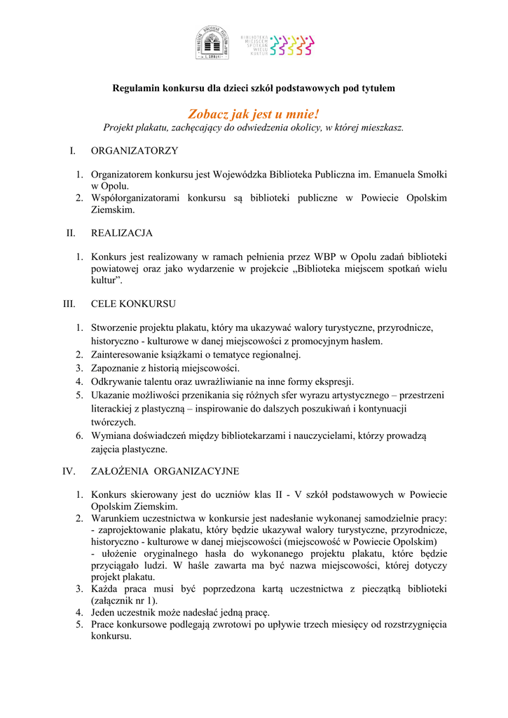 Regulamin konkursu dla dzieci szkół podstawowych pod tytułem Zobacz jak jest u mnie! Projekt plakatu, zachęcający do odwiedzenia okolicy, w której mieszkasz. I. ORGANIZATORZY 1. Organizatorem konkursu jest Wojewódzka Biblioteka Publiczna im. Emanuela Smołki w Opolu. 2. Współorganizatorami konkursu są biblioteki publiczne w Powiecie Opolskim Ziemskim. II. REALIZACJA 1. Konkurs jest realizowany w ramach pełnienia przez WBP w Opolu zadań biblioteki powiatowej oraz jako wydarzenie w projekcie „Biblioteka miejscem spotkań wielu kultur”. III. CELE KONKURSU 1. Stworzenie projektu plakatu, który ma ukazywać walory turystyczne, przyrodnicze, historyczno - kulturowe w danej miejscowości z promocyjnym hasłem. 2. Zainteresowanie książkami o tematyce regionalnej. 3. Zapoznanie z historią miejscowości. 4. Odkrywanie talentu oraz uwrażliwianie na inne formy ekspresji. 5. Ukazanie możliwości przenikania się różnych sfer wyrazu artystycznego – przestrzeni literackiej z plastyczną – inspirowanie do dalszych poszukiwań i kontynuacji twórczych. 6. Wymiana doświadczeń między bibliotekarzami i nauczycielami, którzy prowadzą zajęcia plastyczne. IV. ZAŁOŻENIA ORGANIZACYJNE 1. Konkurs skierowany jest do uczniów klas II - V szkół podstawowych w Powiecie Opolskim Ziemskim. 2. Warunkiem uczestnictwa w konkursie jest nadesłanie wykonanej samodzielnie pracy: - zaprojektowanie plakatu, który będzie ukazywał walory turystyczne, przyrodnicze, historyczno - kulturowe w danej miejscowości (miejscowość w Powiecie Opolskim) - ułożenie oryginalnego hasła do wykonanego projektu plakatu, które będzie przyciągało ludzi. W haśle zawarta ma być nazwa miejscowości, której dotyczy projekt plakatu. 3. Każda praca musi być poprzedzona kartą uczestnictwa z pieczątką biblioteki (załącznik nr 1). 4. Jeden uczestnik może nadesłać jedną pracę. 5. Prace konkursowe podlegają zwrotowi po upływie trzech miesięcy od rozstrzygnięcia konkursu. 6. Prace nadesłane na konkurs muszą być oryginalne, nie prezentowane wcześniej na innych konkursach. V. WYKONANIE PRAC 1. Format pracy to kartka A4. 2. Ilustrację należy wykonać dowolną, trwałą techniką plastyczną płaską. 3. Plakat powinien zachęcać do odwiedzenia danej miejscowości, może ukazywać ciekawe budynki, ulice, wzory regionalne, walory przyrodnicze i.in. 4. Hasło promocyjne na plakacie powinno być widoczne i może być napisane gwarą – prace nie posiadające hasła nie będą brane pod uwagę przy ocenie przez jury konkursu. VI. ZADANIA DLA WSPÓŁORGANIZATORÓW 1. Rozpropagowanie konkursu na terenie gminy, w bibliotece, filiach bibliotecznych i oddziałach. 2. Rozpropagowanie konkursu w szkołach podstawowych. 3. Zebranie kart uczestnictwa w konkursie. 4. Zebranie prac. 5. Kartę uczestnictwa wraz z pracą konkursową należy przed wysłaniem do Organizatora konkursu spiąć spinaczem. 6. Przesłanie lub dostarczenie prac wraz z poprawnie wypełnionymi kartami uczestnictwa do Organizatora pod adres Wojewódzka Biblioteka Publiczna, 45 – 081 Opole, ul. Piastowska 20, Dział Instrukcyjno-Metodyczny) z dopiskiem na kopercie „Konkurs - plakat” do 25.06.2015 r. 7. Omówienie z uczestnikami konkursu zasad tworzenia plakatu i przedstawienie cech dobrego plakatu.i 8. Dostarczenie uczestnikom wiedzy czym są zbiory regionalne w bibliotece publicznej, m.in. książki, albumy, pocztówki. 9. Zapoznanie uczestników z historią i tradycjami danej miejscowości, np. organizacja lekcji bibliotecznej, spotkanie z pisarzem regionalnym, kolekcjonerem zdjęć, pocztówek o danym regionie itp. VII. TERMINY 1. Konkurs trwa od 05.05.2015 r. do 25.06.2015 r. 2. Rozstrzygniecie konkursu nastąpi we wrześniu 2015 r. VIII. OCENA PRAC I NAGRODY 1. Wojewódzka Biblioteka Publiczna im. Emanuela Smołki w Opolu za najlepsze prace w każdej grupie przyzna 3 nagrody główne i 10 wyróżnień. 2. Każdy uczestnik otrzyma dyplom. 3. Każda osoba wyróżniona otrzyma nagrodę książkową. 4. Kryteria oceny: merytoryczna tj. poprawnie napisane i oryginalne hasło promocyjne na plakacie. artystyczna tj. oryginalność, walory artystyczne, gama kolorystyczna, estetyka. 5. Prace będą oceniane w dwóch grupach, według podziału na klasy: kl. II – III kl. IV – V 6. Punktacja prac: Z każdego kryterium oceny (merytorycznego, artystycznego) można dostać od 1 do 10 punktów. Maksymalnie za całą pracę konkursową można otrzymać 20 punktów. Prace będą oceniane przez jury. 7. Najlepsze prace zostaną zaprezentowane w wybranych bibliotekach publicznych województwa opolskiego. 8. Nagrody zostaną wręczone w trakcie uroczystego podsumowania. 9. Organizator zastrzega sobie prawo decyzji o zmianie liczby nagród i wyróżnień, oraz sposobach promocji nagrodzonych prac. IX. POSTANOWIENIA KOŃCOWE 1. Wyniki konkursu zostaną ogłoszone w każdej bibliotece publicznej, która weźmie udział w konkursie i przekazane uczestnikom. 2. Konkurs odbędzie się tylko w przypadku zgłoszenia się przynajmniej 30 uczestników. 3. W kwestiach spornych ostateczna decyzja należy do Organizatora. 4. Organizator zastrzega sobie prawo zmiany regulaminu. 5. Sytuacje nieobjęte niniejszym regulaminem rozstrzyga Organizator konkursu. 6. Informacji o konkursie udziela Dział Instrukcyjno-Metodyczny WBP w Opolu, tel. 77 4066431 oraz biblioteki publiczne (współorganizatorzy konkursu). Opole, 04.05.2015 r. i Plakat to narzędzie promocyjne, które ma dużą siłę wyrazu, najczęściej jednak nadaje się do prostego przesłania, przekazu. Działa na zasadzie wezwania do działania, co oznacza, że w pierwszej kolejności powinien zwrócić uwagę odbiorcy, a następnie wzbudzić jego zainteresowanie, zachęcić do działania. Jego zadaniem jest też wzmacnianie i utrwalanie w świadomości odbiorcy hasła promocyjnego. Przykładowe zasady tworzenia plakatu: bezpośredniość – najlepiej zwracać się do odbiorcy bezpośrednio np. 