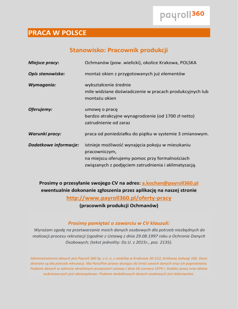 PRACA W POLSCE Stanowisko: Pracownik produkcji Miejsce pracy: Ochmanów (pow. wielicki), okolice Krakowa, POLSKA Opis stanowiska: montaż okien z przygotowanych już elementów Wymagania: wykształcenie średnie mile widziane doświadczenie w pracach produkcyjnych lub montażu okien Oferujemy: umowę o pracę bardzo atrakcyjne wynagrodzenie (od 1700 zł netto) zatrudnienie od zaraz Warunki pracy: praca od poniedziałku do piątku w systemie 3 zmianowym. Dodatkowe informacje: istnieje możliwość wynajęcia pokoju w mieszkaniu pracowniczym, na miejscu oferujemy pomoc przy formalnościach związanych z podjęciem zatrudnienia i aklimatyzacją. Prosimy o przesyłanie swojego CV na adres: [email protected] ewentualnie dokonanie zgłoszenia przez aplikację na naszej stronie http://www.payroll360.pl/oferty-pracy (pracownik produkcji Ochmanów) Prosimy pamiętać o zawarciu w CV klauzuli: Wyrażam zgodę na przetwarzanie moich danych osobowych dla potrzeb niezbędnych do realizacji procesu rekrutacji (zgodnie z Ustawą z dnia 29.08.1997 roku o Ochronie Danych Osobowych; (tekst jednolity: Dz.U. z 2015r., poz. 2135). Administratorem danych jest Payroll 360 Sp. z o. o. z siedzibą w Krakowie 30-212, Królowej Jadwigi 160. Dane zbierane są dla potrzeb rekrutacji. Ma Pani/Pan prawo dostępu do treści swoich danych oraz ich poprawiania. Podanie danych w zakresie określonym przepisami ustawy z dnia 26 czerwca 1974 r. Kodeks pracy oraz aktów wykonawczych jest obowiązkowe. Podanie dodatkowych danych osobowych jest dobrowolne.