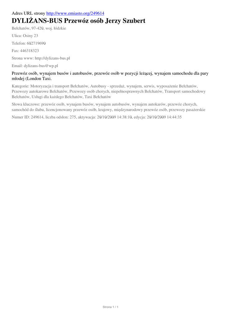 Adres URL strony http://www.emiasto.org/249614 DYLIŻANS-BUS Przewóz osób Jerzy Szubert Bełchatów, 97-420, woj. łódzkie Ulica: Osiny 23 Telefon: 602719690 Fax: 446318323 Strona www: http://dylizans-bus.pl Email: [email protected] Przewóz osób, wynajem busów i autobusów, przewóz osób w pozycji leżącej, wynajem samochodu dla pary młodej (London Taxi. Kategorie: Motoryzacja i transport Bełchatów, Autobusy - sprzedaż, wynajem, serwis, wyposażenie Bełchatów, Przewozy autokarowe Bełchatów, Przewozy osób chorych, niepełnosprawnych Bełchatów, Transport samochodowy Bełchatów, Usługi dla każdego Bełchatów, Taxi Bełchatów Słowa kluczowe: przewóz osób, wynajem busów, wynajem autobusów, wynajem autokarów, przewóz chorych, samochód do ślubu, licencjonowany przewóz osób, krajowy, międzynarodowy przewóz osób, przewozy pasażerskie Numer ID: 249614, liczba odsłon: 275, aktywacja: 20/10/2009 14:38:10, edycja: 20/10/2009 14:44:35 Strona 1 / 1