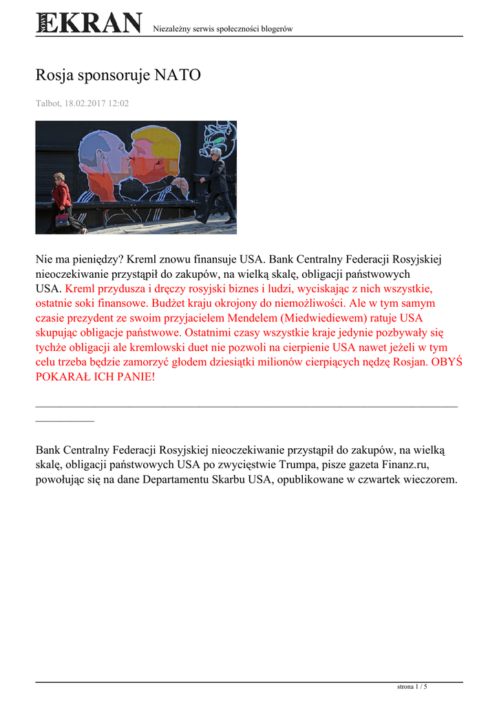 Niezależny serwis społeczności blogerów Rosja sponsoruje NATO Talbot, 18.02.2017 12:02 Nie ma pieniędzy? Kreml znowu finansuje USA. Bank Centralny Federacji Rosyjskiej nieoczekiwanie przystąpił do zakupów, na wielką skalę, obligacji państwowych USA. Kreml przydusza i dręczy rosyjski biznes i ludzi, wyciskając z nich wszystkie, ostatnie soki finansowe. Budżet kraju okrojony do niemożliwości. Ale w tym samym czasie prezydent ze swoim przyjacielem Mendelem (Miedwiediewem) ratuje USA skupując obligacje państwowe. Ostatnimi czasy wszystkie kraje jedynie pozbywały się tychże obligacji ale kremlowski duet nie pozwoli na cierpienie USA nawet jeżeli w tym celu trzeba będzie zamorzyć głodem dziesiątki milionów cierpiących nędzę Rosjan. OBYŚ POKARAŁ ICH PANIE! ———————————————————————————————————— ————— Bank Centralny Federacji Rosyjskiej nieoczekiwanie przystąpił do zakupów, na wielką skalę, obligacji państwowych USA po zwycięstwie Trumpa, pisze gazeta Finanz.ru, powołując się na dane Departamentu Skarbu USA, opublikowane w czwartek wieczorem. strona 1 / 5 Niezależny serwis społeczności blogerów W ciągu ostatnich dwóch miesięcy 2016 roku inwestycje Rosji w amerykański dług państwowy wzrosły o 15%, przy czym przez prawie cały ubiegły rok Moskwa planowo zmniejszała udział obligacji państwowych USA w swoim bilansie. W listopadzie, zaraz po wynikach głosowania w USA, Bank Centralny zakupił amerykańskie papiery wartościowe od razu na kwotę 12 miliardów dolarów co było największą jednorazową inwestycją przez cały okres czasu po spadku cen na ropę naftową. Poprzedzone to było zintensyfikowanym wyprowadzaniem rezerw z amerykańskich papierów wartościowych. Na początku roku zainwestowano w nie 92,1 miliarda dolarów albo 25% rezerw walut i złota, a w październiku 74,6 miliardów dolarów albo poniżej 19% rezerw walut i złota. Zakupy po przejęciu władzy przez Trumpa powiększyły ten wskaźnik do maksimum w ciągu pół roku, do 86,1 miliarda dolarów lub 22% rezerw walut i złota na koniec grudnia. Ostatni raz porównywalne inwestycje rosyjskiego Banku Centralnego w amerykańskie papiery wartościowe amerykańska statystyka odnotowała w sierpniu 2011 roku (na 11,8 miliarda dolarów) i w kwietniu 2010 roku (na 13,7 miliarda dolarów). Przy czym inne państwa-kredytodawcy USA, po zwycięstwie Trumpa wyprzedawały amerykańskie obligacje. Ogólnie rzecz biorąc w listopadzie Bank Centralny i fundusze strona 2 / 5 Niezależny serwis społeczności blogerów państwowe krajów śwata wyprowadziły z amerykańskiego długu 71 miliardów dolarów, rekordową kwotę od 1978 roku. Japonia, na przykład, sprzedała obligacji na kwotę 23,3 miliarda dolarów w listopadzie i na kwotę 17,8 miliarda dolarów w grudniu a ogólna kwota jej inwestycji spadła do minimum od początku 2012 roku, do 1,09 bilionów dolarów. Chiny wyprowadziły 57 miliardów dolarów w ciągu 2 miesięcy, redukując inwestycje do minimum w ciągu 6 lat, do 1,058 biliona dolarów. Spokojnie bracia! Oczyścimy ich wkrótce do białej kości! ———————————————————————————————————— —————– strona 3 / 5 Niezależny serwis społeczności blogerów A oto opinia prostych Rosjan o „ojczulku” narodu i genialnym strategu Wowanie. Za: http://3rm.info/main/66335-deneg-net-kreml-snova-finanasiruet-ssha-centrobank-rf... strona 4 / 5 Niezależny serwis społeczności blogerów Data publikacji: 17.02.2017 Nadesłał Borys http://wolna-polska.pl/wiadomosci/rosja-kreml-finansuje-usa-2017-02 strona 5 / 5 Powered by TCPDF (www.tcpdf.org)