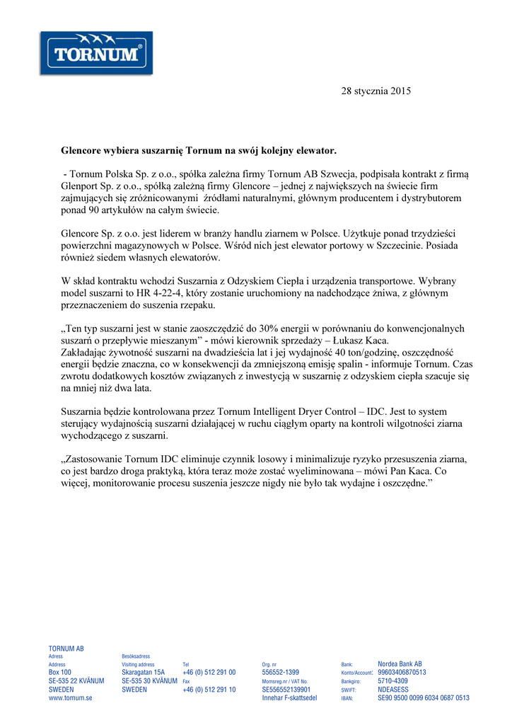 28 stycznia 2015 Glencore wybiera suszarnię Tornum na swój kolejny elewator. - Tornum Polska Sp. z o.o., spółka zależna firmy Tornum AB Szwecja, podpisała kontrakt z firmą Glenport Sp. z o.o., spółką zależną firmy Glencore – jednej z największych na świecie firm zajmujących się zróżnicowanymi źródłami naturalnymi, głównym producentem i dystrybutorem ponad 90 artykułów na całym świecie. Glencore Sp. z o.o. jest liderem w branży handlu ziarnem w Polsce. Użytkuje ponad trzydzieści powierzchni magazynowych w Polsce. Wśród nich jest elewator portowy w Szczecinie. Posiada również siedem własnych elewatorów. W skład kontraktu wchodzi Suszarnia z Odzyskiem Ciepła i urządzenia transportowe. Wybrany model suszarni to HR 4-22-4, który zostanie uruchomiony na nadchodzące żniwa, z głównym przeznaczeniem do suszenia rzepaku. „Ten typ suszarni jest w stanie zaoszczędzić do 30% energii w porównaniu do konwencjonalnych suszarń o przepływie mieszanym” - mówi kierownik sprzedaży – Łukasz Kaca. Zakładając żywotność suszarni na dwadzieścia lat i jej wydajność 40 ton/godzinę, oszczędność energii będzie znaczna, co w konsekwencji da zmniejszoną emisję spalin - informuje Tornum. Czas zwrotu dodatkowych kosztów związanych z inwestycją w suszarnię z odzyskiem ciepła szacuje się na mniej niż dwa lata. Suszarnia będzie kontrolowana przez Tornum Intelligent Dryer Control – IDC. Jest to system sterujący wydajnością suszarni działającej w ruchu ciągłym oparty na kontroli wilgotności ziarna wychodzącego z suszarni. „Zastosowanie Tornum IDC eliminuje czynnik losowy i minimalizuje ryzyko przesuszenia ziarna, co jest bardzo droga praktyką, która teraz może zostać wyeliminowana – mówi Pan Kaca. Co więcej, monitorowanie procesu suszenia jeszcze nigdy nie było tak wydajne i oszczędne.” TORNUM AB Adress Besöksadress Address Visiting address Box 100 SE-535 22 KVÄNUM SWEDEN www.tornum.se Skaragatan 15A +46 (0) 512 291 00 SE-535 30 KVÄNUM Fax SWEDEN +46 (0) 512 291 10 Tel Org. nr Bank: 556552-1399 Konto/Account: Momsreg.nr / VAT No. Bankgiro: SE556552139901 Innehar F-skattsedel SWIFT: IBAN: Nordea Bank AB 99603406870513 5710-4309 NDEASESS SE90 9500 0099 6034 0687 0513