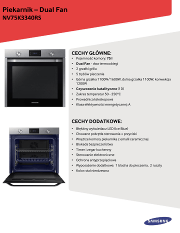 Piekarnik – Dual Fan NV75K3340RS CECHY GŁÓWNE: • • • • • • • • • Pojemność komory: 75 l Dual Fan - dwa termoobiegi 2 grzałki grilla 5 trybów pieczenia Górna grzałka 1100W/1600W, dolna grzałka 1100W, konwekcja 1200W Czyszczenie katalityczne (1D) Zakres temperatur 50 - 250°C Prowadnica teleskopowa Klasa efektywności energetycznej: A CECHY DODATKOWE: • • • • • • • • • Błękitny wyświetlacz LED (Ice Blue) Chowane pokrętła sterowania + przyciski Wnętrze komory piekarnika z emalii ceramicznej Blokada bezpieczeństwa Timer i zegar kuchenny Sterowanie elektroniczne Ochrona antyprzepięciowa Wyposażenie dodatkowe: 1 blacha do pieczenia, 2 ruszty Kolor: stal nierdzewna Piekarnik – Dual Fan NV75K3340RS DLACZEGO SAMSUNG JEST LEPSZY? • System Dual Fan to dwa niezależne wentylatory w środku piekarnika, które kręcąc się w przeciwnych kierunkach zapewniają idealną cyrkulację gorącego powietrza. Dzięki temu Twoje ulubione potrawy zostaną perfekcyjnie upieczone, a Twoi goście będą cieszyć się najwyższej jakości smakiem w każdym kęsie. Dodatkowo dzięki temu rozwiązaniu urządzenie dużo szybciej się nagrzewa, jak również szybciej wraca do żądanej temperatury po jego otwarciu, co znacząco wpływa na zwiększenie jego energooszczędności. • Piekarnik ten posiada aż 75 l pojemności co czyni go niezwykle pojemnym. Od teraz pieczenie nawet największych potraw bądź kilku potraw na kilku poziomach piekarnika nie powinno stanowić problemu. System Dual Fan • Intuicyjny panel sterowania umożliwia szybkie i wygodne programowanie INNE: • EAN: 8806088179308 • Wymiary (SxWxG): 595x595x566