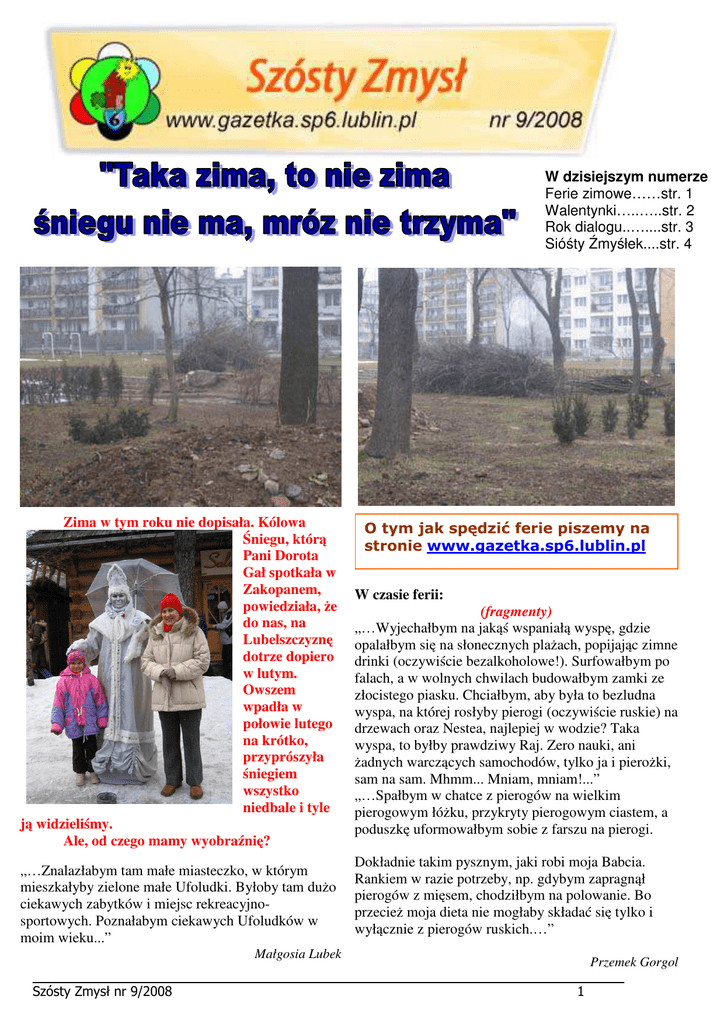 W dzisiejszym numerze: Ferie zimowe……str. 1 Walentynki…..…..str. 2 Rok dialogu..…....str. 3 Sióśty Źmyśłek....str. 4 Zima w tym roku nie dopisała. Kólowa Śniegu, którą Pani Dorota Gał spotkała w Zakopanem, powiedziała, że do nas, na Lubelszczyznę dotrze dopiero w lutym. Owszem wpadła w połowie lutego na krótko, przyprószyła śniegiem wszystko niedbale i tyle ją widzieliśmy. Ale, od czego mamy wyobraźnię? „…Znalazłabym tam małe miasteczko, w którym mieszkałyby zielone małe Ufoludki. Byłoby tam dużo ciekawych zabytków i miejsc rekreacyjnosportowych. Poznałabym ciekawych Ufoludków w moim wieku...” O tym jak spędzić ferie piszemy na stronie www.gazetka.sp6.lublin.pl W czasie ferii: (fragmenty) „…Wyjechałbym na jakąś wspaniałą wyspę, gdzie opalałbym się na słonecznych plażach, popijając zimne drinki (oczywiście bezalkoholowe!). Surfowałbym po falach, a w wolnych chwilach budowałbym zamki ze złocistego piasku. Chciałbym, aby była to bezludna wyspa, na której rosłyby pierogi (oczywiście ruskie) na drzewach oraz Nestea, najlepiej w wodzie? Taka wyspa, to byłby prawdziwy Raj. Zero nauki, ani żadnych warczących samochodów, tylko ja i pierożki, sam na sam. Mhmm... Mniam, mniam!...” „…Spałbym w chatce z pierogów na wielkim pierogowym łóżku, przykryty pierogowym ciastem, a poduszkę uformowałbym sobie z farszu na pierogi. Dokładnie takim pysznym, jaki robi moja Babcia. Rankiem w razie potrzeby, np. gdybym zapragnął pierogów z mięsem, chodziłbym na polowanie. Bo przecież moja dieta nie mogłaby składać się tylko i wyłącznie z pierogów ruskich.…” Małgosia Lubek Szósty Zmysł nr 9/2008 Przemek Gorgol 1 "Czy wszyscy chłopcy i wszystkie dziewczynki uwielbiają Walentynki?" 14 lutego obchodzili obchodziliśmy Walentynki. Wkrótce "8 Marca" znany jako "Dzień Kobiet". Co myślimy na temat takich dni? Postanowiliśmy o to zapytać koleżanki i kolegów zarówno z młodszych, jak i starszych klas, a także niektórych nauczycieli. Nasze redakcyjne koleżanki, Basia Klatka i Karolina Ładziak przeprowadziły "sondę korytarzową" wśród maluchów, uczniów III klasy, pani Agnieszki Chlebus, a także rozmawiały na temat Walentynek z panem Januszem Olechem. Oto, czego się dowiedziały: Red.: Jakie jest pańskie zdanie na temat takich dni, jak "Walentynki" i "Dzień Kobiet"? Janusz Olech: Uważam, że Walentynki to fajna zabawa. Podoba mi się taki dzień w roku, którzy mają zakochani. Red.: A czy Pan jest zakochany? J.O.: Oczywiście!!! Red.: A jaką "walentynkę" podarował Pan swojej ukochanej? J.O.: Pierścionek z brylantem w kształcie serca. Ha! Ha! Ha! Red.: …?!! A co myśli Pan na temat Dnia Kobiet? J. O.: Z tym jest trochę gorzej. W Walentynki adoruje się tylko jedną kobietę, natomiast 8 Marca wypadałoby wszystkim paniom wręczyć kwiaty. Ale dobrze, że tylko raz w roku. Red.: Dziękujemy za rozmowę. Red. Kasia Komorska: Czy mogłaby Pani podsumować naszą dyskusję na temat Walentynek? Pani Justyna Wójcik: Walentynki i Halloween są dla mnie zapożyczone z innych krajów. Nigdy polskie nie były i chyba nie będą. Ubolewam, że wypierają nasze polskie tradycje, np. strasznie zanikają Andrzejki.(…) No, ale przejdźmy do tematu. Podobały mi się szkolne Walentynki. (…) Jestem za tym, żeby wymyślić polskie Walentynki, żeby zrobić coś po swojemu, a nie ślepo naśladować bogatych sąsiadów z Zachodu. Przydałaby się jakaś nowość! Red.: Dziękujemy za rozmowę. Uczniowie z III klasy: Tomek Z.: Nie podoba mi się ten dzień, bo wtedy jest nudno. Błażej T.: Ja uważam, że ten dzień jest fajny. W tym roku dostałem aż 5 walentynek! Jaś M.: Chciałbym, żeby w tym dniu były zawody strzeleckie na boisku szkolnym. Kupiłbym strzałę, przebrałbym się za Amora i zdobywałbym serca dziewczyn. Kuba S.: Byłem rozczarowany, bo dostałem bardzo mało walentynek. Adrian Sz.: Ja myślę, że Walentynki to wymysł sprzedawców i sklepów, którzy w ten dzień mają większy utarg. Wiktor W.: Czy po to, żeby dostać czekoladę, muszą być jakieś Walentynki? Nudne to i głupie. Natalia S.: Walentynki to taki "czerwony dzień", a czerwony to kolor miłości. Ludzie mogą wyznać sobie uczucia. Wolę, żeby były Walentynki. Monika C.: Fajny dzień wysyłania sobie serduszek. Ja bym tego dnia ozdobiła całą szkołę serduszkami. Agnieszka M.: Ja bym cały świat ozdobiła serduszkami, serduszkami, serduszkami. Najlepiej jakby tego dnia było wolne i żeby szkoły były zamknięte, np. na znak, że nauczyciele też nas kochają. Szósty Zmysł nr 9/2008 2 R ok 2008 – R okiem D ialogu M ię i ę dzykulturow ego Czy wiecie, że obecny rok 2008 został ogłoszony „rokiem dialogu międzykulturowego”? To oznacza, że w tym roku wiele będzie się mówiło na temat wymiany między kulturami różnych krajów. Odbędzie się z pewnością wiele przedsięwzięć związanych z tym, aby poznawać inne kraje i ich kulturę. Jednym z takich przedsięwzięć jest z pewnością konkurs pt. „Poprzez turystykę poznajemy kulturę europejską”. Zachęcamy Was do zdobywania wiedzy na temat innych krajów, ich atrakcji turystycznych, zabytków, dzieł sztuki, historii, itp. Zachęcamy do przysyłania wspomnień z wakacji w różnych krajach europejskich, a także do przysyłania zdjęć. Zainteresowanych konkursem odsyłamy do pani Doroty Gał. ………… Fot. Maciej Mucha „Cudze poznajm y, lecz sw oje kochajm y” Młody Europejczyk, znający kulturę innych krajów, to najpierw dojrzały Polak, czyli ktoś, kto zna kulturę naszego kraju, ktoś, kto umie dostrzec piękno polskiego krajobrazu, poznaje polską historię, literaturę, sztukę. To ktoś, kto najpierw potrafi zauważyć piękno wokół siebie, np. piękno swojej szkoły. A czy Ty, Czytelniku „Szóstego Zmysłu” zauważyłeś, jaka piękna jest nasza szkoła? „Piękna nasza szkoła cała, kolorowa i wsp
