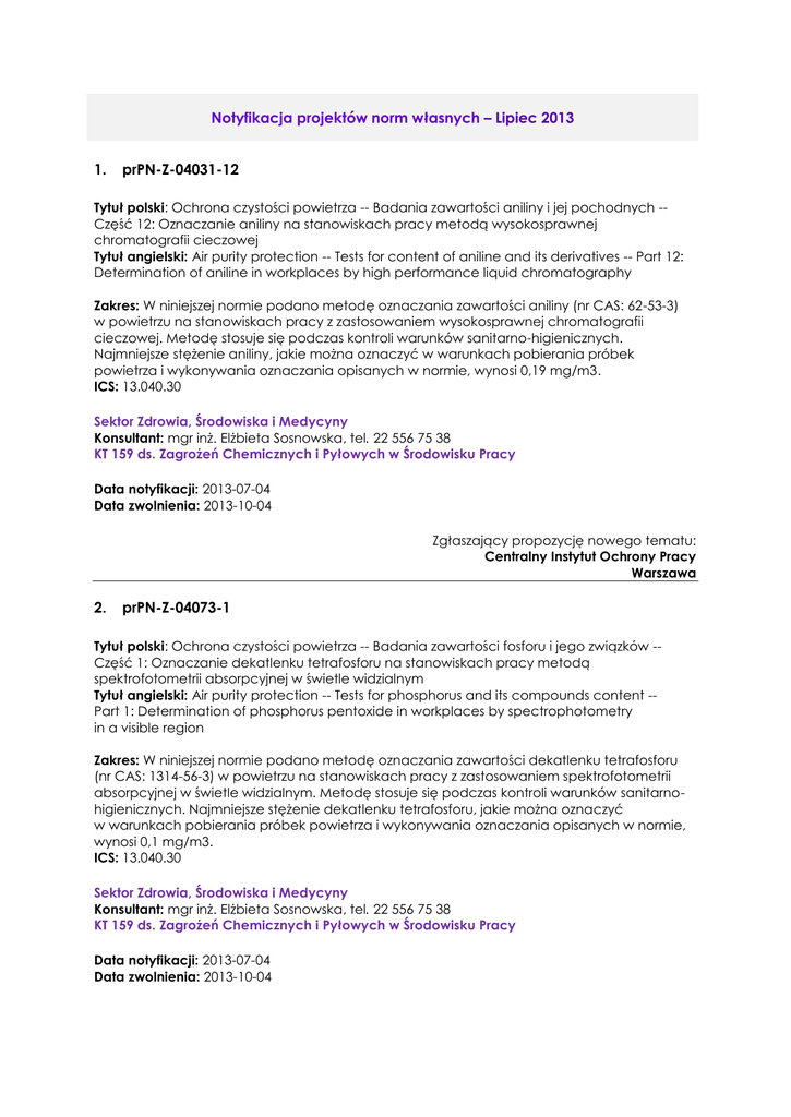 Notyfikacja projektów norm własnych – Lipiec 2013 1. prPN-Z-04031-12 Tytuł polski: Ochrona czystości powietrza -- Badania zawartości aniliny i jej pochodnych -Część 12: Oznaczanie aniliny na stanowiskach pracy metodą wysokosprawnej chromatografii cieczowej Tytuł angielski: Air purity protection -- Tests for content of aniline and its derivatives -- Part 12: Determination of aniline in workplaces by high performance liquid chromatography Zakres: W niniejszej normie podano metodę oznaczania zawartości aniliny (nr CAS: 62-53-3) w powietrzu na stanowiskach pracy z zastosowaniem wysokosprawnej chromatografii cieczowej. Metodę stosuje się podczas kontroli warunków sanitarno-higienicznych. Najmniejsze stężenie aniliny, jakie można oznaczyć w warunkach pobierania próbek powietrza i wykonywania oznaczania opisanych w normie, wynosi 0,19 mg/m3. ICS: 13.040.30 Sektor Zdrowia, Środowiska i Medycyny Konsultant: mgr inż. Elżbieta Sosnowska, tel. 22 556 75 38 KT 159 ds. Zagrożeń Chemicznych i Pyłowych w Środowisku Pracy Data notyfikacji: 2013-07-04 Data zwolnienia: 2013-10-04 Zgłaszający propozycję nowego tematu: Centralny Instytut Ochrony Pracy Warszawa 2. prPN-Z-04073-1 Tytuł polski: Ochrona czystości powietrza -- Badania zawartości fosforu i jego związków -Część 1: Oznaczanie dekatlenku tetrafosforu na stanowiskach pracy metodą spektrofotometrii absorpcyjnej w świetle widzialnym Tytuł angielski: Air purity protection -- Tests for phosphorus and its compounds content -Part 1: Determination of phosphorus pentoxide in workplaces by spectrophotometry in a visible region Zakres: W niniejszej normie podano metodę oznaczania zawartości dekatlenku tetrafosforu (nr CAS: 1314-56-3) w powietrzu na stanowiskach pracy z zastosowaniem spektrofotometrii absorpcyjnej w świetle widzialnym. Metodę stosuje się podczas kontroli warunków sanitarnohigienicznych. Najmniejsze stężenie dekatlenku tetrafosforu, jakie można oznaczyć w warunkach pobierania próbek powietrza i wykonywania oznaczania opisanych w normie, wynosi 0,1 mg/m3. ICS: 13.040.30 Sektor Zdrowia, Środowiska i Medycyny Konsultant: mgr inż. Elżbieta Sosnowska, tel. 22 556 75 38 KT 159 ds. Zagrożeń Chemicznych i Pyłowych w Środowisku Pracy Data notyfikacji: 2013-07-04 Data zwolnienia: 2013-10-04 Zgłaszający propozycję nowego tematu: Centralny Instytut Ochrony Pracy Warszawa 3. prPN-Z-04450 Tytuł polski: Ochrona czystości powietrza -- Oznaczanie chlorowodoru na stanowiskach pracy metodą turbidymetryczną z pobieraniem próbek na filtry Tytuł angielski: Air purity protection -- Determination of hydrogen chloride in workplaces by turbidimetry with sampling on filters Zakres: W niniejszej normie podano metodę oznaczania zawartości chlorowodoru (nr CAS: 7647- 01-0) w powietrzu na stanowiskach pracy z zastosowaniem metody turbidymetrycznej z pobieraniem próbek na filtry. Metodę stosuje się podczas kontroli warunków sanitarno-higienicznych. Najmniejsze stężenie chlorowodoru, jakie można oznaczyć w warunkach pobierania próbek powietrza i wykonywania oznaczania opisanych w normie, wynosi 0,5 mg/m3. ICS: 13.040.30 Sektor Zdrowia, Środowiska i Medycyny Konsultant: mgr inż. Elżbieta Sosnowska, tel. 22 556 75 38 KT 159 ds. Zagrożeń Chemicznych i Pyłowych w Środowisku Pracy Data notyfikacji: 2013-07-04 Data zwolnienia: 2013-10-04 Zgłaszający propozycję nowego tematu: Centralny Instytut Ochrony Pracy Warszawa 4. prPN-Z-04451 Tytuł polski: Ochrona czystości powietrza -- Oznaczanie diacetylu na stanowiskach pracy metodą wysokosprawnej chromatografii cieczowej Tytuł angielski: Air purity protection -- Determination of diacetyl in workplaces by high performance liquid chromatography Zakres: W niniejszej normie podano metodę oznaczania zawartości diacetylu (nr CAS: 431-03-8) w powietrzu na stanowiskach pracy z zastosowaniem wysokosprawnej chromatografii cieczowej. Metodę stosuje się podczas kontroli warunków sanitarnohigienicznych. Najmniejsze stężenie diacetylu, jakie można oznaczyć w warunkach pobierania próbek powietrza i wykonywania oznaczania opisanych w normie, wynosi 0,04 mg/m3. ICS: 13.040.30 Sektor Zdrowia, Środowiska i Medycyny Konsultant: mgr inż. Elżbieta Sosnowska, tel. 22 556 75 38 KT 159 ds. Zagrożeń Chemicznych i Pyłowych w Środowisku Pracy Data notyfikacji: 2013-07-04 Data zwolnienia: 2013-10-04 Zgłaszający propozycję nowego tematu: Centralny Instytut Ochrony Pracy Warszawa 5. prPN-Z-04452 Tytuł polski: Ochrona czystości powietrza -- Oznaczanie kwasu trichlorooctowego na stanowiskach pracy metodą wysokosprawnej chromatografii cieczowej Tytuł angielski: Air purity protection -- Determination of trichloroacetic acid in workplaces by high performance liquid chromatography Zakres: W niniejszej normie podano metodę oznaczania zawartości kwasu trichlorooctowego (nr CAS: 76-03-9) w powietrzu na stanowiskach pracy z zastosowaniem wysokosprawnej chromatografii cieczowej. Metodę stosuje się podczas kontroli warunków sanitarnohigienicznych. Najmniejsze stężenie kwasu trichlorooctowego, jakie można oznaczyć w warunkach pobierania próbek powietrza i wykonywania oznaczania opisanych w normie, wynosi 0,2 mg/m3. ICS: 13.040.30 Sektor Zdrowia, Środowiska i Medycyny Konsultant: mgr inż. Elżbieta Sosnowska, tel. 22 556 75 38 KT 159 ds. Zagrożeń Chemicznych i Pyłowych w Środowisku Pracy Data notyfikacji: 2013-07-04 Data zwolnienia: 2013-10-04 Zgłaszający propozycję nowego tematu: Centralny Instytut Ochrony Pracy Warszawa 6. prPN-Z-04453 Tytuł polski: Ochrona czystości powietrza -- Oznaczanie bezwodnika trimelitowego na stanowiskach pracy metodą wysokosprawnej chromatografii cieczowej Tytuł angielski: Air purity protection -- Determination of trimellitic anhydride in workplaces by high performance liquid chromatography Zakres: W niniejszej normie podano metodę oznaczania zawartości bezwodnika trimelitowego (nr CAS: 552-30-7) w powietrzu na stan