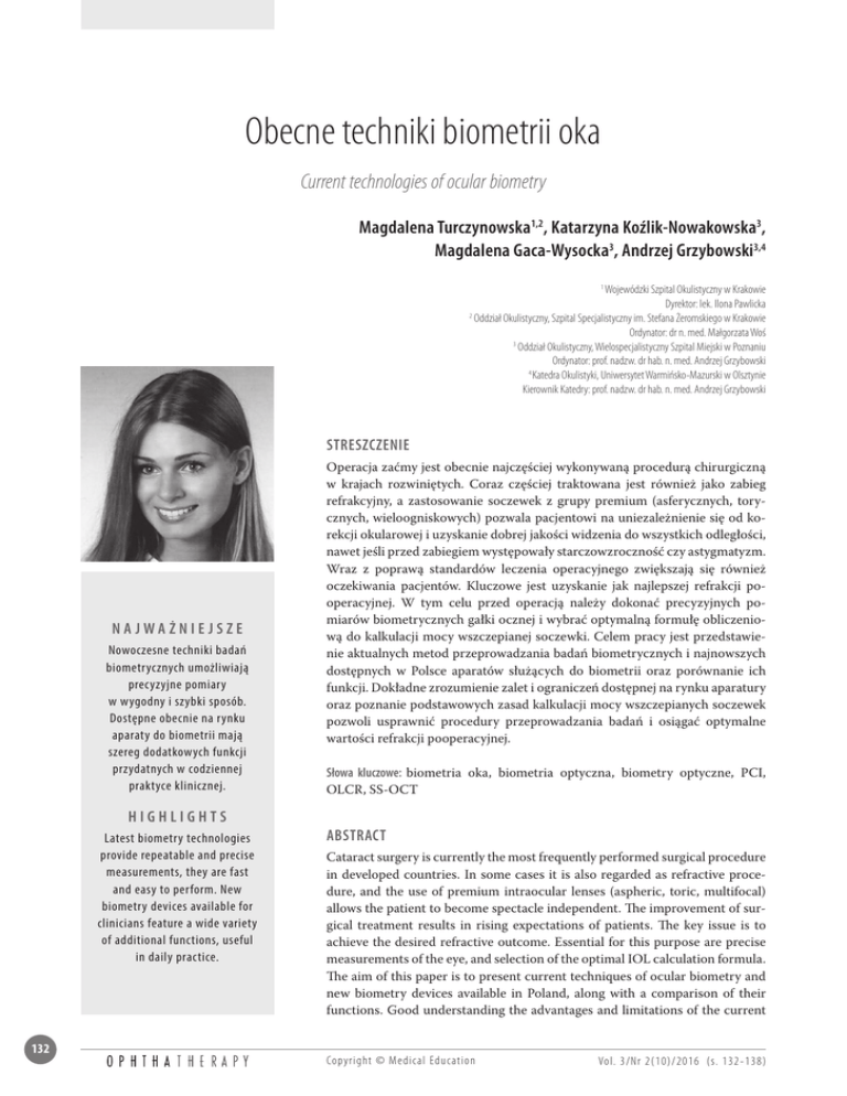 Obecne techniki biometrii oka Current technologies of ocular biometry Magdalena Turczynowska1,2, Katarzyna Koźlik-Nowakowska3, Magdalena Gaca-Wysocka3, Andrzej Grzybowski3,4 Wojewódzki Szpital Okulistyczny w Krakowie Dyrektor: lek. Ilona Pawlicka 2 Oddział Okulistyczny, Szpital Specjalistyczny im. Stefana Żeromskiego w Krakowie Ordynator: dr n. med. Małgorzata Woś 3 Oddział Okulistyczny, Wielospecjalistyczny Szpital Miejski w Poznaniu Ordynator: prof. nadzw. dr hab. n. med. Andrzej Grzybowski 4 Katedra Okulistyki, Uniwersytet Warmińsko-Mazurski w Olsztynie Kierownik Katedry: prof. nadzw. dr hab. n. med. Andrzej Grzybowski 1 Streszczenie Na jważniejsze Nowoczesne techniki badań biometrycznych umożliwiają precyzyjne pomiary w wygodny i szybki sposób. Dostępne obecnie na rynku aparaty do biometrii mają szereg dodatkowych funkcji przydatnych w codziennej praktyce klinicznej. Operacja zaćmy jest obecnie najczęściej wykonywaną procedurą chirurgiczną w krajach rozwiniętych. Coraz częściej traktowana jest również jako zabieg refrakcyjny, a zastosowanie soczewek z grupy premium (asferycznych, torycznych, wieloogniskowych) pozwala pacjentowi na uniezależnienie się od korekcji okularowej i uzyskanie dobrej jakości widzenia do wszystkich odległości, nawet jeśli przed zabiegiem występowały starczowzroczność czy astygmatyzm. Wraz z poprawą standardów leczenia operacyjnego zwiększają się również oczekiwania pacjentów. Kluczowe jest uzyskanie jak najlepszej refrakcji pooperacyjnej. W tym celu przed operacją należy dokonać precyzyjnych pomiarów biometrycznych gałki ocznej i wybrać optymalną formułę obliczeniową do kalkulacji mocy wszczepianej soczewki. Celem pracy jest przedstawienie aktualnych metod przeprowadzania badań biometrycznych i najnowszych dostępnych w Polsce aparatów służących do biometrii oraz porównanie ich funkcji. Dokładne zrozumienie zalet i ograniczeń dostępnej na rynku aparatury oraz poznanie podstawowych zasad kalkulacji mocy wszczepianych soczewek pozwoli usprawnić procedury przeprowadzania badań i osiągać optymalne wartości refrakcji pooperacyjnej. Słowa kluczowe: biometria oka, biometria optyczna, biometry optyczne, PCI, OLCR, SS-OCT Highlights Latest biometry technologies provide repeatable and precise measurements, they are fast and easy to perform. New biometry devices available for clinicians feature a wide variety of additional functions, useful in daily practice. 132 Abstract Cataract surgery is currently the most frequently performed surgical procedure in developed countries. In some cases it is also regarded as refractive procedure, and the use of premium intraocular lenses (aspheric, toric, multifocal) allows the patient to become spectacle independent. The improvement of surgical treatment results in rising expectations of patients. The key issue is to achieve the desired refractive outcome. Essential for this purpose are precise measurements of the eye, and selection of the optimal IOL calculation formula. The aim of this paper is to present current techniques of ocular biometry and new biometry devices available in Poland, along with a comparison of their functions. Good understanding the advantages and limitations of the current Co py rig ht © Medical Educatio n Vo l. 3/Nr 2(10)/2016 (s. 132-138) Obecne techniki biometrii oka M. Turczynowska, K. Koźlik-Nowakowska, M. Gaca-Wysocka, A. Grzybowski technology allows to perform measurements efficiently and to achieve highly accurate refractive outcomes. Key words: ocular biometry, optical biometry, optical biometry devices, PCI, OLCR, SS-OCT WSTĘP Od momentu wprowadzenia przez Kelmana procedury fakoemulsyfikacji zaćmy zarówno w metodzie operacyjnej, jak i w konstrukcji wszczepianych soczewek dokonał się ogromny postęp. Zastosowanie nowych technologii i opracowanie zwijalnych soczewek wewnątrzgałkowych umożliwiło wykonywanie operacji poprzez mikrocięcie, co znacznie skróciło czas rekonwalescencji po zabiegu, zmniejszyło częstość powikłań, a także pozwoliło wyeliminować problem astygmatyzmu jatrogennego związany w przeszłości ze stosowaniem szwów [1, 2]. Usunięcie zaćmy jest obecnie nie tylko procedurą leczniczą, ale również coraz częściej zabiegiem refrakcyjnym, a zastosowanie soczewek z grupy premium (asferycznych, torycznych, wieloogniskowych) pozwala pacjentowi na uniezależnienie się od korekcji okularowej i uzyskanie dobrej jakości widzenia do wszystkich odległości, nawet jeśli przed zabiegiem występowały starczowzroczność czy astygmatyzm. Wraz z poprawą standardów leczenia operacyjnego wzrosły również oczekiwania pacjentów, a kluczowe stało się uzyskanie jak najlepszej refrakcji pooperacyjnej. Dlatego też wyjątkowo istotnym etapem całej procedury jest dokładne obliczenie właściwej mocy wszczepianej soczewki wewnątrzgałkowej. W tym celu poza wyborem odpowiedniej formuły obliczeniowej należy dokonać precyzyjnych pomiarów biometrycznych. Biometria pozwala obliczyć wymiary anatomicznych struktur oka, w tym długości gałki ocznej (AL, axial length), głębokości komory przedniej (ACD, anterior chamber depth) oraz grubości soczewki (LT, lens thickness). Wartości te wraz z wynikiem pomiaru keratometrycznego są niezwykle istotne w obliczeniach mocy wszczepianej soczewki. Zmiana wartości długości gałki ocznej lub promienia krzywizny rogówki o 0,3 mm powoduje zmianę mocy wszczepu o 1 D [3]. CEL PRACY Celem pracy jest przedstawienie najnowszych dostępnych w Polsce aparatów służących do wykonywania biometrii gałki ocznej oraz porównanie ich funkcji. RODZAJE TECHNIK POMIARÓW BIOMETRYCZNYCH GAŁKI OCZNEJ Do określenia długości gałki ocznej oraz wymiarów poszczególnych jej struktur służy biometria. Badanie bio- metryczne można przeprowadzić metodą ultradźwiękową (kontaktową bądź immersyjną) lub optyczną. Do niedawna największą popularnością cieszyła się bi