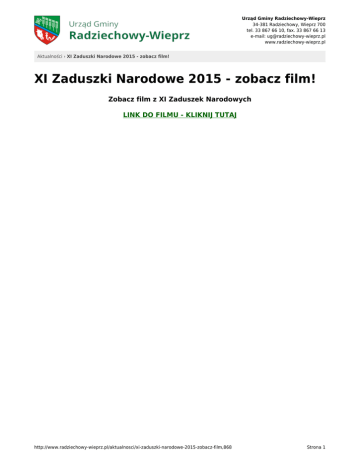 Urząd Gminy Radziechowy-Wieprz 34-381 Radziechowy, Wieprz 700 tel. 33 867 66 10, fax. 33 867 66 13 e-mail: [email protected] www.radziechowy-wieprz.pl Aktualności › XI Zaduszki Narodowe 2015 - zobacz film! XI Zaduszki Narodowe 2015 - zobacz film! Zobacz film z XI Zaduszek Narodowych LINK DO FILMU - KLIKNIJ TUTAJ http://www.radziechowy-wieprz.pl/aktualnosci/xi-zaduszki-narodowe-2015-zobacz-film,868 Strona 1