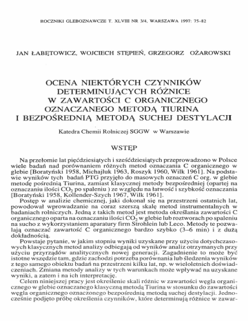 ROCZNIKI GLEBOZNAWCZE T. XLVIII NR 3/4, WARSZAWA 1997: 7 5-82 JAN ŁABĘTOWICZ, WOJCIECH STĘPIEŃ, GRZEGORZ OŻAROWSKI OCENA NIEKTÓRYCH CZYNNIKÓW DETERMINUJĄCYCH RÓŻNICE W ZAWARTOŚCI С ORGANICZNEGO OZNACZANEGO METODĄ TIURINA I BEZPOŚREDNIĄ METODĄ SUCHEJ DESTYLACJI Katedra Chemii Rolniczej SGGW w Warszawie WSTĘP Na przełomie lat pięćdziesiątych i sześćdziesiątych przeprowadzono w Polsce wiele badań nad porównaniem różnych metod oznaczania С organicznego w glebie [Boratyński 1958, Michajluk 1963, Roszyk 1960, Wilk 1961]. Na podsta wie wyników tych badań PTG przyjęło do masowych oznaczeń С org. w glebie metodę pośrednią Tiurina, zamiast klasycznej metody bezpośredniej (opartej na oznaczaniu ilości C 0 2 po spaleniu ) ze względu na łatwość i szybkość oznaczania [Boratyński 1958, Kollender-Szych 1967, Wilk 1961]. Postęp w analizie chemicznej, jaki dokonał się na przestrzeni ostatnich lat, powodował wprowadzanie na coraz szerszą skalę metod instrumentalnych w badaniach rolniczych. Jedną z takich metod jest metoda określania zawartości С organicznego oparta na oznaczaniu ilości C 0 2 w glebie lub roztworach po spaleniu na sucho z wykorzystaniem aparatury firm Strohlein lub Leco. Metody te pozwa lają oznaczać zawartość С organicznego bardzo szybko (3-6 min) i z dużą dokładnością. Powstaje pytanie, w jakim stopniu wyniki uzyskane przy użyciu dotychczaso wych klasycznych metod analizy odbiegają od wyników analiz otrzymanych przy użyciu przyrządów analitycznych nowej generacji. Zagadnienie to może być istotne wszędzie tam, gdzie zachodzi potrzeba porównania lub śledzenia wyników z tego samego obiektu badań na przestrzeni kilku lat, np. w wieloletnich doświad czeniach. Zmiana metody analizy w tych warunkach może wpływać na uzyskane wyniki, a zatem i na ich interpretację. Celem niniejszej pracy jest określenie skali różnic w zawartości węgla organi cznego w glebie oznaczanego klasyczną metodą Tiurina w stosunku do zawartości węgla organicznego oznaczonego bezpośrednią metodą suchej destylacji. Jedno cześnie podjęto próbę określenia czynników, które determinują różnice w zawar 76 J. Łabętowicz, W. Stępień , G. Ożarowski tości С uzyskane przy użyciu tych metod. MATERIAŁ I METODY Porównanie metod przeprowadzono na podstawie 50 próbek z poziomu A gleb losowo pobranych z obszaru kraju. W glebach tych oznaczono: - zawartość С organicznego metodą Tiurina oraz metodą bezpośrednią suchej destylacji przy użyciu aparatu C-Mat 5500 firmy Strohlein, - odczyn w 1 M KC1, - skład granulometryczny metodą Casagrande w modyfikacji Prószyńskiego, - zawartość aktywnych form Fe i Mn w roztworze glebowym [Łabętowicz 1995]. Charakterystykę właściwości fizykochemicznych gleb wziętych do badań przedstawiono w tabeli 1 . OMÓWIENIE WYNIKÓW Zawartość węgla organicznego oznaczona metodami Tiurina i suchej destylacji w 50 próbkach glebowych była zróżnicowana. Przeprowadzona analiza statysty czna wykazała, że różnice te zależą istotnie od poziomu С organicznego w glebie, od zawartości części spławialnych oraz zawartości aktywnych form żelaza i manganu w glebie. Zawartość węgla organicznego w glebie. Analiza uzyskanych wyników wykazała, że największa zgodność między obu porównywanymi metodami wy stępowała przy zawartości С org. około 1,5% (rys. 1). Zarówno przy niższych, jak i przy wyższych ilościach węgla wzrastały różnice w jego zawartości oznaczanej obu metodami. Dla najniższej zawartości С org. w badanych próbach gleb (0.5%) bezwzględna różnica między obu metodami wynosiła ok. 14%, a dla najwyższych Bezwzględna różnica w zawartości C l - C2 l% | T he absolute difference content of C1-C2 | % | R Y S U N E K 1. W spółzależność m iędzy zaw artością С organicznego a bezw zględną różnicą w za w artości С organicznego oznaczonego m etodam i: T iurina (C l) i m etodą suchej destylacji (C2) F IG U R E 1. T he relation betw een the С organic content and the absolute difference in the С o rg a nic content by T iu rin ’s m ethod (C l) and dry distillation m ethod (C2) Czynniki determinujące różnice^ w zawartości С org. 77 zawartości С (2.5%) około 20%. Analiza danych na rysunku 1 pozwala stwierdzić, że dla przedziału zawartości węgla 0 ,7 5 - 2 ,0 % bezwzględna różnica między wynikami uzyskanymi obu metodami kształtowała się na poziomie poniżej 1 0 %, co można uznać za różnicę dopuszczalną. W tym przedziale mieści się 75% badanych prób glebowych (tab. 1 ). Zawartość części spławialnych. Największa zgodność w zawartości С org. oznaczonego obu metodami występowała przy zawartości części spławialnych w glebie w granicach 25-35% (rys. 2). Zarówno wzrost ilości części spławialnych powyżej 35%, jak i ich spadek poniżej 25% powodowały zwiększenie różnic w zawartości węgla oznaczanego obu metodami. Różnica w zawartości С org. oznaczanej obu metodami była niższa niż 1 0 % dla przedziału zawartości części spławialnych w glebie wynoszącego 15-50%. W tym zakresie mieści się 72% badanych gleb. Zawartość aktywnych form Fe i Mn oraz pH gleby. Przy stężeniu aktywnych form Fe i Mn w glebie odpowiednio 1,5 i 2,0 mg/dm 3 obie metody wykazywały tę samą zawartość С organicznego. Zarówno wzrost, jak i spadek stężenia Fe i Mn powodowały zwiększenie różnic w zawartości węgla organicznego określanego obiema metodami (rys. 3). Przy maksymalnym stężeniu Fe i Mn w analizowanych próbkach gleby (ok. 5 mg/dm3) oraz maksymalnej zawartości węgla i części spławialnych ilość С organicznego oznaczona metodą Tiurina była wyższa o 16-22% niż ilość С organicznego oznaczona metodą suchej destylacji. Przy minimalnym stężeniu Fe i Mn (ok. 0,5 mg/dm3) metoda Tiurina wykazywała niższe zawartości С w glebie w stosunku do metody suchej destylacji o oko