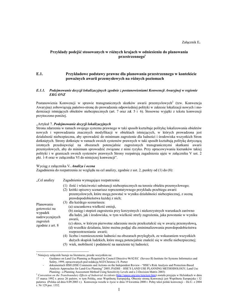 Załącznik E. Przykłady podejść stosowanych w różnych krajach w odniesieniu do planowania przestrzennego1 E.1. E.1.1. Przykładowe podstawy prawne dla planowania przestrzennego w kontekście poważnych awarii przemysłowych na różnych poziomach Podejmowanie decyzji lokalizacyjnych zgodnie z postanowieniami Konwencji Awaryjnej w regionie EKG ONZ Postanowienia Konwencji w sprawie transgranicznych skutków awarii przemys łowych2 (tzw. Konwencja Awaryjna) zobowiązują państwo-stronę do prowadzenia odpowiedniej polityki w zakresie lokalizacji nowych i modernizacji istniejących obiektów niebezpiecznych (art. 7 oraz zał. 5 i 6). Stosowne wyjątki z tekstu konwencji przytoczono poniżej. „Artykuł 7. Podejmowanie decyzji lokalizacyjnych Strona zdarzenia w ramach swojego systemu prawnego w taki sposób kształtuje politykę lokalizowania obiektów nowych i wprowadzania znacznych modyfikacji w obiektach istniejących, w których prowadzona jest działalność niebezpieczna, aby sprowadzić do minimum zagrożenie dla ludności i środowiska wszystkich Stron dotkniętych. Strony dotknięte w ramach swoich systemów prawnych w taki sposób kształtują politykę dotyczącą istotnych przedsięwzięć na obszarach potencjalnie zagrożonych transgranicznymi skutkami awarii przemysłowych, aby do minimum sprowadzić związane z nimi ryzyko. Przy opracowywaniu kierunków takiej polityki i w granicach swoich systemów prawnych Strony rozpatrują zagadnienia ujęte w załączniku V ust. 2 pkt. 1-8 oraz w załączniku VI do niniejszej konwencji”. Wyciąg z załącznika V. Analiza i ocena Zagadnienia do rozpatrzenia ze względu na cel analizy, zgodnie z ust. 2, punkty od (1) do (8): „Cel analizy Zagadnienia wymagające rozpatrzenia: (1) ilość i właściwości substancji niebezpiecznych na terenie obiektu przemysłowego; (2) krótki opisowy scenariusz reprezentatywnego przykładu przebiegu awarii przemysłowych, które mogą powstać w wyniku działalności niebezpiecznej, z oceną prawdopodobieństwa każdej z nich; (3) dla każdego scenariusza: Planowanie (a) szacunkowa wielkość emisji, gotowości na (b) zasięg i stopień zagrożenia przy korzystnych i niekorzystnych warunkach zarówno wypadek dla ludzi, jak i środowiska, w tym wielkość strefy zagrożenia, jaka powstanie w wyniku nadzwyczajnych awarii, zagrożeń (c) okres, w którym pierwotne zdarzenie może przekształcić się w awarię przemysłową, zgodnie z art. 8 (d) wszelkie działania, które można podjąć dla zminimalizowania prawdopodobieństwa rozprzestrzeniania awarii; (4) liczba i rozmieszczenie ludności na obszarach przyległych, ze wskazaniem wszystkich dużych skupisk ludzkich, które mogą potencjalnie znaleźć się w strefie niebezpiecznej; (5) wiek, mobilność i podatność na narażenie tej ludności; 1 Niniejszy załącznik bazuje na literaturze, przede wszystkim na: Guidance on Land Use Planning as Required by Council Directive 96/82/EC (Seveso II) Institute for Systems Informatics and Safety, 1999, opracowanych pod redakcją M.D Christou i S. Porter dokumentach HSH (HSE Comments and Actions on the Independent Review - “HSE’s Risk Analysis and Protection-Based Analysis Approaches for Land-Use Planning” 2005; PADHI – HSE’S LAND USE PLANNING METHODOLOGY; Land Use Planning - a Planning Assessment Method Using Sensitivity Levels and a 2-Decision Matrix 2003) 2 Convention on the Transboundary Effects of Industrial Accidents (http://unece.org/env/teia/text.htm) została przyjęta w Helsinkach w dniu 17 marca 1992 r. przez 26 państw, w tym Polskę, oraz Wspólnotę Europejską. Obecnie stroną Konwencji jest Wspólnota Europejska i 32 państwa (Polska od dnia 8.09.2003 r.). Konwencja weszła w życie w dniu 19 kwietnia 2000 r. Pełny tekst polski konwencji – Dz.U. z 2004 r. Nr 129 poz. 1352. 1 oprócz zagadnień wymienionych w pkt (1)-(5) także: (6) rozmiar szkody poniesionej przez ludzi i środowisko w zależności od charakteru i okoliczności emisji; (7) odległość od miejsca prowadzenia niebezpiecznej działalności, dla której istnieje realne prawdopodobieństwo szkodliwego oddziaływania na ludzi i środowisko w przypadku awarii przemysłowej; (8) te same informacje nie tylko dla sytuacji obecnej, lecz również dla zdarzeń planowanych lub możliwych do przewidzenia w przyszłości.” Podejmowanie decyzji lokalizacyjnej zgodnie z art. 7 „Załącznik VI. Podejmowanie decyzji lokalizacyjnych Zagadnienia, które powinny być rozpatrywane zgodnie z art. 7 niniejszej konwencji: 1. Wyniki analizy i oceny ryzyka, w tym zgodnie z załącznikiem V, oceny cech fizycznych obszaru, na którym planuje się prowadzić niebezpieczną działalność. 2. Wyniki konsultacji i udział społeczeństwa. 3. Analiza wzrostu lub zmniejszenia ryzyka wywołanego jakimkolwiek zdarzeniem na terytorium Strony dotkniętej w związku z prowadzoną działalnością niebezpieczną na terytorium Strony zdarzenia. 4. Ocena niebezpieczeństw dla środowiska, w tym wszelkich skutków transgranicznych. 5. Ocena nowych rodzajów działalności niebezpiecznej, które mogłyby być źródłem ryzyka. 6. Kwestia lokalizacji nowych i istotnych modyfikacji już prowadzonych działalności niebezpiecznych w odległości bezpiecznej od istniejących skupisk ludzkich, a także utworzenia stref bezpieczeństwa wokół obiektów, w których prowadzi się działalność niebezpieczną; na tych obszarach należy uważnie analizować przedsięwzięcia, które mogą prowadzić do wzrostu liczby zagrożonej ludności lub w inny sposób zwiększają stopień ryzyka.” E.1.2. Planowanie przestrzenne na poziomie Wspólnoty w kontekście wymagań Dyrektywy Seveso II Przepisy wspólnotowe zobowiązują, aby w planach zagospodarowania przestrzennego uwzględniano aspekty zapobiegania i łagodzenia skutków poważnych awarii (tj. wprowadzenie procedur konsultacyjnych, zapewnienie bezpiecznych odległości i podejmowanie działań ukierunko