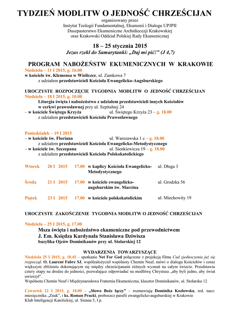 TYDZIEŃ MODLITW O JEDNOŚĆ CHRZEŚCIJAN organizowany przez Instytut Teologii Fundamentalnej, Ekumenii i Dialogu UPJPII Duszpasterstwo Ekumeniczne Archidiecezji Krakowskiej oraz Krakowski Oddział Polskiej Rady Ekumenicznej 18 – 25 stycznia 2015 Jezus rzekł do Samarytanki: „Daj mi pić!” (J 4,7) PROGRAM NABOŻEŃSTW EKUMENICZNYCH W KRAKOWIE Niedziela – 11 I 2015, g. 16.00 w kościele św. Klemensa w Wieliczce, ul. Zamkowa 7 z udziałem przedstawicieli Kościoła Ewangelicko-Augsburskiego UROCZYSTE ROZPOCZĘCIE TYGODNIA MODLITW O JEDNOŚĆ CHRZEŚCIJAN Niedziela – 18 I 2015, g. 10.00 Liturgia święta i nabożeństwo z udziałem przedstawicieli innych Kościołów w cerkwi prawosławnej przy ul. Szpitalnej 24 – w kościele Świętego Krzyża ul. Świętego Krzyża 23 – g. 18.00 z udziałem przedstawicieli Kościoła Prawosławnego Poniedziałek – 19 I 2015 – w kościele św. Floriana ul. Warszawska 1 c – g. 18.00 z udziałem przedstawicieli Kościoła Ewangelicko-Metodystycznego – w kościele św. Szczepana ul. Sienkiewicza 19 – g. 18.00 z udziałem przedstawicieli Kościoła Polskokatolickiego Wtorek 20 I 2015 17.00 w kaplicy Kościoła EwangelickoMetodystycznego ul. Długa 3 Środa 21 I 2015 17.00 w kościele ewangelickoaugsburskim św. Marcina ul. Grodzka 56 Piątek 23 I 2015 17.00 w kościele polskokatolickim ul. Miechowity 19 UROCZYSTE ZAKOŃCZENIE TYGODNIA MODLITW O JEDNOŚĆ CHRZEŚCIJAN Niedziela – 25 I 2015, g. 17.00 Msza święta i nabożeństwo ekumeniczne pod przewodnictwem J. Em. Księdza Kardynała Stanisława Dziwisza bazylika Ojców Dominikanów przy ul. Stolarskiej 12 WYDARZENIA TOWARZYSZĄCE Niedziela 25 I 2015, g. 18.45 – spotkanie Net For God połączone z projekcją filmu Cud zjednoczenia już się rozpoczął. O. Laurent Fabre SJ, współzałożyciel wspólnoty Chemin Neuf, mówi o dialogu Kościołów i coraz większym zbliżeniu dokonującym się między chrześcijanami różnych wyznań na całym świecie. Przedstawia cztery etapy na drodze do jedności, pozwalające odpowiadać na modlitwę Chrystusa „aby byli jedno, aby świat uwierzył”. Wspólnota Chemin Neuf i Międzynarodowa Fraternia Ekumeniczna, klasztor Dominikanów, ul. Stolarska 12 Czwartek 22 I 2015, g. 18.00 – „Słowo Boże łączy” – rozmawiają Dominika Kozłowska, red. nacz. miesięcznika „Znak”, i ks. Roman Pracki, proboszcz parafii ewangelicko-augsburskiej w Krakowie Klub Inteligencji Katolickiej, ul. Sienna 5, I p.