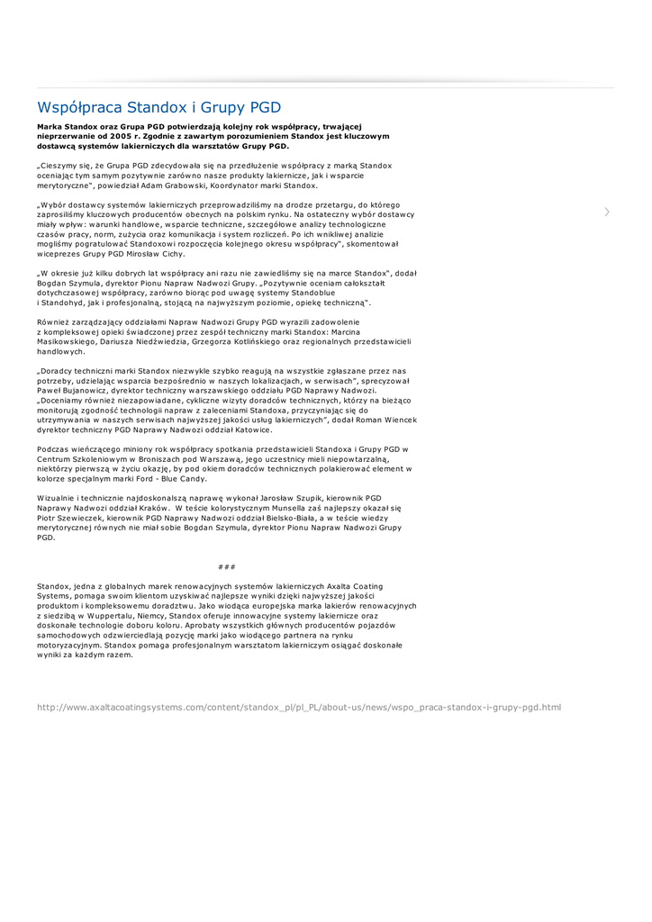 Współpraca Standox i Grupy PGD Marka Standox oraz Grupa PGD potwierdzają kolejny rok współpracy, trwającej nieprzerwanie od 2005 r. Zgodnie z zawartym porozumieniem Standox jest kluczowym dostawcą systemów lakierniczych dla warsztatów Grupy PGD. „Cieszymy się, że Grupa PGD zdecydow ała się na przedłużenie w spółpracy z marką Standox oceniając tym samym pozytyw nie zarów no nasze produkty lakiernicze, jak i w sparcie merytoryczne“, pow iedział Adam Grabow ski, Koordynator marki Standox. „W ybór dostaw cy systemów lakierniczych przeprow adziliśmy na drodze przetargu, do którego zaprosiliśmy kluczow ych producentów obecnych na polskim rynku. Na ostateczny w ybór dostaw cy miały w pływ : w arunki handlow e, w sparcie techniczne, szczegółow e analizy technologiczne czasów pracy, norm, zużycia oraz komunikacja i system rozliczeń. Po ich w nikliw ej analizie mogliśmy pogratulow ać Standoxow i rozpoczęcia kolejnego okresu w spółpracy“, skomentow ał w iceprezes Grupy PGD Mirosław Cichy. „W okresie już kilku dobrych lat w spółpracy ani razu nie zaw iedliśmy się na marce Standox“, dodał Bogdan Szymula, dyrektor Pionu Napraw Nadw ozi Grupy. „Pozytyw nie oceniam całokształt dotychczasow ej w spółpracy, zarów no biorąc pod uw agę systemy Standoblue i Standohyd, jak i profesjonalną, stojącą na najw yższym poziomie, opiekę techniczną“. Rów nież zarządzający oddziałami Napraw Nadw ozi Grupy PGD w yrazili zadow olenie z kompleksow ej opieki św iadczonej przez zespół techniczny marki Standox: Marcina Masikow skiego, Dariusza Niedźw iedzia, Grzegorza Kotlińskiego oraz regionalnych przedstaw icieli handlow ych. „Doradcy techniczni marki Standox niezw ykle szybko reagują na w szystkie zgłaszane przez nas potrzeby, udzielając w sparcia bezpośrednio w naszych lokalizacjach, w serw isach”, sprecyzow ał Paw eł Bujanow icz, dyrektor techniczny w arszaw skiego oddziału PGD Napraw y Nadw ozi. „Doceniamy rów nież niezapow iadane, cykliczne w izyty doradców technicznych, którzy na bieżąco monitorują zgodność technologii napraw z zaleceniami Standoxa, przyczyniając się do utrzymyw ania w naszych serw isach najw yższej jakości usług lakierniczych”, dodał Roman W iencek dyrektor techniczny PGD Napraw y Nadw ozi oddział Katow ice. Podczas w ieńczącego miniony rok w spółpracy spotkania przedstaw icieli Standoxa i Grupy PGD w Centrum Szkoleniow ym w Broniszach pod W arszaw ą, jego uczestnicy mieli niepow tarzalną, niektórzy pierw szą w życiu okazję, by pod okiem doradców technicznych polakierow ać element w kolorze specjalnym marki Ford - Blue Candy. W izualnie i technicznie najdoskonalszą napraw ę w ykonał Jarosław Szupik, kierow nik PGD Napraw y Nadw ozi oddział Kraków . W teście kolorystycznym Munsella zaś najlepszy okazał się Piotr Szew ieczek, kierow nik PGD Napraw y Nadw ozi oddział Bielsko-Biała, a w teście w iedzy merytorycznej rów nych nie miał sobie Bogdan Szymula, dyrektor Pionu Napraw Nadw ozi Grupy PGD. ### Standox, jedna z globalnych marek renow acyjnych systemów lakierniczych Axalta Coating Systems, pomaga sw oim klientom uzyskiw ać najlepsze w yniki dzięki najw yższej jakości produktom i kompleksow emu doradztw u. Jako w iodąca europejska marka lakierów renow acyjnych z siedzibą w W uppertalu, Niemcy, Standox oferuje innow acyjne systemy lakiernicze oraz doskonałe technologie doboru koloru. Aprobaty w szystkich głów nych producentów pojazdów samochodow ych odzw ierciedlają pozycję marki jako w iodącego partnera na rynku motoryzacyjnym. Standox pomaga profesjonalnym w arsztatom lakierniczym osiągać doskonałe w yniki za każdym razem. http://www.axaltacoatingsystems.com/content/standox_pl/pl_PL/about-us/news/wspo_praca-standox-i-grupy-pgd.html