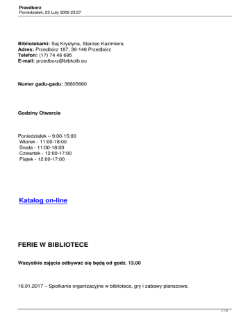 Przedbórz Poniedziałek, 23 Luty 2009 23:27 Bibliotekarki: Saj Krystyna, Starzec Kazimiera Adres: Przedbórz 187, 36-146 Przedbórz Telefon: (17) 74 46 695 E-mail: [email protected] Numer gadu-gadu: 38805660 Godziny Otwarcia Poniedziałek – 9:00-15:00 Wtorek - 11:00-18:00 Środa - 11:00-18:00 Czwartek - 12:00-17:00 Piątek - 12:00-17:00 Katalog on-line FERIE W BIBLIOTECE Wszystkie zajęcia odbywać się będą od godz. 13.00 16.01.2017 – Spotkanie organizacyjne w bibliotece, gry i zabawy planszowe. 1/2 Przedbórz Poniedziałek, 23 Luty 2009 23:27 17.01.2017 – Spotkanie DKK 18.01.2017- „Dzień Kubusia Puchatka” – zajęcia literacko –plastyczne. 19.01.2017 – Zajęcia plastyczne „Polarne misie” 20.01.2017- Laurka dla babci i dziadka – zajęcia plastyczne. 23.01.2017 – Literowy zawrót głowy – zabawy i zagadki z alfabetem, gimnastyka dla języka, kalambury ze świata bajki. 24.01.2017 – Wspólne czytanie bajek i wierszy o zimie. 26.01.2017 - Wybieramy się na bal” - poznawanie zwyczajów i zabaw karnawałowych. Projektowanie strojów i maski karnawałowej, wspólne dekorowanie sali na bal. 28.01.2017 - Bal karnawałowy dla dzieci na zakończenie ferii w bibliotece. 2/2