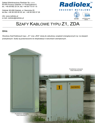 Zakład Wielobranżowy Radiolex Sp. z o.o. 83-000 Pruszcz Gdański, ul. Przemysłowa 8 tel.: +48 58 682 20 34, fax: +48 58 773 01 15 Oddział: 80-958 Gdańsk, ul. Siennicka 25 tel./fax: +48 58 305 65 00, tel.: +48 58 305 57 26 info: www.radiolex.pl e-mail: [email protected] ISO 9001 Akredytacja PCA AC 014 SZAFY KABLOWE TYPU Z1, ZDA OPIS: Obudowy Szaf Kablowych typu „Z1” oraz „ZDA” służą do zabudowy urządzeń energetycznych np: na stacjach przesyłowych. Szafy są przeznaczone do eksploatacji w warunkach zewnętrznych. Przykładowe wykonanie Szafy kablowej ZDA Przykładowe wykonanie Szafy kablowej Z1 STANDARDOWE WYKONANIE SZAFY: - IP-44; bez izolacji; rama nośna + dwie osłony boczne + dwoje drzwi – przód – tył, - IP-54; z izolacją; dwoje drzwi, - bez i z wyposażeniem elektrycznym takim jak; obwody wtórne przekładników prądowych i napięciowych pól rozdzielni WN, obwody wyjściowe wyłączników i odłączników, elementy zabezpieczeń i automatyki, - wewnątrz Szaf znajdują się profile perforowane które pozwalają na montaż różnego rodzaju wyposażenia, - daszek zawiera otwory wentylacyjne zabezpieczone siatką przeciw owadom aby zapewnić odpowiednie przewietrzanie, - listwa PE – płaskownik miedziany niklowany #5*40, - cokół h= 50 mm z węzłówkami pod fundament, OPCJE DODATKOWE: - ceownik perforowany pionowy L=1755, - ceownik perforowany poziomy L=800, - ceownik perforowany poziomy wzmacniany L=800, - ceownik perforowany poziomy wzmacniany stalowy L=800, - wspornik oświetlenia, - wspornik krańcówki, - półka A=140, - półka A=200, - półka A=250, - półka A=350, - fundament betonowy, - wyposażenie elektryczne zgodnie z życzeniem klienta, Przykładowe zastosowanie Szafy kablowej ZDA Przykładowe zastosowanie Szafy kablowej Z1