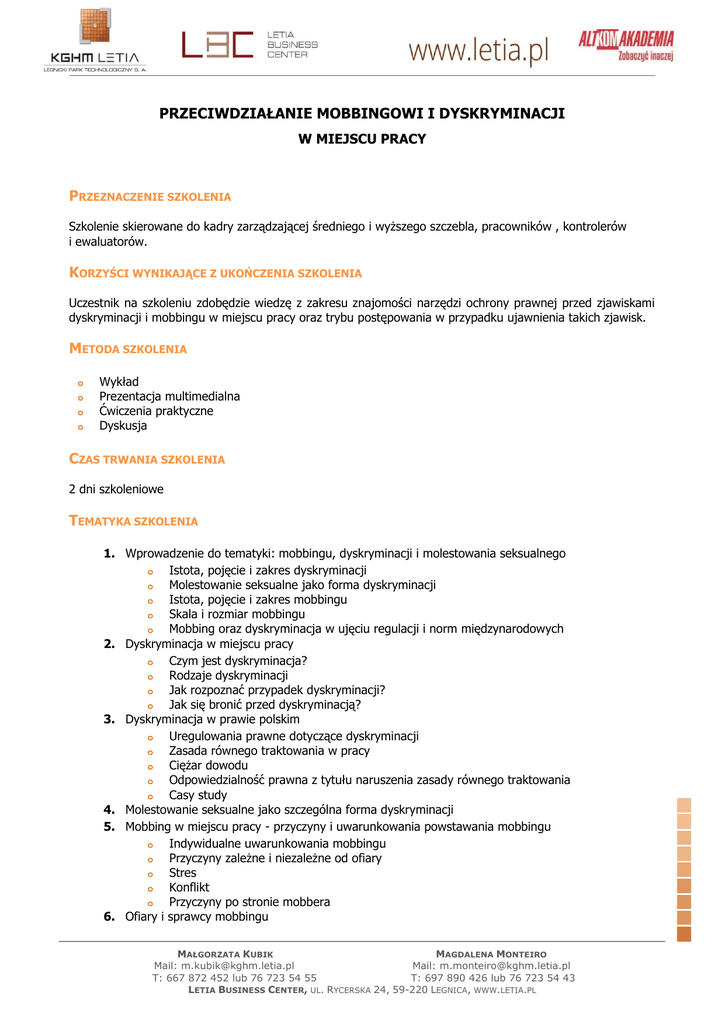 PRZECIWDZIAŁANIE MOBBINGOWI I DYSKRYMINACJI W MIEJSCU PRACY PRZEZNACZENIE SZKOLENIA Szkolenie skierowane do kadry zarządzającej średniego i wyższego szczebla, pracowników , kontrolerów i ewaluatorów. KORZYŚCI WYNIKAJĄCE Z UKOŃCZENIA SZKOLENIA Uczestnik na szkoleniu zdobędzie wiedzę z zakresu znajomości narzędzi ochrony prawnej przed zjawiskami dyskryminacji i mobbingu w miejscu pracy oraz trybu postępowania w przypadku ujawnienia takich zjawisk. METODA SZKOLENIA o o o o Wykład Prezentacja multimedialna Ćwiczenia praktyczne Dyskusja CZAS TRWANIA SZKOLENIA 2 dni szkoleniowe TEMATYKA SZKOLENIA 1. Wprowadzenie do tematyki: mobbingu, dyskryminacji i molestowania seksualnego o Istota, pojęcie i zakres dyskryminacji o Molestowanie seksualne jako forma dyskryminacji o Istota, pojęcie i zakres mobbingu o Skala i rozmiar mobbingu o Mobbing oraz dyskryminacja w ujęciu regulacji i norm międzynarodowych 2. Dyskryminacja w miejscu pracy o Czym jest dyskryminacja? o Rodzaje dyskryminacji o Jak rozpoznać przypadek dyskryminacji? o Jak się bronić przed dyskryminacją? 3. Dyskryminacja w prawie polskim o Uregulowania prawne dotyczące dyskryminacji o Zasada równego traktowania w pracy o Ciężar dowodu o Odpowiedzialność prawna z tytułu naruszenia zasady równego traktowania o Casy study 4. Molestowanie seksualne jako szczególna forma dyskryminacji 5. Mobbing w miejscu pracy - przyczyny i uwarunkowania powstawania mobbingu o Indywidualne uwarunkowania mobbingu o Przyczyny zależne i niezależne od ofiary o Stres o Konflikt o Przyczyny po stronie mobbera 6. Ofiary i sprawcy mobbingu MAŁGORZATA KUBIK MAGDALENA MONTEIRO Mail: [email protected] Mail: [email protected] T: 667 872 452 lub 76 723 54 55 T: 697 890 426 lub 76 723 54 43 LETIA BUSINESS CENTER, UL. RYCERSKA 24, 59-220 LEGNICA, WWW.LETIA.PL Osobowość ofiar mobbingu Fałszywe ofiary mobbingu o Zespół kozła ofiarnego o Cechy mobbera 7. Taktyki mobbingu o Poniżania o Upokarzania o Zastraszania o Pomniejszenia kompetencji o Utrudniania wykonywania pracy o Izolacji 8. Zapobieganie mobbingowi jako obowiązek pracodawcy. Odpowiedzialność prawna z tytułu wystąpienia mobbingu o Odpowiedzialność na zasadzie prawa pracy Odpowiedzialność pracodawcy za dopuszczenie wystąpienia mobbingu Odpowiedzialność sprawcy mobbingu Typy roszczeń przysługujących pokrzywdzonemu o Odpowiedzialność cywilna Pojęcie szkody i krzywdy Dobra osobiste człowieka i ich naruszenie Rodzaje dostępnych powództw o Odpowiedzialność karna i wykroczeniowa związana ze stosowanie mobbingu Przestępstwa Nadużycie stanowiska lub pełnionej funkcji Wykroczenia przeciwko prawu pracy Postępowanie adhezyjne w postępowaniu karnym Środki karne związane z orzekaniem w sprawach na tle mobbingowym 9. Skutki mobbingu o Wpływ zachowań mobbingowych na jednostkę i indywidualne skutki jednostkowe Zaburzenia funkcjonowania społecznego Zaburzenia psychiczne Zaburzenia somatyczne o Wpływ mobbingu na życie społeczne ofiary Destrukcja małych grup społecznych Naruszenie więzi społecznych Destrukcja rodzin o Wpływ mobbingu na organizację Skutki finansowe Skutki w sferze personalnej (HR) Skutki w sferze wizerunku przedsiębiorstwa (PR) Skutki organizacyjne dla pracowników Skutki organizacyjne dla kadry zarządzającej 10. Przeciwdziałanie mobbingowi o Asertywność o Komunikacja niewerbalna w sytuacjach trudnych o Ścieżka postępowania w przypadku podejrzenia stosowania mobbingu o Wewnętrzne organy antymobbingowe i postępowań polubownych o Wewnętrzna polityka antymobbingowa o Szkolenia dla pracowników jako podstawowa metoda antymobbingowa o Wprowadzanie regulacji prawnych dot. mobbingu o Casy study 11. Rekapitulacja o o MAŁGORZATA KUBIK MAGDALENA MONTEIRO Mail: [email protected] Mail: [email protected] T: 667 872 452 lub 76 723 54 55 T: 697 890 426 lub 76 723 54 43 LETIA BUSINESS CENTER, UL. RYCERSKA 24, 59-220 LEGNICA, WWW.LETIA.PL