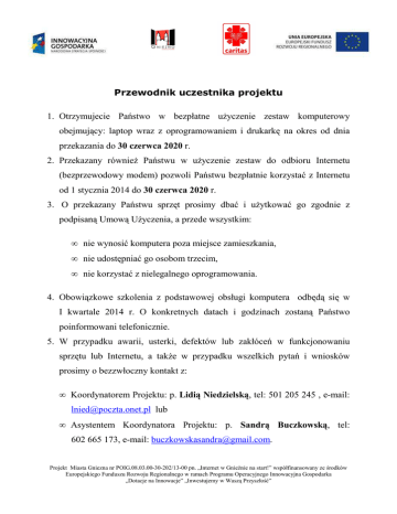 Przewodnik uczestnika projektu 1. Otrzymujecie Państwo w bezpłatne uŜyczenie zestaw komputerowy obejmujący: laptop wraz z oprogramowaniem i drukarkę na okres od dnia przekazania do 30 czerwca 2020 r. 2. Przekazany równieŜ Państwu w uŜyczenie zestaw do odbioru Internetu (bezprzewodowy modem) pozwoli Państwu bezpłatnie korzystać z Internetu od 1 stycznia 2014 do 30 czerwca 2020 r. 3. O przekazany Państwu sprzęt prosimy dbać i uŜytkować go zgodnie z podpisaną Umową UŜyczenia, a przede wszystkim: • nie wynosić komputera poza miejsce zamieszkania, • nie udostępniać go osobom trzecim, • nie korzystać z nielegalnego oprogramowania. 4. Obowiązkowe szkolenia z podstawowej obsługi komputera odbędą się w I kwartale 2014 r. O konkretnych datach i godzinach zostaną Państwo poinformowani telefonicznie. 5. W przypadku awarii, usterki, defektów lub zakłóceń w funkcjonowaniu sprzętu lub Internetu, a takŜe w przypadku wszelkich pytań i wniosków prosimy o bezzwłoczny kontakt z: • Koordynatorem Projektu: p. Lidią Niedzielską, tel: 501 205 245 , e-mail: [email protected] lub • Asystentem Koordynatora Projektu: p. Sandrą Buczkowską, tel: 602 665 173, e-mail: [email protected]. Projekt Miasta Gniezna nr POIG.08.03.00-30-202/13-00 pn. „Internet w Gnieźnie na start!” współfinansowany ze środków Europejskiego Funduszu Rozwoju Regionalnego w ramach Programu Operacyjnego Innowacyjna Gospodarka „Dotacje na Innowacje” „Inwestujemy w Waszą Przyszłość”
