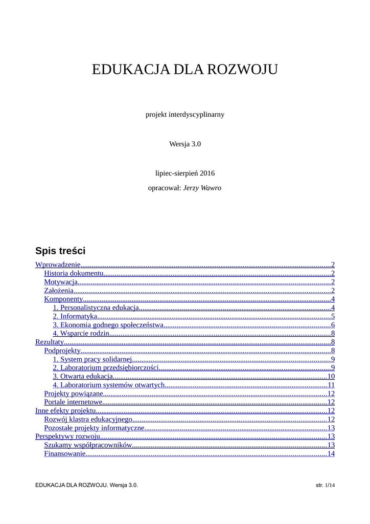 EDUKACJA DLA ROZWOJU projekt interdyscyplinarny Wersja 3.0 lipiec-sierpień 2016 opracował: Jerzy Wawro Spis treści Wprowadzenie......................................................................................................................................2 Historia dokumentu..........................................................................................................................2 Motywacja....................................................................................................................................... 2 Założenia..........................................................................................................................................2 Komponenty.....................................................................................................................................4 1. Personalistyczna edukacja.......................................................................................................4 2. Informatyka.............................................................................................................................5 3. Ekonomia godnego społeczeństwa......................................................................................... 6 4. Wsparcie rodzin...................................................................................................................... 8 Rezultaty...............................................................................................................................................8 Podprojekty......................................................................................................................................8 1. System pracy solidarnej.......................................................................................................... 9 2. Laboratorium przedsiębiorczości............................................................................................9 3. Otwarta edukacja...................................................................................................................10 4. Laboratorium systemów otwartych.......................................................................................11 Projekty powiązane........................................................................................................................12 Portale internetowe........................................................................................................................ 12 Inne efekty projektu............................................................................................................................12 Rozwój klastra edukacyjnego........................................................................................................ 12 Pozostałe projekty informatyczne..................................................................................................13 Perspektywy rozwoju......................................................................................................................... 13 Szukamy współpracowników........................................................................................................ 13 Finansowanie................................................................................................................................. 14 EDUKACJA DLA ROZWOJU. Wersja 3.0. str. 1/14 Wprowadzenie Historia dokumentu Projekt „Edukacja dla rozwoju” został opracowany na potrzeby PWSTE w Jarosławiu. Jednak władze Uczelni nie zdecydowały się na jego realizację. Dlatego powstała nowa wersja opracowania uwzględniająca jedynie te działania, które mogą być realizowane bez udziału Uczelni. W przygotowaniu pierwotnej wersji projektu wykorzystano wyniki prac z udziałem Andrzeja Madeja . Motywacja Rozwój technologiczny i przemiany społeczne wymagają zmian w procesie edukacji. Edukacja szkolna zmienia się wolno, gdyż zmiany systemowe są trudne. Nie może ona – a nawet nie powinna wypełniać całego spektrum działań edukacyjnych. Dlatego zachodzi potrzeba uzupełnienia formalnego systemu kształcenia (edukacja szkolna) o nowe formy i programy. Projekt „Edukacja dla rozwoju” koncentruje się na tych dodatkowych – pozaszkolnych działaniach. Niemniej jego realizacja może i powinna przebiegać we współpracy z jednostkami edukacyjnymi (przedszkola, szkoły, uczelnie) – wpływając na kształt edukacji szkolnej. Szeroko rozumiana edukacja ma duże znaczenie ekonomiczne. Z jednej strony głównym celem staje się kształcenie coraz lepszych specjalistów, potrzebnych gospodarce. Z drugiej – sam rynek usług edukacyjnych staje się coraz ważniejszą częścią gospodarki. Nie sposób zatem traktować edukacji w kategoriach kosztów budżetowych. Potrzebna jest zatem zmiana paradygmatów zarówno edukacji jak i ekonomii. W centrum tych przemian jest informatyka, która z jednej strony dostarcza narzędzi dla nowoczesnej gospodarki, a z drugiej sama jest bardzo istotnym jej elementem1. W projekcie „Edukacja dla rozwoju” informatyka pełni rolę centralną. Założenia Biorąc powyższe pod uwagę sformułowano następujące założenia projektu: 1. Celem edukacji jest kształcenie ludzi przedsiębiorczych, świadomych swoich celów i możliwości oraz potrzeby akceptacji podstawowych zasad. To nie jest możliwe bez większego zaangażowania rodzin. Dlatego rozwój edukacji powinien uwzględniać wsparcie rodzin w tym zakresie (edukacja w rodzinie). 2. Wykorzystanie nowoczesnych technologii pozwala rozwijać indywidualne zdolności (edukacja skupiona na uczniu), obejmując osoby w każdym wieku (kształcenie przez całe życie) – od przedszkola do końca życia. 3. Dodatkowe treści edukacyjne mogą mieć swe źródło w kontaktach personalnych (rodzina, mistrzowie, świadkowie historii etc…), internecie (e-learning), biznesie (kształcenie specjalistów) lub być wytworem aktywnego działania uczniów (kształcenie pr