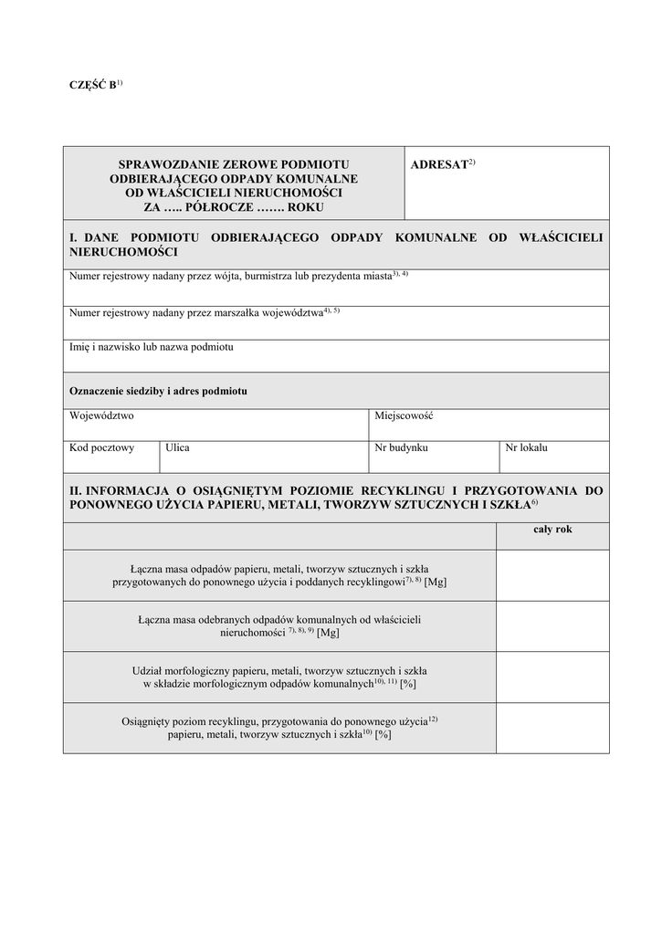 CZĘŚĆ B1) ADRESAT2) SPRAWOZDANIE ZEROWE PODMIOTU ODBIERAJĄCEGO ODPADY KOMUNALNE OD WŁAŚCICIELI NIERUCHOMOŚCI ZA ….. PÓŁROCZE ……. ROKU I. DANE PODMIOTU ODBIERAJĄCEGO ODPADY KOMUNALNE OD WŁAŚCICIELI NIERUCHOMOŚCI Numer rejestrowy nadany przez wójta, burmistrza lub prezydenta miasta3), 4) Numer rejestrowy nadany przez marszałka województwa4), 5) Imię i nazwisko lub nazwa podmiotu Oznaczenie siedziby i adres podmiotu Województwo Kod pocztowy Miejscowość Ulica Nr budynku Nr lokalu II. INFORMACJA O OSIĄGNIĘTYM POZIOMIE RECYKLINGU I PRZYGOTOWANIA DO PONOWNEGO UŻYCIA PAPIERU, METALI, TWORZYW SZTUCZNYCH I SZKŁA6) cały rok Łączna masa odpadów papieru, metali, tworzyw sztucznych i szkła przygotowanych do ponownego użycia i poddanych recyklingowi7), 8) [Mg] Łączna masa odebranych odpadów komunalnych od właścicieli nieruchomości 7), 8), 9) [Mg] Udział morfologiczny papieru, metali, tworzyw sztucznych i szkła w składzie morfologicznym odpadów komunalnych10), 11) [%] Osiągnięty poziom recyklingu, przygotowania do ponownego użycia12) papieru, metali, tworzyw sztucznych i szkła10) [%] III. INFORMACJA O OSIĄGNIĘTYM POZIOMIE RECYKLINGU, PRZYGOTOWANIA DO PONOWNEGO UŻYCIA I ODZYSKU INNYMI METODAMI INNYCH NIŻ NIEBEZPIECZNE ODPADÓW BUDOWLANYCH I ROZBIÓRKOWYCH6) cały rok Łączna masa innych niż niebezpieczne odpadów budowlanych i rozbiórkowych przygotowanych do ponownego użycia, poddanych recyklingowi i innym procesom odzysku 7), 8) [Mg] Łączna masa innych niż niebezpieczne odpadów budowlanych i rozbiórkowych odebranych w danym okresie sprawozdawczym 7), 8) [Mg] Osiągnięty poziom recyklingu, przygotowania do ponownego użycia i odzysku innymi metodami12) innych niż niebezpieczne odpadów budowlanych i rozbiórkowych10) [%] IV. INFORMACJA O OSIĄGNIĘTYM POZIOMIE OGRANICZENIA MASY ODPADÓW KOMUNALNYCH ULEGAJĄCYCH BIODEGRADACJI PRZEKAZYWANYCH DO SKŁADOWANIA6) cały rok Masa odpadów komunalnych ulegających biodegradacji wytworzona w 1995 r.8), 10), 13) [Mg] Masa odpadów ulegających biodegradacji odebranych ze strumienia odpadów komunalnych od właścicieli nieruchomości w roku rozliczeniowym, przekazanych do składowania7), 8) - MOUBR14) [Mg] Osiągnięty poziom ograniczenia masy odpadów komunalnych ulegających biodegradacji przekazywanych do składowania10), 15) [%] V. DANE OSOBY WYPEŁNIAJĄCEJ SPRAWOZDANIE Imię Nazwisko Numer telefonu służbowego16) Numer faksu służbowego16) Data sporządzenia sprawozdania Podpis i pieczątka16) odbierającego odpady komunalne od właścicieli nieruchomości17) E-mail służbowy16) Objaśnienia: 1) Wypełnia podmiot odbierający odpady komunalne od właścicieli nieruchomości, który w danym półroczu nie odbierał na terenie danej gminy odpadów komunalnych. 2) Należy wpisać wójta, burmistrza lub prezydenta miasta właściwego ze względu na obszar prowadzenia działalności w zakresie odbierania odpadów komunalnych od właścicieli nieruchomości. 3) Numer rejestrowy, o którym mowa w art. 9c ust. 7 ustawy z dnia 13 września 1996 r. o utrzymaniu czystości i porządku w gminach (Dz. U. z 2016 r. poz. 250). 4) O ile nie jest zwolniony z obowiązku jego posiadania. 5) Numer rejestrowy, o którym mowa w art. 54 ustawy z dnia 14 grudnia 2012 r. o odpadach (Dz. U. z 2013 r. poz. 21, 888 i 1238, z 2014 r. poz. 695, 1101 i 1322 oraz z 2015 r. poz. 87, 122, 933, 1045, 1688, 1936 i 2281). 6) Dział II, III i IV sprawozdania zerowego za drugie półrocze wypełnia podmiot odbierający odpady komunalne od właścicieli nieruchomości, który nie działa na podstawie umowy, o której mowa w art. 6f ust. 1 ustawy z dnia 13 września 1996 r. o utrzymaniu czystości i porządku w gminach, i nie świadczy takiej usługi w trybie zamówienia z wolnej ręki, o którym mowa w art. 6f ust. 2 tej ustawy, który odbierał na terenie danej gminy odpady komunalne od właścicieli nieruchomości w pierwszym półroczu i nie odbierał odpadów komunalnych w drugim półroczu. 7) Należy wpisać masę odpadów podaną w sprawozdaniu za pierwsze półrocze. 8) Z dokładnością do trzeciego miejsca po przecinku dla odpadów niebezpiecznych oraz innych niż niebezpieczne. W przypadku gdy masa odpadów jest mniejsza niż 1 kg, należy podać masę w zaokrągleniu do 1 kg. 9) Należy podać sumę wszystkich odebranych odpadów komunalnych z wyłączeniem odpadów z grupy 17. 10) Wypełnia podmiot, o którym mowa w art. 9n ust. 4 ustawy z dnia 13 września 1996 r. o utrzymaniu czystości i porządku w gminach, w ostatnim składanym za dany rok sprawozdaniu. 11) Na podstawie aktualnego Krajowego Planu Gospodarki Odpadami lub na podstawie badań morfologii odpadów komunalnych wykonanych na zlecenie podmiotu. 12) Poziom recyklingu, przygotowania do ponownego użycia i odzysku innymi metodami oblicza się zgodnie z przepisami wydanymi na podstawie art. 3b ust. 2 ustawy z dnia 13 września 1996 r. o utrzymaniu czystości i porządku w gminach. 13) Masę odpadów komunalnych ulegających biodegradacji wytworzoną w 1995 r. na obszarze, z którego podmiot odbiera odpady komunalne od właścicieli nieruchomości, oblicza się na podstawie wzoru: OUB1995=(0,155∗Lm+0,047∗Lw)∗Uo[Mg] gdzie: OUB1995 – masa odpadów komunalnych ulegających biodegradacji wytworzonych w 1995 r. na obszarze, z którego podmiot odbiera odpady komunalne od właścicieli nieruchomości, [Mg]; Lm - liczba mieszkańców miasta w 1995 r. na obszarze gminy według danych Głównego Urzędu Statystycznego; Lw - liczba mieszkańców wsi w 1995 r. na obszarze gminy według danych Głównego Urzędu Statystycznego; Uo – udział podmiotu odbierającego odpady od właścicieli nieruchomości w rynku usług w roku poprzedzającym rok rozliczeniowy. 14) 15) 16) 17) Udział podmiotu odbierającego odpady od właścicieli nieruchomości w rynku usług stanowi iloraz masy niesegregowanych odpadów komunalnych odebranych przez ten podmiot i łącznej masy ty