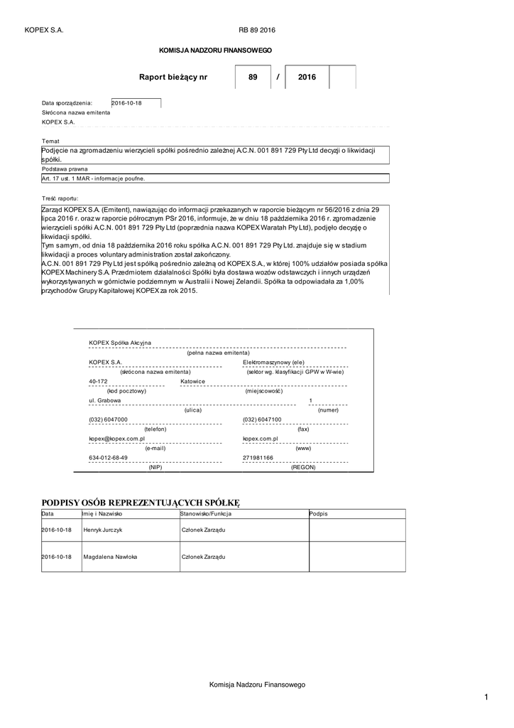 KOPEX S.A. RB 89 2016 KOMISJA NADZORU FINANSOWEGO Raport bieżący nr Data sporządzenia: 89 / 2016 2016-10-18 Skróc ona nazwa emitenta KOPEX S.A. Temat Podjęcie na zgromadzeniu wierzycieli spółki pośrednio zależnej A.C.N. 001 891 729 Pty Ltd decyzji o likwidacji spółki. Podstawa prawna Art. 17 ust. 1 MAR - informac je poufne. Treść raportu: Zarząd KOPEX S.A. (Emitent), nawiązując do informacji przekazanych w raporcie bieżącym nr 56/2016 z dnia 29 lipca 2016 r. oraz w raporcie półrocznym PSr 2016, informuje, że w dniu 18 października 2016 r. zgromadzenie wierzycieli spółki A.C.N. 001 891 729 Pty Ltd (poprzednia nazwa KOPEX Waratah Pty Ltd), podjęło decyzję o likwidacji spółki. Tym samym, od dnia 18 października 2016 roku spółka A.C.N. 001 891 729 Pty Ltd. znajduje się w stadium likwidacji a proces voluntary administration został zakończony. A.C.N. 001 891 729 Pty Ltd jest spółką pośrednio zależną od KOPEX S.A., w której 100% udziałów posiada spółka KOPEX Machinery S.A. Przedmiotem działalności Spółki była dostawa wozów odstawczych i innych urządzeń wykorzystywanych w górnictwie podziemnym w Australii i Nowej Zelandii. Spółka ta odpowiadała za 1,00% przychodów Grupy Kapitałowej KOPEX za rok 2015. KOPEX Spółka Akc yjna (pełna nazwa emitenta) Elektromaszynowy (ele) KOPEX S.A. (skróc ona nazwa emitenta) 40-172 (sektor wg. klasyfikac ji GPW w W-wie) Katowice (kod poc ztowy) (miejscowość) ul. Grabowa 1 (ulica) (numer) (032) 6047000 (032) 6047100 (telefon) (fax) [email protected] kopex.com.pl (e-mail) (www) 634-012-68-49 271981166 (NIP) (REGON) PODPISY OSÓB REPREZENTUJĄCYCH SPÓŁKĘ Data Imię i Nazwisko Stanowisko/Funkc ja 2016-10-18 Henryk Jurc zyk Członek Zarządu 2016-10-18 Magdalena Nawłoka Członek Zarządu Podpis Komisja Nadzoru Finansowego 1