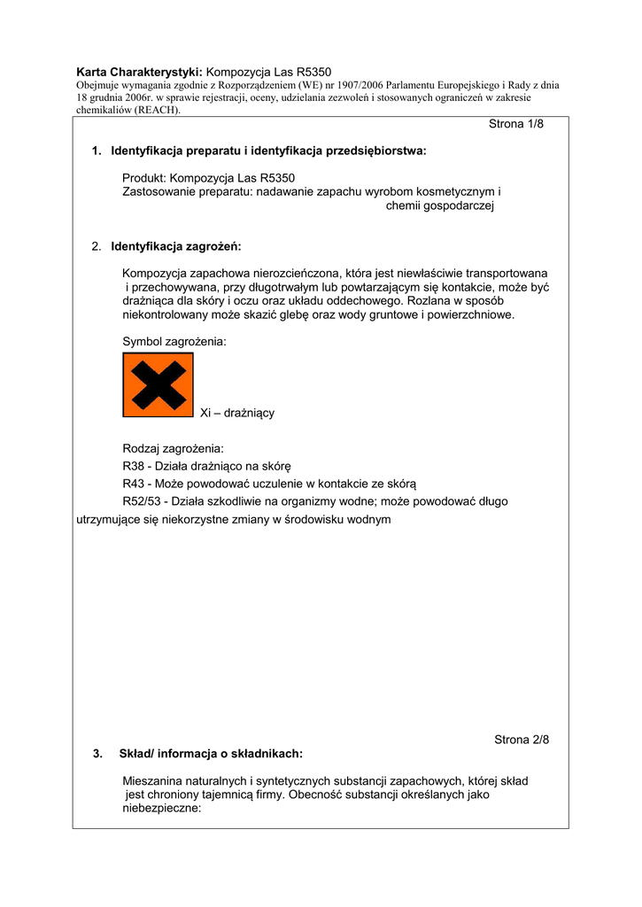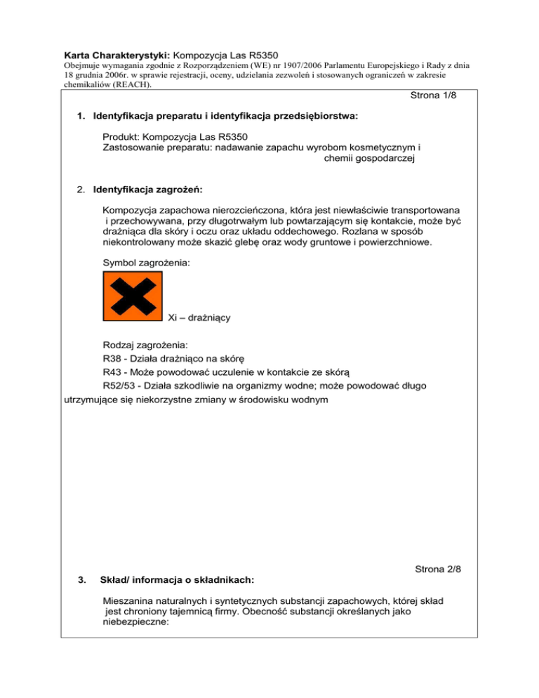 Karta Charakterystyki: Kompozycja Las R5350 Obejmuje wymagania zgodnie z Rozporządzeniem (WE) nr 1907/2006 Parlamentu Europejskiego i Rady z dnia 18 grudnia 2006r. w sprawie rejestracji, oceny, udzielania zezwoleń i stosowanych ograniczeń w zakresie chemikaliów (REACH). Strona 1/8 1. Identyfikacja preparatu i identyfikacja przedsiębiorstwa: Produkt: Kompozycja Las R5350 Zastosowanie preparatu: nadawanie zapachu wyrobom kosmetycznym i chemii gospodarczej 2. Identyfikacja zagrożeń: Kompozycja zapachowa nierozcieńczona, która jest niewłaściwie transportowana i przechowywana, przy długotrwałym lub powtarzającym się kontakcie, może być drażniąca dla skóry i oczu oraz układu oddechowego. Rozlana w sposób niekontrolowany może skazić glebę oraz wody gruntowe i powierzchniowe. Symbol zagrożenia: Xi – drażniący Rodzaj zagrożenia: R38 - Działa drażniąco na skórę R43 - Może powodować uczulenie w kontakcie ze skórą R52/53 - Działa szkodliwie na organizmy wodne; może powodować długo utrzymujące się niekorzystne zmiany w środowisku wodnym Strona 2/8 3. Skład/ informacja o składnikach: Mieszanina naturalnych i syntetycznych substancji zapachowych, której skład jest chroniony tajemnicą firmy. Obecność substancji określanych jako niebezpieczne: Karta Charakterystyki: Kompozycja Las R5350 Obejmuje wymagania zgodnie z Rozporządzeniem (WE) nr 1907/2006 Parlamentu Europejskiego i Rady z dnia 18 grudnia 2006r. w sprawie rejestracji, oceny, udzielania zezwoleń i stosowanych ograniczeń w zakresie chemikaliów (REACH). Rodzaj surowca 1,7,7-trimetylobicyklo|2.2.1]hept-2-ylu octan olejek jodły syberyjskiej olejek sosnowy z igieł 1-benzopiran-2-on 3-metylobutylu 2hydroksybenzoesan p-ment-1-en-8-ol olejek tujowy 2-propenylu heptylan dodekanal dimetylocykloheks-3-en1-karboaldehyd dekan-1-ol Numer CAS 125-12-2 Numer WE 204-727-6 Symbol zagrożenia Xi Zwroty R 38 Stężenie [%] ≤ 50,0 91697-89-1 84012-35-1 91-64-5 87-20-7 294-351-9 281-679-2 202-086-7 201-730-4 Xn Xn Xn Xi 10,65 10,65 22 36/37 ≤ 15,0 ≤ 10,0 ≤ 10,0 ≤ 10,0 8000-41-7 90131-58-1 142-19-8 232-268-1 290-370-1 205-527-1 Xi Xn Xn,N ≤ 10,0 ≤ 5,0 ≤ 2,0 112-54-9 27939-60-2 203-983-6 248-742-6 Xi,N Xi 112-30-1 203-956-9 Xi,N 38 10,22 21,22,38, 50/53 38,51/53 36/38,43, 52/53 36/38,51/ 53 ≤ 2,0 ≤ 2,0 ≤ 2,0 4. Pierwsza pomoc: Po narażeniu inhalacyjnym: W przypadku intensywnej inhalacji wyprowadzić poszkodowanego na świeże powietrze i ułożyć w wygodnej pozycji. Natychmiast skontaktować się z lekarzem. Po połknięciu: Wypłukać usta wodą. Nie wywoływać wymiotów. Natychmiast skontaktować się z lekarzem. W wyniku kontaktu ze skórą: Usunąć zanieczyszczone ubranie, natychmiast obmyć skórę dużą ilością wody , użyć mydło jeśli to możliwe. Jeśli dojdzie do uszkodzenia lub poparzenia skóry niezwłocznie skontaktować się z lekarzem. W wyniku kontaktu z oczami: Natychmiast przemyć oczy dużą ilością wody. W przypadku podrażnienia lub uszkodzenia natychmiast skontaktować się z lekarzem. Strona 3/8 5. Postępowanie w przypadku pożaru: Środki gaśnicze: Gaśnice z CO2, pianowe, proszkowe. Nie gasić wodą. Produkty spalania: CO/CO2, dym Karta Charakterystyki: Kompozycja Las R5350 Obejmuje wymagania zgodnie z Rozporządzeniem (WE) nr 1907/2006 Parlamentu Europejskiego i Rady z dnia 18 grudnia 2006r. w sprawie rejestracji, oceny, udzielania zezwoleń i stosowanych ograniczeń w zakresie chemikaliów (REACH). Specjalne wyposażenie ochronne: W przypadku niewystarczającej wentylacji używać maski gazowej. 6. Postępowanie w przypadku niezamierzonego uwolnienia do środowiska: Indywidualne środki ostrożności: Przestrzegać wskazówek podanych w punkcie 8. Usunąć wszystkie źródła ognia. Środki ostrożności w zakresie ochrony środowiska: Nie dopuszczać do przedostawania się kompozycji zapachowej do kanalizacji, wód powierzchniowych i wód gruntowych. Powiadomić odpowiednie władze i służby ratownictwa chemicznego w przypadku zanieczyszczenia wód powierzchniowych i gruntowych. Metody oczyszczania/usuwania: Usunąć rozlany produkt za pomocą środków absorbujących takich jak ziemia, piasek a następnie pozbyć się ich zgodnie z przepisami obowiązującymi na danym terenie. W przypadku dużego uwolnienia zebrać materiał po uprzednim obfitym posypaniu piaskiem lub innym materiałem obojętnym, przenieść do właściwych pojemników a następnie pozbyć się zgodnie z przepisami obowiązującymi na danym terenie. Z uwagi na możliwość samozapalenia, użyty do usuwania resztek materiał (np. szmaty) nasączyć wodą i niezwłocznie zniszczyć, najlepiej przez spalenie. 7. Postępowanie z preparatem i jego magazynowanie: Warunki magazynowania: Magazynować w oznakowanych i nieprzezroczystych pojemnikach z dala od źródeł ognia w suchym zamkniętym pomieszczeniu, o bardzo dobrej wentylacji, jeśli to możliwe w temperaturze około 15oC. Postępowanie : Postępować zgodnie z zasadami BHP na dobrze wentylowanym obszarze. Unikać kontaktu z oczami i skórą. Podczas postępowania przez cały czas stosować odzież ochronną, okulary i rękawice. Szczególną ostrożność zachować przy postępowaniu z ciepłym (gorącym produktem). Unikać wtedy wdychania. Nie spożywać. Strona 4/8 8. Kontrola narażenia i środki ochrony indywidualnej: Środki ochrony indywidualnej: Myć ręce przed każdą przerwą i po zakończeniu pracy. Podczas stosowania kompozycji zapachowej nie pić, nie spożywać posiłków i nie palić tytoniu. Unikać kontaktu z oczami i skórą. Ochrona dróg oddechowych: Unikać bezpośredniego wdychania stężonych oparów, stosować wentylację. Karta Charakterystyki: Kompozycja Las R5350 Obejmuje wymagania zgodnie z Rozporządzeniem (WE) nr 1907/2006 Parlamentu Europejskiego i Rady z dnia 18 grudnia 2006r. w sprawie rejestracji, oceny, udzielania zezwoleń i stosowanych ograniczeń w zakresie chemikaliów (REACH). Ochrona r