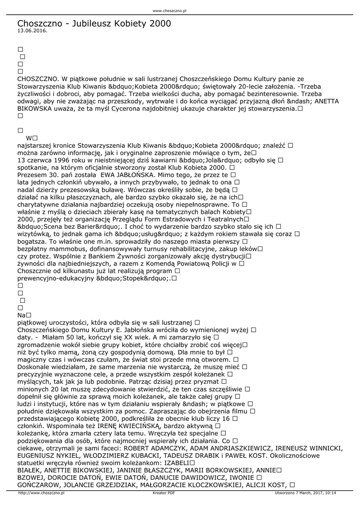 piątkowej uroczystości, która odbyła się w sali lustrzanej Choszczeńskiego Domu Kultury E. Jabłońska wróciła do wymienionej wyżej daty. - Miałam 50 lat, kończył się XX wiek. A mi zamarzyło się zgromadzenie wokół siebie grupy kobiet, które chciałby zrobić coś więcej