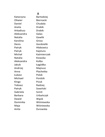 Katarzyna Oliwier Daniel Aneta Arkadiusz Aleksandra Natalia Karolina Denis Patryk Patryk Michał Natalia Aleksandra Jakub Andrzej Anna Łukasz Michael Kinga Tobiasz Patryk Gabriela Barbara Dawid Dominika Maja Anita A Bartodziej Biernacki Chudala Drabik Drabik Galas Gawlik Gniza Gordzielik Hlebowicz Kajstura Kaźmierczak Kiowska Kolba Łagódka Majnusz Plachetka Polok Pordzik Psiuk Radziej Sowiński Szmit Urbańczyk Wąsik Wiśniewska Wiśniewska Żurowska Marcin Adam Arkadiusz Radosław Natalia Michalina Adam Karolina Magdalena Maciej Izabella Monika Jakub Karolina Marta Agnieszka Jakub Denis Kinga Kamil Barbara Joanna Wojciech Wojciech Julia Justyna Maciej Kamil B Arabik Czaja Domeredzki Hreczkowski Konieczko Kozłowska Krawiec Lachacz Latacz Lipok Materla Miedza Najuch Nowak Pawełek Paździor Piontek Placheta Samól Sekuła Serej Sładek Straszewski Suhs Urbańczyk Winiarz Wojdyło Żaba Natalia Mateusz Anna Monika Michał Nikodem Ewa Marek Agnieszka Dawid Kamila Sandra Patryk Anna Przemysław Michał Bartłomiej Patryk Sandra Ewa Maria Marta Justina Paulina Leszek Paweł Michaela Patryk C Balińska Chruściel Cichoń Cichoń Cieślar Ciomperlik Długosz Dziobak Gabor Gatner Grabolus Howoń Kała Koj Kozołup Linek Michalski Namyślik Ociepka Osadnik Osuch Pietroń Prusko Roszak Smarzych Szendzielorz Wołczańska Woźnica Klaudia Roksana Natalia Diana Małgorzata Alicja Maria Jessica Zuzanna Eliza Dominika Barbara Anna Maria Marta Victoria Justyna Aleksandra Anita Aleksandra Agnieszka Natalia Monika Aleksandra Magdalena Aleksandra Martyna Justyna Alicja D Barteczko Bratek Cejzik Czech Duda Fijał Garbela Janda Janocha Kamińska Konieczna Kozioł Królewicz Krzyżanowska Lepiorz Ochmann Olszewska Osowska Pyka Saternus Skałecka Szychta Szymczak Twardawska Witosza Wojnarowska Wójcik Wrona Żegalska Michał Justyna Karolina Julia Łukasz Patrycja Nicol Wojciech Grzegorz Dawid Julia Kacper Anna Agata Izabella Dajana Katarzyna Piotr Jakub Wojciech Marta Patryk Tomasz Michalina Natalia Anna Szymon Mateusz E Apczyński Brol Chudy Drzozga Gazda Jelito Jodła Kaczmar Kocurek Kołodziej Kosmala Krawczyk Ludwig Materla Michalik Misz Nowak Puszczewicz Pyka Ropiński Siudzik Szczepanik Świerzy Trzask Zalejska Zarek Zdobylak Żak