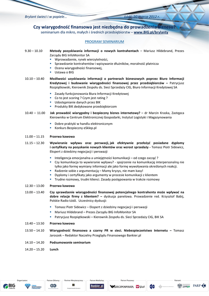 Brylant świeci i w popiele… Łódź, 20 marca 2012 r. Czy wiarygodność finansowa jest niezbędna do prowadzenia biznesu? seminarium dla mikro, małych i średnich przedsiębiorstw – www.BIG.pl/brylanty PROGRAM SEMINARIUM 9.30 – 10.10 Metody pozyskiwania informacji o nowych kontrahentach – Mariusz Hildebrand, Prezes Zarządu BIG InfoMonitor SA Wprowadzenie, rynek wierzytelności, Sprawdzanie kontrahentów i wpisywanie dłużników, moralność płatnicza Ocena wiarygodności finansowej, Ustawa o BIG 10.10 – 10.40 Możliwości uzyskiwania informacji o partnerach biznesowych poprzez Biuro Informacji Kredytowej i budowanie wiarygodności finansowej przez przedsiębiorców – Patrycjusz Rozpiątkowski, Kierownik Zespołu ds. Sieci Sprzedaży CIG, Biuro Informacji Kredytowej SA 10.40 – 11.00 Zasady funkcjonowania Biura Informacji Kredytowej Co to jest scoring ? Czym jest rating ? Udostępnianie danych przez BIK Produkty BIK dedykowane przedsiębiorcom Jak prowadzić wiarygodny i bezpieczny biznes internetowy? – dr Marcin Kraska, Zastępca Kierownika w Centrum Elektronicznej Gospodarki, Instytut Logistyki i Magazynowania Dobre praktyki w handlu elektronicznym Konkurs Bezpieczny eSklep.pl 11.00 – 11.15 Przerwa kawowa 11.15 – 12.30 Wywieranie wpływu oraz perswazji, jak efektywnie przełożyć posiadane dyplomy i certyfikaty na pozyskanie nowych klientów oraz wzrost sprzedaży - Tomasz Piotr Sidewicz, Ekspert z dziedziny negocjacji i perswazji Inteligencja emocjonalna a umiejętności komunikacji – od czego zacząć ? Czy komunikacja to wywieranie wpływu? - spojrzenie na komunikację interpersonalną nie tylko jako formę wymiany informacji ale jako formę wywoływania określonych reakcji. Radzenie sobie z argumentacją – Mamy kryzys, nie mam kasy! Dyplomy i certyfikaty jako argumenty w procesie komunikacji z klientem Trudne rozmowy, trudni klienci. Zasady postępowania w trakcie rozmowy 12.30 – 13.00 Przerwa kawowa 13.00 – 13.40 Czy sprawdzenie wiarygodności finansowej potencjalnego kontrahenta może wpływać na dobre relacje firmy z klientem? – dyskusja panelowa. Prowadzenie red. Krzysztof Babij, Polskie Radio Łódź. Uczestnicy dyskusji: Tomasz Piotr Sidewicz – Ekspert z dziedziny negocjacji i perswazji Mariusz Hildebrand – Prezes Zarządu BIG InfoMonitor SA Patrycjusz Rozpiątkowski – Kierownik Zespołu ds. Sieci Sprzedaży CIG, BIK SA 13.40 – 13.50 Przerwa kawowa 13.50 – 14.10 Wiarygodność finansowa a czarny PR w sieci. Niebezpieczeństwo Internetu – Tomasz Jaroszek – Redaktor Naczelny Przeglądu Finansowego Bankier.pl 14.10 – 14.20 Podsumowanie seminarium 14.20 – 15.20 Lunch