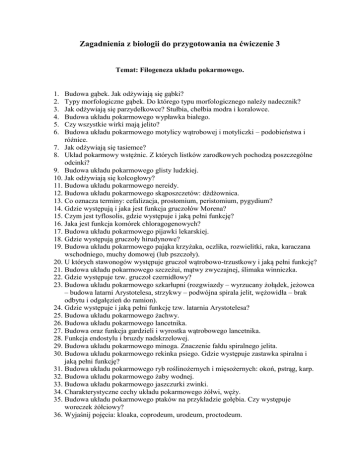 Zagadnienia z biologii do przygotowania na ćwiczenie 3 Temat: Filogeneza układu pokarmowego. Budowa gąbek. Jak odżywiają się gąbki? Typy morfologiczne gąbek. Do którego typu morfologicznego należy nadecznik? Jak odżywiają się parzydełkowce? Stułbia, chełbia modra i koralowce. Budowa układu pokarmowego wypławka białego. Czy wszystkie wirki mają jelito? Budowa układu pokarmowego motylicy wątrobowej i motyliczki – podobieństwa i różnice. 7. Jak odżywiają się tasiemce? 8. Układ pokarmowy wstężnic. Z których listków zarodkowych pochodzą poszczególne odcinki? 9. Budowa układu pokarmowego glisty ludzkiej. 10. Jak odżywiają się kolcogłowy? 11. Budowa układu pokarmowego nereidy. 12. Budowa układu pokarmowego skąposzczetów: dżdżownica. 13. Co oznacza terminy: cefalizacja, prostomium, peristomium, pygydium? 14. Gdzie występują i jaka jest funkcja gruczołów Morena? 15. Czym jest tyflosolis, gdzie występuje i jaką pełni funkcję? 16. Jaka jest funkcja komórek chloragogenowych? 17. Budowa układu pokarmowego pijawki lekarskiej. 18. Gdzie występują gruczoły hirudynowe? 19. Budowa układu pokarmowego pająka krzyżaka, oczlika, rozwielitki, raka, karaczana wschodniego, muchy domowej (lub pszczoły). 20. U których stawonogów występuje gruczoł wątrobowo-trzustkowy i jaką pełni funkcję? 21. Budowa układu pokarmowego szczeżui, mątwy zwyczajnej, ślimaka winniczka. 22. Gdzie występuje tzw. gruczoł czernidłowy? 23. Budowa układu pokarmowego szkarłupni (rozgwiazdy – wyrzucany żołądek, jeżowca – budowa latarni Arystotelesa, strzykwy – podwójna spirala jelit, wężowidła – brak odbytu i odgałęzień do ramion). 24. Gdzie występuje i jaką pełni funkcję tzw. latarnia Arystotelesa? 25. Budowa układu pokarmowego żachwy. 26. Budowa układu pokarmowego lancetnika. 27. Budowa oraz funkcja gardzieli i wyrostka wątrobowego lancetnika. 28. Funkcja endostylu i bruzdy nadskrzelowej. 29. Budowa układu pokarmowego minoga. Znaczenie fałdu spiralnego jelita. 30. Budowa układu pokarmowego rekinka psiego. Gdzie występuje zastawka spiralna i jaką pełni funkcję? 31. Budowa układu pokarmowego ryb roślinożernych i mięsożernych: okoń, pstrąg, karp. 32. Budowa układu pokarmowego żaby wodnej. 33. Budowa układu pokarmowego jaszczurki zwinki. 34. Charakterystyczne cechy układu pokarmowego żółwi, węży. 35. Budowa układu pokarmowego ptaków na przykładzie gołębia. Czy występuje woreczek żółciowy? 36. Wyjaśnij pojęcia: kloaka, coprodeum, urodeum, proctodeum. 1. 2. 3. 4. 5. 6. Literatura: obowiązkowa 1. Czesław Jura: Bezkręgowce. 2. Szarski H. (red.): Anatomia porównawcza kręgowców. 3. Czesław Błaszak (red.): Zoologia. Bezkręgowce. Tom I. 4. Knut Schmidt-Nielsen: Fizjologia zwierząt. Adaptacja do środowiska. 5. Dobrowolski, Klimaszewski, Szelęgiewicz: Zoologia. 6. Jarygin W.N. (red.): Biologia. Podręcznik dla studentów kierunków medycznych. uzupełniająca 1. Grabda E.: Zoologia. Bezkręgowce. 2. Rajski A.: Zoologia.