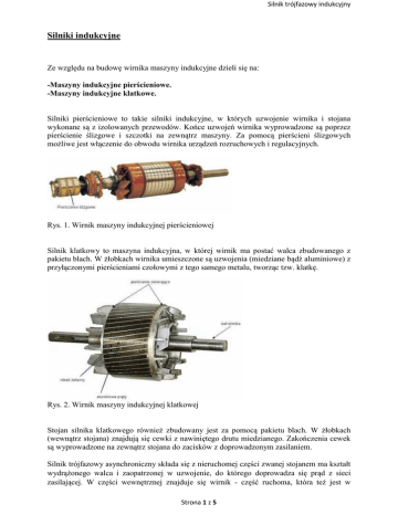 Silnik trójfazowy indukcyjny Silniki indukcyjne Ze względu na budowę wirnika maszyny indukcyjne dzieli się na: -Maszyny indukcyjne pierścieniowe. -Maszyny indukcyjne klatkowe. Silniki pierścieniowe to takie silniki indukcyjne, w których uzwojenie wirnika i stojana wykonane są z izolowanych przewodów. Końce uzwojeń wirnika wyprowadzone są poprzez pierścienie ślizgowe i szczotki na zewnątrz maszyny. Za pomocą pierścieni ślizgowych możliwe jest włączenie do obwodu wirnika urządzeń rozruchowych i regulacyjnych. Rys. 1. Wirnik maszyny indukcyjnej pierścieniowej Silnik klatkowy to maszyna indukcyjna, w której wirnik ma postać walca zbudowanego z pakietu blach. W żłobkach wirnika umieszczone są uzwojenia (miedziane bądź aluminiowe) z przyłączonymi pierścieniami czołowymi z tego samego metalu, tworząc tzw. klatkę. Rys. 2. Wirnik maszyny indukcyjnej klatkowej Stojan silnika klatkowego również zbudowany jest za pomocą pakietu blach. W żłobkach (wewnątrz stojana) znajdują się cewki z nawiniętego drutu miedzianego. Zakończenia cewek są wyprowadzone na zewnątrz stojana do zacisków z doprowadzonym zasilaniem. Silnik trójfazowy asynchroniczny składa się z nieruchomej części zwanej stojanem ma kształt wydrążonego walca i zaopatrzonej w uzwojenie, do którego doprowadza się prąd z sieci zasilającej. W części wewnętrznej znajduje się wirnik - część ruchoma, która też jest w Strona 1 z 5 Silnik trójfazowy indukcyjny kształcie walca. Obwód magnetyczny oddzielony jest szczeliną powietrzną (w zależności od wielkości maszyny grubość od dziesiątych części milimetra do nawet 3mm). Rdzenie stojana i wirnika, które tworzą obwód magnetyczny, zbudowane są z pakietu blach izolowanych między sobą. Rys. 3. Przekrój silnika indukcyjnego Zasada działania silnika asynchronicznego Wytworzone przez uzwojenia stojana wirujące pole magnetyczne obraca się wokół nieruchomego wirnika. W wyniku przecinania przez to pole prętów klatki wirnika, indukuje się w nich napięcie (stąd nazwa ”silnik indukcyjny”) i zaczyna płynąć w nich prąd. Przepływ prądu w polu magnetycznym powoduje powstanie siły elektrodynamicznej działającej stycznie do obwodu wirnika, a zatem powstaje także moment elektromagnetyczny. Jeżeli wartość tego momentu jest większa od wartości momentu obciążenia, to wirnik rusza i zaczyna zwiększać swoja prędkość obrotową. Zwiększanie prędkości wirnika, powoduje że pręty jego klatki przecinane są przez pole magnetyczne z coraz mniejszą prędkością, co skutkuje zmniejszeniem wartości indukowanej siły elektromotorycznej i spadkiem wartość prądu płynącego w prętach klatki, a zatem spada również wartość momentu elektromagnetycznego. Jeżeli moment ten spadnie do wartości równej momentowi obciążenia, wirnik przestanie przyspieszać i dalej będzie poruszał się ze stałą prędkością. Gdyby nie było żadnego momentu oporowego, wirnik osiągnąłby prędkość równą wartości prędkości wirowania pola, a więc prędkości synchronicznej. W takim przypadku pole wirnika byłoby nieruchome względem pola stojana, a więc ustałoby przecinanie prętów klatki przez pole stojana i nie płynęłyby w nich prądy, nie powstałby moment elektromagnetyczny. Sytuacja taka nie jest jednak możliwa do wystąpienia w rzeczywistym silniku, ponieważ zawsze występuje jakiś moment obciążenia, chociażby moment tarcia w łożyskach czy oporów powietrza (chyba że wirnik będzie napędzany mechanicznie przez jakiś inny silnik). Zatem wirnik osiągnie taką prędkość (zwykle niewiele mniejsza od prędkości synchronicznej), przy której momenty elektromagnetyczny silnika i obciążenia będą miały tą samą wartość. Skoro nie jest to Strona 2 z 5 Silnik trójfazowy indukcyjny prędkość synchroniczna, musi to być prędkość asynchroniczna, której silnik indukcyjny zawdzięcza swoja druga nazwę - “silnika asynchronicznego”. Wartość prędkości synchronicznej n1 liczymy jako: 60 f (1) p gdzie: f – częstotliwość napięcia zasilania silnik, p – liczba par biegunów. Wirnik obraca się z mniejszą prędkością niż stojan. Wartość tej prędkości jest uzależniona od momentu obciążenia - przy większym momencie oporowym wirnik obraca się wolniej, przyspiesza, jeżeli go zmniejszamy. A więc w skoro prędkości wirnika i stojana są różne, oznacza to, że stojan, a w rzeczywistości pole wirujące wytwarzane przez stojan, obraca się z pewną prędkością względem wirnika. Prędkość ta jest nieznacznie mniejsza od prędkości synchronicznej. Można wprowadzić tu dodatkowe pojęcie poślizgu, który wyraża się wzorem: n −n s= 1 (2) n1 n1 = gdzie: n1 – prędkość synchroniczna, n – prędkość wirnika maszyny. Charakterystyki momentu oraz prądu rozruchowego silnika indukcyjnego Charakterystyka mechaniczna silnika indukcyjnego ukazuje zależność momentu na jego wale od prędkości obrotowej silnika. Gdy wirnik silnika asynchronicznego jest nieruchomy, wówczas jego prędkość obrotowa przyjmuje wartość zero (n = 0), a poślizg s = 1. Przy prędkości wirnika równej prędkości synchronicznej poślizg jest równy zeru (s = 0). Prąd stojana silnika ma największą wartość Ir przy nieruchomym wirniku (n = 0, s = 1), a moment rozruchowy Mr nie przyjmuje wtedy swej największej wartości. Maksymalna wartość momentu Mmax występuje przy poślizgu tzw. krytycznym sk. Rys. 4. Charakterystyki: momentu i prądu stojana silnika indukcyjnego Rozruch silnika asynchronicznego Rodzaje rozruchu silnika indukcyjnego • • Rozruch bezpośredni Rozruch skokowy gwiazda-trójkąt (rozruch napięciowy) Strona 3 z 5 Silnik trójfazowy indukcyjny • • • Rozruch napięciowy z zastosowaniem regulatora napięcia (rozruch napięciowy) Rozruch przez zmianę rezystancji w obwodzie wirnika Rozruch z zastosowaniem “softstartu” Rozruch bezpośredni, polegając