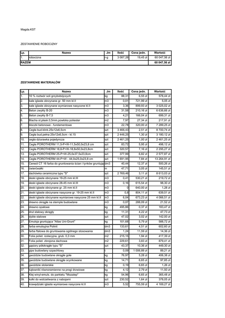 Magda.KST ZESTAWIENIE ROBOCIZNY Lp. 1. Nazwa robocizna Jm r-g Ilość Cena jedn. 3 087,28 19,45 zł RAZEM Wartość 60 047,56 zł 60 047,56 zł ZESTAWIENIE MATERIAŁÓW Lp. Nazwa Jm Ilość Cena jedn. Wartość 1. 10 % roztwór soli grzybobójczych kg 88,31 6,55 zł 2. bale iglaste obrzynane gr. 50 mm kl.II m3 0,01 721,99 zł 578,44 zł 5,05 zł 3. bale iglaste obrzynane wymiarowe nasycone kl.II m3 3,36 899,93 zł 3 025,02 zł 4. Beton zwykły B-20 m3 31,58 210,16 zł 6 636,66 zł 5. Beton zwykły B-7,5 m3 4,21 166,04 zł 699,31 zł 6. Blacha st.płask.0,5mm,powłoka poliester m2 7,97 27,34 zł 217,91 zł 7. bloczki betonowe - fundamentowe m3 22,78 320,00 zł 7 289,25 zł 8. Cegła bud.klink.25x12x6,5cm szt 3 466,43 2,51 zł 8 700,74 zł 9. Cegła bud.pełna 25x12x6,5cm - kl.15 szt 2 446,25 1,30 zł 3 180,12 zł 10. cegła dziurawka pojedyncza szt 2 461,25 1,00 zł 2 461,25 zł 11. Cegła POROTHERM 11,5-P+W-11,5x50,0x23,8 cm szt 83,72 5,95 zł 498,12 zł 12. Cegła POROTHERM 18,8-P+W-18,8x50,0x23,8cm szt 320,57 7,16 zł 2 295,27 zł 13. Cegła POROTHERM 25-P+W-25,0x37,5x23,8cm szt 377,99 6,82 zł 2 577,87 zł 14. Cegła POROTHERM 44-P+W - 44,0x25,0x23,8 cm szt 1 691,95 7,84 zł 13 264,91 zł 15. Ceresit CT 16 farba do gruntowania ścian i tynków gruntująca dm3 na bazie żywic 40,44 syntetycznych 12,37 zł 500,26 zł 16. ćwierćwałki m 17. dachówka ceramiczna typu "S" 18. 19. 47,71 3,05 zł 145,51 zł szt 2 769,46 3,11 zł 8 613,03 zł deski iglaste obrzynane 19-25 mm kl.III m3 0,41 530,21 zł 219,72 zł deski iglaste obrzynane 28-45 mm kl.III m3 0,16 615,54 zł 98,30 zł 20. deski iglaste obrzynane gr. 25 mm kl.II m3 0 640,00 zł 1,28 zł 21. deski iglaste obrzynane nasycone gr. 19-25 mm kl.II m3 0,8 804,11 zł 639,51 zł 22. deski iglaste obrzynane wymiarowe nasycone 25 mm kl.II m3 6,04 673,23 zł 4 066,51 zł 23. drewno okrągłe na stemple budowlane m3 0,07 288,09 zł 21,52 zł 24. drewno opałowe kg 495,86 0,37 zł 183,47 zł 25. drut stalowy okrągły kg 11,31 4,22 zł 47,73 zł 26. dyble stalowe szt 47,02 3,02 zł 142,00 zł 27. Emulsja gruntująca "Atlas Uni-Grunt" kg 101,68 5,79 zł 588,72 zł 28. farba emulsyjna Polinit dm3 133,61 4,51 zł 602,60 zł 29. farba ftalowa do gruntowania ogólnego stosowania dm3 1,24 11,59 zł 14,36 zł 30. Folia poliet. izolacyjna, grub. 0,3 mm m2 215,15 1,94 zł 417,39 zł 31. Folia poliet. zbrojona dachowa m2 229,61 3,83 zł 879,41 zł 32. gąsiory półokrągłe typu "S" szt 43,37 10,36 zł 449,30 zł 33. gips budowlany szpachlowy t 0,09 1 006,89 zł 89,21 zł 34. gwoździe budowlane okrągłe gołe kg 76,97 5,28 zł 406,38 zł 35. gwoździe budowlane okrągłe ocynkowane kg 14,71 6,65 zł 97,85 zł 36. gwoździe stolarskie kg 0,19 6,65 zł 1,26 zł 37. kątowniki równoramienne na progi drzwiowe kg 4,12 2,79 zł 11,50 zł 38. Klej winyl-emuls. do parkietu "Mozalep" kg 54,96 6,65 zł 365,48 zł 39. kołki do wstrzeliwania z nabojami szt 230,52 1,64 zł 378,05 zł 40. krawędziaki iglaste wymiarowe nasycone kl.II m3 5,52 755,59 zł 4 169,27 zł 41. kształtowniki walcowane - dwuteowniki kg 42. lakier chemoutwardzalny na drewno dm3 492,54 3,12 zł 1 536,74 zł 24,05 14,66 zł 43. lepik asfaltowy bez wypełniaczy na gorąco 352,50 zł kg 196,86 1,80 zł 354,34 zł 44. 45. lepik asfaltowy na zimno kg 325,44 3,42 zł 1 113,00 zł listwy iglaste kl.III m3 0,39 609,69 zł 238,08 zł 46. listwy przyścienne z drewna liściastego m 79,69 6,21 zł 494,89 zł 47. łaty iglaste 50x45 mm m3 1,24 707,36 zł 874,58 zł 48. łaty iglaste 75x22 mm m3 0,39 707,36 zł 274,88 zł 49. ławy kominiarskie m 1,2 237,42 zł 284,90 zł 50. masa asfaltowa kg 6,33 3,38 zł 21,39 zł 51. nadproża prefabrykowane L-19 m 56,3 23,58 zł 1 327,65 zł 52. okna i drzwi balkonowe fabrycznie wykończone m2 11,97 543,69 zł 6 507,97 zł 53. okna i drzwi balkonowe fabrycznie wykończone - kształty nietypowe m2 0,39 750,00 zł 294,75 zł 54. ościeżnice drzwiowe stalowe szt 7 58,30 zł 408,10 zł 55. papa asfaltowa na tekturze izolacyjna m2 312,51 1,84 zł 575,01 zł 56. papier ścierny ark 3,78 1,01 zł 3,82 zł 57. pasta podłogowa bezbarwna kg 6,87 6,37 zł 43,76 zł 58. Pianka poliuretanowa kg 0,75 21,97 zł 16,46 zł 59. piasek do zapraw m3 32,37 26,00 zł 841,67 zł 60. Pł.rusztow.pomost.komunik.długie gr.38 mm m2 0,14 63,85 zł 8,94 zł 61. Płyta gips. karton. wodoodporna 12,5mm m2 94,02 10,48 zł 985,29 zł 62. Płyta posadz.mozaik.bukowa kl.II, gr.10mm m2 70,76 38,20 zł 2 703,07 zł 63. Płytki "Gres" o wym.30,0x30,0x1,0cm,gat.I m2 55,23 47,82 zł 2 641,00 zł 64. Płyty bud.OSB3 o krawędz.prost. gr.10-22mm m3 1,99 1 575,38 zł 3 133,12 zł 65. Płyty styropianowe EPS 100-038 (dawniej PS-E FS 20) m3 3,8 180,24 zł 684,34 zł 66. Płyty styropianowe EPS 70-040 (dawniej PS-E FS 15) m3 0,75 152,28 zł 113,72 zł 67. Płyty z wełny min.do izol.poddaszy - 180mm m2 94,92 32,38 zł 3 073,51 zł 68. podokienniki wewnętrzne szt 5 84,57 zł 422,85 zł 69. podokienniki zewntrzne PCV szt 5 48,32 zł 241,60 zł 70. pręty gładkie kg 157,31 2,76 zł 434,19 zł 71. pręty żebrowane kg 812,94 2,76 zł 2 243,71 zł 72. pustaki spalinowe ceramiczne 19x19x24 cm szt 184,25 4,06 zł 748,07 zł 73. rozcieńczalnik dm3 0,29 4,83 zł 1,42 zł 74. roztwór asfaltowy do gruntowania kg 98,82 3,61 zł 356,76 zł 75. roztwór asfaltowy do izolacji kg 103,93 3,56 zł 370,01 zł 76. rury spustowe 110 mm m 12,12 14,04 zł 170,16 zł 77. rynny dachowe 150 mm m 22,26 14,02 zł 312,03 zł 78. schody składane - wejście na poddasze kpl 1 350,00 zł 350,00 zł 79. siatka z włókna szklanego m2 41,27 2,76 zł 113,90 zł 80. skrzydła drzwiowe płytowe wewnątrzlokalowe m2 13,65 114,78 zł 1 566,75 zł 81. skrzydła drzwiowe wejściowe m2 2,1 604,10 zł 1 268,61 zł 82. stopień kominiarski szt 18 48,09 zł 865,62 zł 83. Styropian ekstrudowany m3 3,33 542,80 zł 1 809,21 zł 84. sucha mieszanka tynkarska mineralna o grubości ziarna do 3,5 kg mm 593,14 1,68 zł 996,48 zł 85. Sucha zaprawa samopo