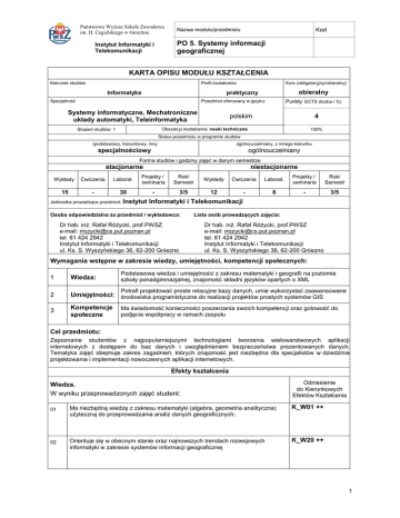 Państwowa Wyższa Szkoła Zawodowa im. H. Cegielskiego w Gnieźnie Nazwa modułu/przedmiotu Kod PO 5. Systemy informacji geograficznej Instytut Informatyki i Telekomunikacji KARTA OPISU MODUŁU KSZTAŁCENIA Kierunek studiów Profil kształcenia Informatyka Kurs (obligatoryjny/obieralny) obieralny praktyczny Specjalność Przedmiot oferowany w języku: Systemy informatyczne, Mechatroniczne układy automatyki, Teleinformatyka Punkty ECTS (liczba i %) 4 polskim Obszar(y) kształcenia: nauki techniczne Stopień studiów: 1 100% Status przedmiotu w programie studiów (podstawowy, kierunkowy, inny ogólnouczelniany, z innego kierunku specjalnościowy ogólnouczelniany Forma studiów i godziny zajęć w danym semestrze stacjonarne niestacjonarne Wykłady Ćwiczenia Laborat. Projekty / seminaria Rok/ Semestr Wykłady Ćwiczenia Laborat. Projekty / seminaria Rok/ Semestr 15 - 30 - 3/5 12 - 8 - 3/5 Jednostka prowadząca przedmiot: Instytut Informatyki i Telekomunikacji Osoba odpowiedzialna za przedmiot / wykładowca: Dr hab. inż. Rafał Różycki, prof.PWSZ e-mail: [email protected] tel. 61 424 2942 Instytut Informatyki i Telekomunikacji ul. Ks. S. Wyszyńskiego 36, 62-200 Gniezno Lista osób prowadzących zajęcia: Dr hab. inż. Rafał Różycki, prof.PWSZ e-mail: [email protected] tel. 61 424 2942 Instytut Informatyki i Telekomunikacji ul. Ks. S. Wyszyńskiego 36, 62-200 Gniezno Wymagania wstępne w zakresie wiedzy, umiejętności, kompetencji społecznych: Podstawowa wiedza i umiejętności z zakresu matematyki i geografii na poziomie szkoły ponadgimnazjalnej, znajomość składni języków opartych o XML 1 Wiedza: 2 Umiejętności: środowiska programistyczne do realizacji projektów prostych systemów GIS 3 Kompetencje społeczne Potrafi projektować proste relacyjne bazy danych, umie wykorzystać zaawansowane Ma świadomość konieczności poszerzania swoich kompetencji oraz gotowość do podjęcia współpracy w ramach zespołu Cel przedmiotu: Zapoznanie studentów z najpopularniejszymi technologiami tworzenia wielowarstwowych aplikacji internetowych z dostępem do baz danych i uwzględnieniem bezpieczeństwa prezentowanych danych. Tematyka zajęć obejmuje zakres zagadnień, których znajomość jest niezbędna dla specjalistów w dziedzinie projektowania i implementacji nowoczesnych aplikacji internetowych. Efekty kształcenia Wiedza. W wyniku przeprowadzonych zajęć student: Odniesienie do Kierunkowych Efektów Kształcenia 01 Ma niezbędną wiedzę z zakresu matematyki (algebra, geometria analityczna) użyteczną do przeprowadzania analiz danych geograficznych; K_W01 ++ 02 Orientuje się w obecnym stanie oraz najnowszych trendach rozwojowych informatyki w zakresie systemów informacji geograficznej K_W20 ++ 1 PO 5. Systemy informacji geograficznej Ma uporządkowaną i podbudowaną teoretycznie wiedzę z zakresu metod reprezentowania danych geograficznych i baz danych geograficznych; 03 Umiejętności. W wyniku przeprowadzonych zajęć student będzie potrafił: K_W15 ++ Odniesienie do Kierunkowych Efektów Kształcenia 01 pozyskiwać informacje przestrzenne z Internetu, interpretować je i dokonywać prostych analiz danych; K_U01 ++ 02 dobierać narzędzia/metody prezentowania danych geograficznych; K_U09 ++ 03 potrafi projektować i budować proste systemy baz danych geograficznych przeznaczonych do zastosowań inżynierskich z zakresu systemów informacji geograficznej Kompetencje społeczne. W wyniku przeprowadzonych zajęć student zdobędzie następujące kompetencje: Rozumie potrzebę permanentnego kształcenia się i skutecznej wymiany informacji z najbliższym otoczeniem w działalności zawodowej. 01 Ma świadomość wagi zachowania się w sposób profesjonalny, przestrzegania zasad etyki zawodowej niezbędnej w utrzymaniu spójnych i wartościowych systemów informacji geograficznej udostępnianych na użytek publiczny. 02 K_U21++ Odniesienie do Kierunkowych Efektów Kształcenia K_K01 K_K03 Sposoby sprawdzenia efektów kształcenia Wykład test wielokrotnego wyboru (zadania zamknięte ) + ewentualna część ustna (dla osób starających się o wyższą ocenę); Laboratorium: ocena realizacji zadań cząstkowych; ocena projektu przygotowanego w ramach pracy własnej. Uzyskiwanie punktów dodatkowych za aktywność podczas zajęć, a szczególnie za: zgłoszenie propozycji tematu realizowanego w ramach pracy własnej proponowanie przykładowych zadań do rozwiązania wyszukiwanie i prezentowanie na zajęciach najnowszych internetowych rozwiązań z zakresu GIS Treści programowe W ramach przedmiotu omówione zostaną: modele danych geograficznych, jakość danych geograficznych, podstawy geodezji, systemy odniesień przestrzennych, bazy danych geograficznych, przetwarzanie danych geograficznych, analizy przestrzenne danych wektorowych i rastrowych, wizualizacja danych geograficznych, podstawowe języki opisu danych geograficznych (GML, KML), przykłady serwisów mapowych w Internecie, obsługa wybranego darmowego środowiska GIS. Literatura podstawowa: 1. Bielecka E.,Systemy informacji geograficznej. Teoria i zastosowania, PJWSTK, Warszawa, 2006 2. Longley,P. Goodchild M., Maguire D.,Rhied D., GIS Teoria i praktyka, PWN, Warszawa, 2006 3. Felcenloben D., Geoinformacja Wprowadzenie do systemów organizacji danych i wiedzy, GALL, 2011 2 PO 5. Systemy informacji geograficznej Literatura uzupełniająca: WWW – wskazane strony i portale internetowe 1. Obciążenie pracą studenta Studia stacjonarne forma aktywności niestacjonarne godzin ECTS godziny ECTS 100 4 100 4 Zajęcia wymagające indywidualnego kontaktu z nauczycielem 2) 45+10 2 20+10 1.5 Zajęcia o charakterze praktycznym 30+10 2 8+70 3 45 2 70 2.5 Łączny nakład pracy 1) 3) Praca własna studenta 4) 1 pkt ECTS 25-30 h pracy studenta – do określenia poszczególnych składowych przyjęto: 1. łączne obciążenie studenta: 2. zajęcia dydaktyczne {w+c+L+p} + konsultacje +egzamin: dla stacjonarnych liczba godzin >