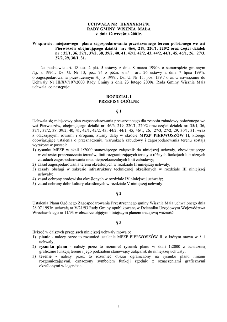 UCHWAŁA NR III/XXXI/242/01 RADY GMINY WISZNIA MAŁA z dnia 12 września 2001r. W sprawie: miejscowego planu zagospodarowania przestrzennego terenu położonego we wsi Pierwoszów obejmującego działki nr: 46/6, 219, 220/1, 220/2 oraz części działek nr : 35/1, 36, 37/1, 37/2, 38, 39/2, 40, 41, 42/1, 42/2, 43, 44/2, 44/1, 45, 46/1, 26, 27/3, 27/2, 29, 30/1, 31. Na podstawie art. 18 ust. 2 pkt. 5 ustawy z dnia 8 marca 1990r. o samorządzie gminnym /t.j. z 1996r. Dz. U. Nr 13, poz. 74 z późn. zm./ i art. 26 ustawy z dnia 7 lipca 1994r. o zagospodarowaniu przestrzennym /t.j. z 1999r. Dz. U. Nr 15, poz. 139 / oraz w nawiązaniu do Uchwały Nr III/XV/107/2000 Rady Gminy z dnia 23 lutego 2000r. Rada Gminy Wisznia Mała uchwala, co następuje: ROZDZIAŁ I PRZEPISY OGÓLNE §1 Uchwala się miejscowy plan zagospodarowania przestrzennego dla zespołu zabudowy położonego we wsi Pierwoszów, obejmującego działki nr: 46/6, 219, 220/1, 220/2 oraz części działek nr: 35/1, 36, 37/1, 37/2, 38, 39/2, 40, 41, 42/1, 42/2, 43, 44/2, 44/1, 45, 46/1, 26, 27/3, 27/2, 29, 30/1, 31, wraz z otaczającymi rowami i drogami, zwany dalej w skrócie MPZP PIERWOSZÓW II, którego obowiązujące ustalenia o przeznaczeniu, warunkach zabudowy i zagospodarowania terenu zostają wyrażone w postaci: 1) rysunku MPZP w skali 1:2000 stanowiącego załącznik do niniejszej uchwały, obowiązującego w zakresie: przeznaczenia terenów, linii rozgraniczających tereny o różnych funkcjach lub róznych zasadach zagospodarowania oraz nieprzekraczalnych linii zabudowy; 2) zasad zagospodarowania terenu określonych w rozdziale II niniejszej uchwały; 3) zasady obsługi w zakresie infrastruktury technicznej określonych w rozdziale III niniejszej uchwały; 4) zasad ochrony środowiska określonych w rozdziale IV niniejszej uchwały; 5) zasad ochrony dóbr kultury określonych w rozdziale V niniejszej uchwały §2 Ustalenia Planu Ogólnego Zagospodarowania Przestrzennego gminy Wisznia Mała uchwalonego dnia 28.07.1993r. uchwałą nr V/21/93 Rady Gminy opublikowaną w Dzienniku Urzędowym Województwa Wrocławskiego nr 11/93 w obszarze objętym niniejszym planem tracą swą ważność. §3 Ilekroć w dalszych przepisach niniejszej uchwały mowa o: 1) planie - należy przez to rozumieć ustalenia MPZP PIERWOSZÓW II, o którym mowa w § 1 uchwały; 2) rysunku planu - należy przez to rozumieć rysunek planu w skali 1:2000 z oznaczoną graficznie funkcją terenu i jego podziałem stanowiący załącznik do niniejszej uchwały; 3) terenie - należy przez to rozumieć obszar ograniczony na rysunku planu liniami rozgraniczającymi, oznaczony symbolem funkcji zgodnie z oznaczeniami graficznymi określonymi w legendzie. 1 ROZDZIAŁ II ZASADY ZAGOSPODAROWANIA TERENU §4 Zasady ogólne 1. Obszar objęty planem podzielono na tereny o różnych funkcjach lub różnych sposobach zagospodarowania oraz oznaczono na rysunku planu symbolami i numerami. 2. Wskazane w planie funkcje terenu są obowiązujące, funkcje te można uzupełnić o dodatkowe pod warunkiem, że nie będą kolidowały z podstawową funkcją terenu. 3. Zaleca się, aby inwestowanie w tych terenach zostało poprzedzone kompleksowym wytyczeniem układu komunikacyjnego oraz realizacją podstawowych sieci uzbrojenia. 4. W przypadku uzyskania możliwości poszerzenia ulic, dopuszcza się korektę linii rozgraniczających bez dokonywania zmian niniejszego planu. §5 Przeznaczenie terenów oraz lokalne warunki, zasady i standardy kształtowania zabudowy oraz urządzania terenu 1. Wyznacza się tereny zabudowy mieszkaniowej, oznaczone na rysunku planu symbolami: 1 MN, 2 MN, 3 MN, 4 MN, 5 MN, 6 MN, 7 MN, dla których obowiązują następujące ustalenia: 1) Tereny przeznaczone pod zabudowę mieszkaniową, jednorodzinną, wolnostojącą o niskiej intensywności zabudowy; 2) Wyklucza się zabudowę szeregową oraz bliźniaczą; 3) Dopuszcza się w budynku mieszkalnym lokalizację usługi nieuciążliwej. Na etapie uzyskania pozwolenia na budowę dla projektowanych usług nieuciążliwych, towarzyszących funkcji mieszkaniowej należy uzyskać postanowienie Powiatowego Inspektora Sanitarnego; 4) Wyklucza się lokalizację obiektów towarzyszących funkcji mieszkaniowej mogących pogorszyć stan środowiska; 5) Budynek mieszkalny nie wyższy niż 2 kondygnacje (w tym poddasze użytkowe). Przy projektowaniu zabudowy należy uwzględnić walory krajobrazu; 6) Oznaczona na rysunku planu nieprzekraczalna linia zabudowy oznacza, że zewnętrzny obrys budynku nie może jej przekraczać; 7) Brak oznaczonej linii zabudowy oznacza, że lokalizacja obiektów jest dowolna z zachowaniem wymogów prawa budowlanego; 8) Miejsca postojowe dla wszystkich pojazdów właściciela na posesji własnej. W przypadku prowadzenia działalności gospodarczej właściciel zapewnia miejsca postojowe również dla klientów; 9) Dopuszcza się zabudowę max. 25 % powierzchni działki; 2. Wyznacza się teren urządzeń infrastruktury technicznej, oznaczony na rysunku planu symbolem: 9 EE, dla którego obowiązują następujące ustalenia: 1) Tereny przeznaczony dla lokalizacji stacji transformatorowej; 2) Dopuszcza się możliwość lokalizacji innego urządzenia technicznego, którego potrzeba wyniknie w trakcie realizacji osiedla; 3) Wyklucza się realizacje urządzeń technicznych uciążliwych dla sąsiadujących terenów mieszkaniowych; 4) Do czasu realizacji lub w razie niewykorzystania terenu – zieleń niska; 3. Wyznacza się tereny komunikacji, oznaczone na rysunku planu symbolami: 1 KL, 2 KD, 3 KD, 4 KPJ, 5 KPJ, 6 KPJ, 7 KPJ, 8 KPJ, 9 KPJ, 10 KP, 11 KP, dla których obowiązują następujące ustalenia: 1) Dla terenu 1 KL: a. Teren ulicy kl. „L”- lokalnej - istniejąca droga powiatowa nr 47 101; b. Szerokość ulicy w liniach rozgraniczających min. 16m, 2 c. d. Szerokość jezdni min. 6 m; Chodniki obustronne - 2 x min. 1,5 m oraz dwa pasy zieleni; e. Zaleca się wprowadzenie obustronnego szpaleru