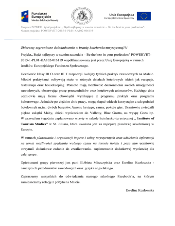 Program POWER , tytuł projektu: ,, Bądź najlepszy w swoim zawodzie – Be the best in your profession". Numer projektu: POWERVET-2015-1-PL01-KA102-016119 Zbieramy zagraniczne doświadczenia w branży hotelarsko-turystycznej!!! Projekt,, Bądź najlepszy w swoim zawodzie – Be the best in your profession" POWERVET2015-1-PL01-KA102-016119 współfinansowany jest przez Unię Europejską w ramach środków Europejskiego Funduszu Społecznego. Uczniowie klasy III O oraz III T rozpoczęli kolejny tydzień praktyk zawodowych na Malcie. Młodzi praktykanci odbywają staże w różnych działach hotelowych takich jak recepcja, restauracja oraz housekeeping. Ponadto mają możliwość doskonalenia swoich umiejętności zawodowych, obserwując pracę przewodników oraz hotelowych animatorów. Każdego dnia uczniowie mają liczne obowiązki wynikające z programu praktyk oraz programu kulturowego. Jednakże po ciężkim dniu pracy, mogą złapać oddech korzystając z udogodnień hotelowych m.in.: dwóch basenów, basenu krytego, sauny, pokoju gier. Uczniowie zwiedzili piękne zakątki Malty, dzięki wycieczkom do Valletty, Blue Grotto, na wyspę Gozo itp. W przyszłym tygodniu zaplanowano wizytę w szkole hotelarsko-turystycznej ,, Institute of Tourism Studies” w St. Julians, która uważana jest za najlepszą placówkę szkoleniową w Europie. W ramach planowania i organizacji imprez i usług turystycznych oraz udzielania informacji na temat możliwości spędzania wolnego czasu na terenie hotelu i poza nim uczniowie otrzymali dodatkowe zadanie do zrealizowania- zaplanowanie dodatkowej wycieczkę dla całej grupy. Opiekunami grupy pierwszej jest pani Elżbieta Miszczyńska oraz Ewelina Kozłowska nauczyciele przedmiotów zawodowych oraz języka angielskiego. Zapraszamy wszystkich do odwiedzania naszego szkolnego Facebook’a, na którym zamieszczamy relację z pobytu na Malcie. Ewelina Kozłowska