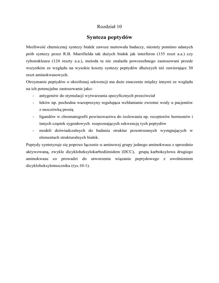 Rozdział 10 Synteza peptydów MoŜliwość chemicznej syntezy białek zawsze nurtowała badaczy, niestety pomimo udanych prób syntezy przez R.B. Marrifielda tak duŜych białek jak interferon (155 reszt a.a.) czy rybonukleaza (124 reszty a.a.), metoda ta nie znalazła powszechnego zastosowani przede wszystkim ze względu na wysokie koszty syntezy peptydów dłuŜszych niŜ zawierające 30 reszt aminokwasowych. Otrzymanie peptydów o określonej sekwencji ma duŜe znaczenie między innymi ze względu na ich potencjalne zastosowanie jako: - antygenów do stymulacji wytwarzania specyficznych przeciwciał - leków np. pochodna wazopresyny regulująca wchłanianie zwrotne wody u pacjentów z moczówką prostą - ligandów w chromatografii powinowactwa do izolowania np. receptorów hormonów i innych cząstek sygnałowych rozpoznających sekwencję tych peptydów - modeli doświadczalnych do badania struktur przestrzennych występujących w elementach strukturalnych białek. Peptydy syntetyzuje się poprzez łączenie α aminowej grupy jednego aminokwasu z uprzednio aktywowaną, zwykle dicykloheksylokarbodiimidem (DCC), grupą karboksylowa drugiego aminokwasu co prowadzi do dicykloheksylomocznika (rys.10-1). utworzenia wiązania peptydowego z uwolnieniem Rysunek 10-1: Aktywacja grupy karkoksylowej dicykloheksylokarbodiimidem w celu utworzenia wiązania peptydowego. W czasie reakcji wszystkie pozostałe, potencjalne reaktywne grupy, muszą być chemicznie zablokowane np. grupa α aminowa aminokwasu z aktywowaną DCC grupą karboksylowa, grupy ε aminowe lizyny etc., przy czym ta protekcja po przeprowadzeniu reakcji kondensacji musi być łatwo usuwalna. Grypa α aminowa jest w syntezie peptydów zwykle blokowana czwartorzędowa grupą tert-butylokarboksykarbonową (t-Boc) lub 9-fluorenylometoksy karbonylową (Fmoc) (rys. 10-2A i B). Rysunek 10-2 A i B: Schemat syntezy peptydów w fazie stałej. Pierwsza modyfikacja jest usuwana przy pomocy rozcieńczonego kwas trifluorooctowego (TFA), a deprotekcja drugiej, z uwagi na nietrwałość połączenia w środowisku zasadowym, następuje przez 20% roztworze piperydyny w N,N-dimetyloformamidzie. Peptydy zwykle syntetyzuje się metodą fazy stałej na aktywowanej Ŝywicy polisterynowej (chlorometylopolistyren lub aminometylopolistyren) zaproponowaną w 1962 roku przez R.B. Marrifielda. Do wydłuŜającego się od C-końca łańcucha polipeptydowego związanego z podłoŜem polistyrenu dodaje się stopniowo kolejne aktywowane DCC (rys. 10-3). t-Boc (lub Fmoc) aminokwasy Rysunek 10-3: Ogólny schemat syntezy peptydów. Główną zaleta tej metody jest moŜliwość dokładnego przemycia od reagentów produktu reakcji, po jej zakończeniu bez konieczności zastosowania pracochłonnego i niewydajnego procesu oczyszczania produktów pośrednich. Najpierw do ziaren polistyrenu (zwykle jest to polistyren modyfikowany 1% diwinylobenzenem o ziarnach 50-100 µm) przyłącza się Ckońcowy aminokwas poŜądanego peptydu blokowany na grupie aminowej (rys. 10-3), a następnie po usunięciu grupy ochronnej i przemyciu złoŜa dodaje się kolejny aminokwas w formie t-Boc, aktywuje DCC jego grupę –COOH i po utworzeniu wiązania peptydowego i odmyciu nadmiaru odczynników przyłącza się w tej samej kolejności reakcji następny aminokwas. Po zakończeniu syntezy peptydu uwalnia się go z ziaren polistyrenu przez dodanie stęŜonego TFA, który nie naruszając wiązań peptydowych, uwalnia peptyd i odblokowuje równocześnie grupę aminową ostatniego dołączonego aminokwasu oraz zablokowane ε aminowe grupy lizyny.
