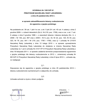 UCHWAŁA Nr 129/12/P-VI PREZYDIUM NACZELNEJ RADY LEKARSKIEJ z dnia 25 października 2012 r. w sprawie zakwalifikowania lekarzy cudzoziemców do egzaminu z języka polskiego Na podstawie art. 39 ust. 1 pkt 4 w zw. z art. 5 pkt 24 i art. 40 ust. 4 ustawy z dnia 2 grudnia 2009 r. o izbach lekarskich (Dz.U. Nr 219, poz. 1708), oraz w zw. z art. 7 ust. 6 ustawy z dnia 5 grudnia 1996 r. o zawodach lekarza i lekarza dentysty (Dz. U. z 2008 r. Nr 136, poz. 857 oraz z 2009 r. Nr 6, poz. 33, Nr 22, poz. 120, Nr 40, poz. 323, Nr 76, poz. 641 i Nr 219, poz. 1706 i 1708), oraz § 1 uchwały Nr 2/10/VI Naczelnej Rady Lekarskiej z dnia 12 lutego 2010 r. w sprawie upoważnienia Prezydium Naczelnej Rady Lekarskiej do działania w imieniu Naczelnej Rady Lekarskiej i § 1 ust 2 uchwały Nr 214/11/P-VI Prezydium Naczelnej Rady Lekarskiej z dnia 18 listopada 2011 r. w sprawie ustalenia terminów przeprowadzenia egzaminów z języka polskiego dla lekarzy cudzoziemców w 2012 r., zmienionej uchwałą Nr 85/12/P-VI Prezydium Naczelnej Rady Lekarskiej z dnia 6 lipca 2012 r., uchwala się, co następuje: § 1. Dopuszcza się do egzaminu z języka polskiego w dniu 25 października 2012 r. lekarzy cudzoziemców wymienionych w załączniku do uchwały. § 2. Uchwała wchodzi w życie z dniem podjęcia. Załącznik do uchwały PNRL Nr 129/12/P-VI z dnia 25.10. 2012 r. Lista lekarzy cudzoziemców zakwalifikowanych do egzaminu z języka polskiego w dniu 25 października 2012 r. 1. Andrzej Krasowski 2. Mariana Kułak 3. Andrij Hanejczuk 4. Witali Kostusiew 5. Aleksander Brunets 6. Natalia Brunets 7. Maryna Dykan 8. Mariia Kretska 9. Rostyslav Ostapchuk 10. Svyatoslav Ostapchuk 11. Igor Olijnyk 12. Alina Shevchuk Ukraina Ukraina Ukraina Białoruś Ukraina Ukraina Ukraina Ukraina Ukraina Ukraina Ukraina Ukraina Lista rezerwowa 1. Tetyana Ostroushko 2. Olena Kałuska Ukraina Ukraina 2