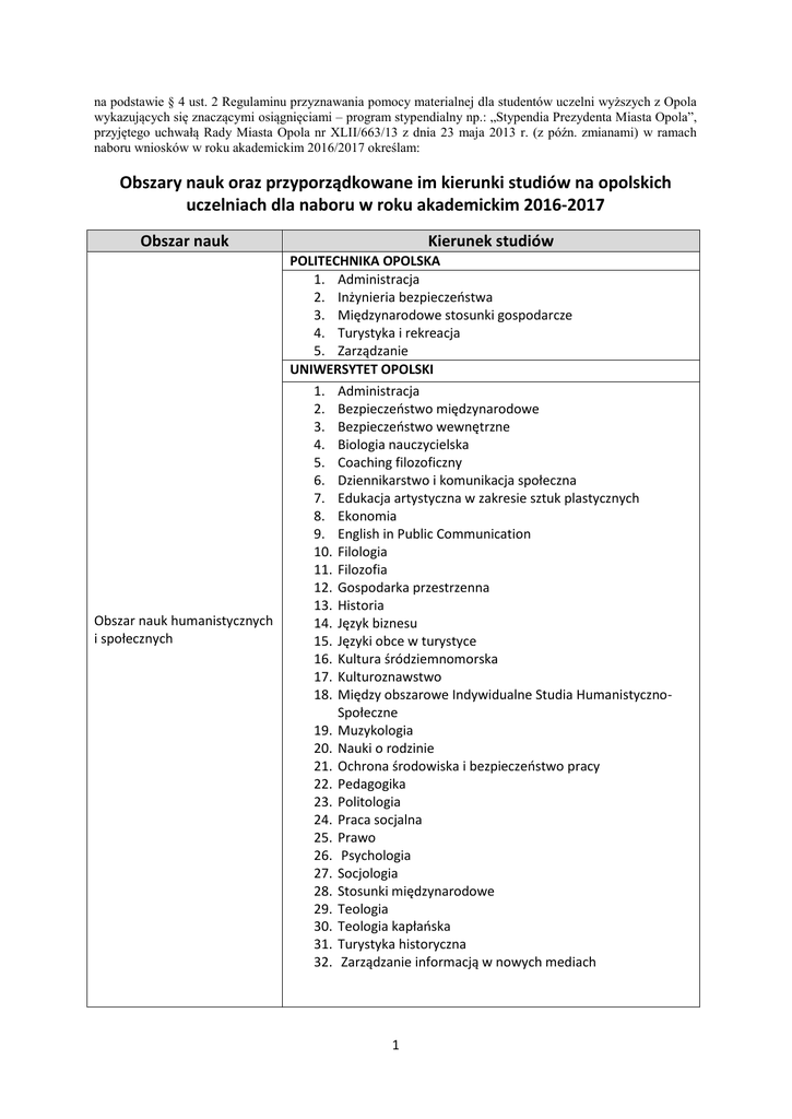 na podstawie § 4 ust. 2 Regulaminu przyznawania pomocy materialnej dla studentów uczelni wyższych z Opola wykazujących się znaczącymi osiągnięciami – program stypendialny np.: „Stypendia Prezydenta Miasta Opola”, przyjętego uchwałą Rady Miasta Opola nr XLII/663/13 z dnia 23 maja 2013 r. (z późn. zmianami) w ramach naboru wniosków w roku akademickim 2016/2017 określam: Obszary nauk oraz przyporządkowane im kierunki studiów na opolskich uczelniach dla naboru w roku akademickim 2016-2017 Obszar nauk Kierunek studiów POLITECHNIKA OPOLSKA 1. Administracja 2. Inżynieria bezpieczeństwa 3. Międzynarodowe stosunki gospodarcze 4. Turystyka i rekreacja 5. Zarządzanie UNIWERSYTET OPOLSKI Obszar nauk humanistycznych i społecznych 1. 2. 3. 4. 5. 6. 7. 8. 9. 10. 11. 12. 13. 14. 15. 16. 17. 18. 19. 20. 21. 22. 23. 24. 25. 26. 27. 28. 29. 30. 31. 32. Administracja Bezpieczeństwo międzynarodowe Bezpieczeństwo wewnętrzne Biologia nauczycielska Coaching filozoficzny Dziennikarstwo i komunikacja społeczna Edukacja artystyczna w zakresie sztuk plastycznych Ekonomia English in Public Communication Filologia Filozofia Gospodarka przestrzenna Historia Język biznesu Języki obce w turystyce Kultura śródziemnomorska Kulturoznawstwo Między obszarowe Indywidualne Studia HumanistycznoSpołeczne Muzykologia Nauki o rodzinie Ochrona środowiska i bezpieczeństwo pracy Pedagogika Politologia Praca socjalna Prawo Psychologia Socjologia Stosunki międzynarodowe Teologia Teologia kapłańska Turystyka historyczna Zarządzanie informacją w nowych mediach 1 Obszar nauk Kierunek studiów Szkoła Wyższa im. Bogdana Jańskiego 1. Zarządzanie Obszar nauk ścisłych i technicznych Wyższa Szkoła Zarządzania i Administracji 1. Administracja 2. Ekonomia 3. Finanse i rachunkowość 4. Pedagogika 5. Zarządzanie WYŻSZA SZKOŁA BANKOWA 1. Administracja i bezpieczeństwo wewnętrzne 2. Finanse i rachunkowość 3. Pedagogika 4. Prawo w biznesie 5. Turystyka 6. Zarządzanie POLITECHNIKA OPOLSKA 1. Architektura 2. Automatyka i robotyka 3. Budownictwo 4. Elektronika przemysłowa 5. Elektrotechnika 6. Energetyka 7. Informatyka 8. Inżynieria i aparatura procesów przemysłowych 9. Inżynieria środowiska 10. Logistyka 11. Mechanika i budowa maszyn 12. Mechatronika 13. Przemysłowe technologie informatyczne 14. Systemy biotechniczne 15. Technologie energetyki odnawialnej 16. Transport 17. Zarządzanie i inżynieria produkcji UNIWERSYTET OPOLSKI 1. Architektura krajobrazu 2. Biotechnologia 3. Chemia biologiczna 4. Chemia nowoczesnych materiałów 5. Inżynieria środowiska 6. Logistyka 7. Matematyka 8. Odnawialne źródła energii Wyższa Szkoła Zarządzania i Administracji 1. Logistyka WYŻSZA SZKOŁA BANKOWA 1. Inżynieria zarządzania 2. Logistyka inżynierska 2 Obszar nauk Kierunek studiów POLITECHNIKA OPOLSKA 1. Fizjoterapia 2. Technologia żywności i żywienie człowieka 3. Wychowanie fizyczne UNIWERSYTET OPOLSKI obszar nauk przyrodniczych, obszar nauk rolniczych, leśnych i weterynaryjnych, obszar nauk medycznych i nauk o zdrowiu oraz nauk o kulturze fizycznej 1. Biologia 2. Biologia eksperymentalna i stosowana 3. Biologia medyczna 4. Biotechnologia kosmetologiczna 5. Biotechnologia medyczna 6. Chemia i analityka żywności 7. Chemia kosmetyczna 8. Fizyka medyczna 9. Inżynieria biomedyczna 10. Ochrona środowiska PAŃSTWOWA MEDYCZNA WYŻSZA SZKOŁA ZAWODOWA 1. 2. 3. 4. 5. Dietetyka Fizjoterapia Kosmetologia Pielęgniarstwo Położnictwo 3