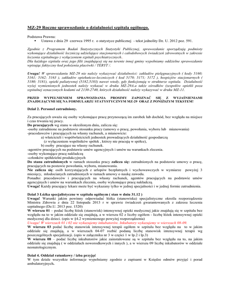 MZ-29 Roczne sprawozdanie o działalności szpitala ogólnego. Podstawa Prawna: Ustawa z dnia 29 czerwca 1995 r. o statystyce publicznej - tekst jednolity Dz. U. 2012 poz. 591. Zgodnie z Programem Badań Statystycznych Statystyki Publicznej, sprawozdanie sporządzają podmioty wykonujące działalność leczniczą udzielające stacjonarnych i całodobowych świadczeń zdrowotnych w zakresie leczenia szpitalnego z wyłączeniem szpitali psychiatrycznych.. Dla każdego szpitala oraz jego filii znajdującej się na terenie innej gminy wypełniamy oddzielne sprawozdanie wpisując faktyczny kod położenia placówki / TERYT /. Uwaga! W sprawozdaniu MZ-29 nie należy wykazywać działalności: zakładów pielęgnacyjnych ( kody 5160; 5161; 5162; 5163 ), zakładów opiekuńczo-leczniczych ( kod 5170; 5171; 5172 ), hospicjów stacjonarnych ( 5180; 5181), opieki paliatywnej (5182,5183) nawet wtedy, gdy funkcjonują w strukturze szpitala. Działalność wyżej wymienionych jednostek należy wykazać w druku MZ-29A.a także ośrodków (zespołów opiekli poza szpitalnej oznaczonych kodami od 2130-2740, których działalność należy wykazywać w druku MZ-11. PRZED WYPEŁNIENIEM SPRAWOZDANIA PROSIMY ZAPOZNAĆ SIĘ Z WYJAŚNIENIAMI ZNAJDUJĄCYMI SIĘ NA FORMULARZU STATYSTYCZNYM MZ-29 ORAZ Z PONIŻSZYM TEKSTEM! Dział 2. Personel zatrudniony. Za pracujących uważa się osoby wykonujące pracę przynoszącą im zarobek lub dochód, bez względu na miejsce i czas trwania tej pracy. Do pracujących wg stanu w określonym dniu, zalicza się: -osoby zatrudnione na podstawie stosunku pracy (umowy o pracę, powołania, wyboru lub mianowania) -pracodawców i pracujących na własny rachunek, a mianowicie: a) właścicieli i współwłaścicieli jednostek prowadzących działalność gospodarczą (z wyłączeniem wspólników spółek , którzy nie pracują w spółce), b) osoby pracujące na własny rachunek. -agentów pracujących na podstawie umów agencyjnych i umów na warunkach zlecenia. -osoby wykonujące pracę nakładczą -członków spółdzielni produkcyjnych Do stanu zatrudnionych w ramach stosunku pracy zalicza się: zatrudnionych na podstawie umowy o pracę, pracujących na postawie powołania, wyboru, mianowania. Nie zalicza się: osób korzystających z urlopów bezpłatnych i wychowawczych w wymiarze powyżej 3 miesięcy, młodocianych zatrudnionych w ramach umowy o naukę zawodu. Ponadto: pracodawców i pracujących na własny rachunek, agentów pracujących na podstawie umów agencyjnych i umów na warunkach zlecenia, osoby wykonujące pracę nakładczą. Uwaga! Każdy pracujący lekarz może być wykazany tylko w jednej specjalności i w jednej formie zatrudnienia. Dział 3 Łóżka specjalistyczne w szpitalu ogólnym ( stan w dniu 31.12 ) Uwaga! Warunki jakim powinny odpowiadać łóżka (stanowiska) specjalistyczne określa rozporządzenie Ministra Zdrowia z dnia 22 listopada 2013 r w sprawie świadczeń gwarantowanych z zakresu leczenia szpitalnego (Dz.U. 2013 poz. 1520) W wierszu 01 – podać liczbę łóżek (stanowisk) intensywnej opieki medycznej jakie znajdują się w szpitalu bez względu na to w jakim oddziale się znajdują, a w wierszu 02 z liczby ogółem - liczbę łóżek intensywnej opieki medycznej dla dzieci. (opis w §4.2 wymienionego powyżej rozporządzenia) Uwaga! W wierszach 01 i 02 nie wykazujemy inkubatorów. Inkubatory wykazujemy w wierszach 08-09. W wierszu 03 podać liczbę stanowisk intensywnej terapii ogółem w szpitalu bez względu na to w jakim oddziale się znajdują, a w wierszach 04-07 rozbić podaną liczbę stanowisk intensywnej terapii wg poszczególnych specjalizacji. (opis w załączniku nr 3 w części 1 w lp.2 i lp.3) W wierszu 08 – podać liczbę inkubatorów jakie zainstalowane są w szpitalu bez względu na to, na jakim oddziale się znajdują ( w oddziałach noworodkowych i innych ), a w wierszu 09 liczbę inkubatorów w oddziale neonatologicznym. Dział 4. Oddział ratunkowy / izba przyjęć W tym dziale wszystkie informacje wypełniamy zgodnie z zapisami w Księdze odmów przyjęć i porad ambulatoryjnych. W wierszu 05 – należy wykazać wszystkie porady (z zakresu podstawowej opieki zdrowotnej i specjalistycznej), których udzielono w izbie przyjęć. Dział 5. Sale operacyjne W wierszu 01 wykazać liczbę sal operacyjnych, a w wierszu 02 liczbę stołów operacyjnych. W wierszach od 3 do 6 wykazać liczbę zabiegów wykonanych w trybie stacjonarnym i dziennym. Dział 7. Działalność oddziałów. Każdy z oddziałów należy wykazać imiennie w oddzielnym wierszu, wpisując jego nazwę zgodną ze statutem oraz jego kod resortowy (zgodnie z w/w rozporządzeniem). Znakiem „+” dodajemy nowy wiersz w celu wpisania kolejnego oddziału. Jeśli w szpitalu występuje więcej niż jeden oddział tego samego rodzaju, działalność każdego z nich należy wpisać w oddzielnych wierszach. W sprawozdaniu należy wykazać łóżka i działalność oddziałów psychiatrycznych znajdujących się w szpitalach ogólnych Szpitalny oddział ratunkowy / kod 4902-3/ - jeśli pobyt pacjenta wynosił nie więcej niż 24 godziny, pobyt pacjenta powinien być wykazany jako leczenie w trybie dziennym, jeśli pobyt wynosił ponad 24 godziny, jako leczenie stacjonarne. Liczba leczonych ogółem w Dziale VII / z ruchem międzyoddziałowym / powinna być równa lub większa od liczby leczonych ogółem wykazanych w Dziale VIII / bez ruchu międzyoddziałowego /. W kolumnie 2 wykazujemy liczbę miejsc w oddziałach dziennych (kod 4670), a także liczbę miejsc dziennych wydzielonych w oddziałach stacjonarnych W polu 3 należy wykazywać liczbę leczonych w trybie dziennym. UWAGA! Danych wykazanych w kolumnach 2 i 3 Nie należy wykazywać powtórnie w kolumnach od 4do 10.. Leczonych w trybie dziennym nie wykazujemy powtórnie w kolumnie 8 a osobodni w kolumnie 10. Dział 8. Ruch chorych. A). W tej tabeli każdego pacjenta wykazujemy jeden raz w trakcie pobyt