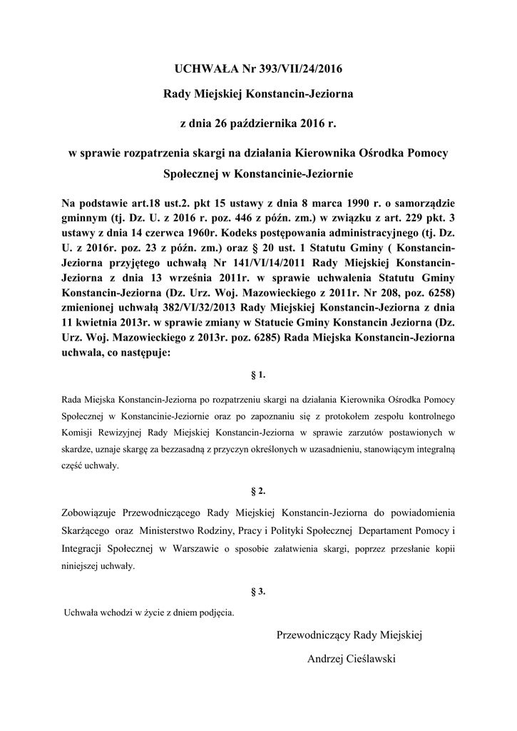UCHWAŁA Nr 393/VII/24/2016 Rady Miejskiej Konstancin-Jeziorna z dnia 26 października 2016 r. w sprawie rozpatrzenia skargi na działania Kierownika Ośrodka Pomocy Społecznej w Konstancinie-Jeziornie Na podstawie art.18 ust.2. pkt 15 ustawy z dnia 8 marca 1990 r. o samorządzie gminnym (tj. Dz. U. z 2016 r. poz. 446 z późn. zm.) w związku z art. 229 pkt. 3 ustawy z dnia 14 czerwca 1960r. Kodeks postępowania administracyjnego (tj. Dz. U. z 2016r. poz. 23 z późn. zm.) oraz § 20 ust. 1 Statutu Gminy ( KonstancinJeziorna przyjętego uchwałą Nr 141/VI/14/2011 Rady Miejskiej KonstancinJeziorna z dnia 13 września 2011r. w sprawie uchwalenia Statutu Gminy Konstancin-Jeziorna (Dz. Urz. Woj. Mazowieckiego z 2011r. Nr 208, poz. 6258) zmienionej uchwałą 382/VI/32/2013 Rady Miejskiej Konstancin-Jeziorna z dnia 11 kwietnia 2013r. w sprawie zmiany w Statucie Gminy Konstancin Jeziorna (Dz. Urz. Woj. Mazowieckiego z 2013r. poz. 6285) Rada Miejska Konstancin-Jeziorna uchwala, co następuje: § 1. Rada Miejska Konstancin-Jeziorna po rozpatrzeniu skargi na działania Kierownika Ośrodka Pomocy Społecznej w Konstancinie-Jeziornie oraz po zapoznaniu się z protokołem zespołu kontrolnego Komisji Rewizyjnej Rady Miejskiej Konstancin-Jeziorna w sprawie zarzutów postawionych w skardze, uznaje skargę za bezzasadną z przyczyn określonych w uzasadnieniu, stanowiącym integralną część uchwały. § 2. Zobowiązuje Przewodniczącego Rady Miejskiej Konstancin-Jeziorna do powiadomienia Skarżącego oraz Ministerstwo Rodziny, Pracy i Polityki Społecznej Departament Pomocy i Integracji Społecznej w Warszawie o sposobie załatwienia skargi, poprzez przesłanie kopii niniejszej uchwały. § 3. Uchwała wchodzi w życie z dniem podjęcia. Przewodniczący Rady Miejskiej Andrzej Cieślawski UZASADNIENIE do uchwały Nr 393/VII/24/2016 Rady Miejskiej Konstancin-Jeziorna z dnia 26 października 2016r. w sprawie rozpatrzenia skargi na działania Kierownika Ośrodka Pomocy Społecznej w Konstancinie-Jeziornie Zespół Kontrolny Komisji Rewizyjnej Rady Miejskiej Konstancin-Jeziorna dokonał badania skargi przekazanej na podstawie wniosku Rady Miejskiej Konstancin-Jeziorna, podjętego podczas obrad XXII sesji w dniu 07 września 2016 roku. Skargę rozpatrzył zespół kontrolny w składzie: Adam Grzegorzewski Arkadiusz Zewar Skarżący wniósł skargę na działania Ośrodka Pomocy Społecznej w KonstancinieJeziornie do Ministerstwa Rodziny, Pracy i Polityki Społecznej Departament Pomocy i Integracji Społecznej w Warszawie. Pismem z dnia 27 lipca 2016r.DPS.I.052.24.2016.MD Ministerstwo przekazało powyższą skargę do rozpatrzenia przez Radę Miejską Konstancin-Jeziorna, jako organu właściwego. Skarga dotyczy odmowy przyznania zasiłku celowego przez Ośrodek Pomocy Społecznej. Komisja Rewizyjna Konstancin-Jeziorna po zapoznaniu się z aktami sprawy uznaje skargę na działania Ośrodka Pomocy Społecznej za bezzasadną z następujących przyczyn: Skarżący mieszka z żoną i synem w mieszkaniu komunalnym. Żona utrzymuje się ze świadczenia emerytalnego, prowadzi osobne gospodarstwo domowe. Syn, pełnoletni, jest bezrobotny – niezarejestrowany w Biurze Pracy. Obecnie Skarżący otrzymuje zgodnie z ustawą z dnia 12 marca 2004 r. o pomocy społecznej: zasiłek stały, zasiłek pielęgnacyjny, dodatek mieszkaniowy oraz zasiłki celowe na leki, odzież a także za energię elektryczną w wysokości 1/3 kwoty faktury ze środków Ośrodka Pomocy Społecznej. Skarżący korzysta z opieki pomocy społecznej od ponad 20 lat. Posiada znaczny stopień niepełnosprawności i z tego tytułu otrzymuje zasiłek stały i pielęgnacyjny. Ośrodek Pomocy Społecznej opłaca również Skarżącemu składkę na ubezpieczenie zdrowotne. Analiza wysokości dochodu Skarżącego wykazała, iż dochód przekracza kwotę, która kwalifikuje się do otrzymania zasiłku celowego. Skarżący objęty jest całościową opieką społeczną. Ośrodek Pomocy Społecznej zabezpiecza niezbędne potrzeby bytowe Skarżącego w ramach posiadanych środków finansowych, na tyle, na ile pozwalają przepisy ustawy o pomocy społecznej. Ponadto Skarżący przedkłada miesięczne faktury na leki, które pokrywane są w całości przez Ośrodek Pomocy. Otrzymuje również raz na kwartał zasiłek w wysokości 200 zł z przeznaczeniem na zakup odzieży. Otrzymuje także dodatek mieszkaniowy przekazywany bezpośrednio na konto Zakładu Gospodarki Komunalnej w Konstancinie-Jeziornie. Zespół kontrolny Komisji Rewizyjnej z dokonanej analizy dokumentów i ustnych wyjaśnień kierownika Ośrodka Pomocy Społecznej uznał, iż Skarżący otrzymuje pomoc finansową zgodnie z ustawą o pomocy społecznej i tym samym zaspokojone ma niezbędne potrzeby bytowe. Należy podkreślić, że rozstrzygnięcie w sprawie zasiłku celowego przyznawane jest w ramach uznania administracyjnego. Decyzja o przyznaniu lub odmowie przyznania zasiłku celowego ma charakter uznaniowy. Tym samym nawet spełnienie przez ubiegającego się o zasiłek kryteriów przewidzianych w ustawie, nie oznacza roszczenia o przyznanie świadczenia w określonej przez Skarżącego wysokości. Ośrodek Pomocy Społecznej rozpoznając wniosek o przyznanie zasiłku celowego musi mieć na względzie nie tylko interes osoby wnioskującej, lecz także interesy innych osób będących w trudnej sytuacji materialnej . Uznanie administracyjne obejmuje ocenę warunków uzasadniających przyznanie pomocy, jak również decyzję co do jej wysokości. Jeśli organ pomocy społecznej ocenił z jednej strony sytuację materialną oraz potrzeby strony, a z drugiej własne możliwości finansowe i uznał, że nie istnieje możliwość przyznania stronie zasiłku celowego, to decyzji takiej nie można zarzucić naruszenia prawa. Biorąc powyższe fakty pod uwagę Komisja Rewizyjna uznała, iż skarga na działanie Ośrodka Pomocy Społecznej Konstancin-Jeziorny w przedmiocie nieprzyznania zasiłku c