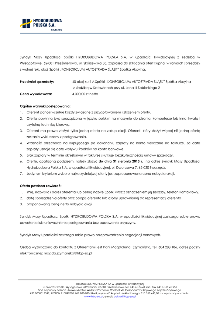 Syndyk Masy Upadłości Spółki HYDROBUDOWA POLSKA S.A. w upadłości likwidacyjnej z siedzibą w Wysogotowie, 62-081 Przeźmierowo, ul. Skórzewska 35, zaprasza do składania ofert kupna, w ramach sprzedaży z wolnej ręki, akcji Spółki „KONSORCJUM AUTOSTRADA ŚLĄSK” Spółka Akcyjna. Przedmiot sprzedaży: 40 akcji serii A Spółki „KONSORCJUM AUTOSTRADA ŚLĄSK” Spółka Akcyjna z siedzibą w Katowicach przy ul. Jana III Sobieskiego 2 Cena wywoławcza: 4.000,00 zł netto Ogólne warunki postępowania: 1. Oferent ponosi wszelkie koszty związane z przygotowaniem i złożeniem oferty. 2. Oferta powinna być sporządzona w języku polskim na maszynie do pisania, komputerze lub inną trwałą i czytelną techniką biurową. 3. Oferent ma prawo złożyć tylko jedną ofertę na zakup akcji. Oferent, który złożył więcej niż jedną ofertę zostanie wykluczony z postępowania. 4. Własność przechodzi na kupującego po dokonaniu zapłaty na konto wskazane na fakturze. Za datę zapłaty uznaje się datę wpływu środków na konto bankowe. 5. Brak zapłaty w terminie określonym w fakturze skutkuje bezskutecznością umowy sprzedaży. 6. Ofertę, opatrzoną podpisem, należy złożyć do dnia 31 sierpnia 2013 r. na adres Syndyk Masy Upadłości Hydrobudowa Polska S.A. w upadłości likwidacyjnej, ul. Dworcowa 7, 62-020 Swarzędz. 7. Jedynym kryterium wyboru najkorzystniejszej oferty jest zaproponowana cena nabycia akcji. Oferta powinna zawierać: 1. imię, nazwisko i adres oferenta lub pełną nazwę Spółki wraz z oznaczeniem jej siedziby, telefon kontaktowy. 2. datę sporządzenia oferty oraz podpis oferenta lub osoby uprawnionej do reprezentacji oferenta 3. proponowaną cenę netto nabycia akcji Syndyk Masy Upadłości Spółki HYDROBUDOWA POLSKA S.A. w upadłości likwidacyjnej zastrzega sobie prawo odwołania lub unieważnienia postępowania bez podawania przyczyny. Syndyk Masy Upadłości zastrzega sobie prawo przeprowadzenia negocjacji cenowych. Osobą wyznaczoną do kontaktu z Oferentami jest Pani Magdalena Szymańska, tel. 604 288 186, adres poczty elektronicznej: [email protected] HYDROBUDOWA POLSKA SA w upadłości likwidacyjnej ul. Skórzewska 35, Wysogotowo k/Poznania, 62-081 Przeźmierowo, tel. +48 61 66 41 950, fax +48 61 66 41 951 Sąd Rejonowy Poznań - Nowe Miasto i Wilda w Poznaniu, Wydział VIII Gospodarczy Krajowego Rejestru Sądowego. KRS 0000017342, REGON 910097080, NIP 888-020-59-44, wysokość kapitału zakładowego: 210 558 445,00 zł - wpłacony w całości. www.hbp-sa.pl, e-mail: [email protected]