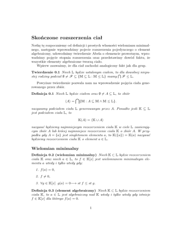 Definicja 0.2 (wielomian minimalny) Niech K ⊂ L będzie rozszerzeniem