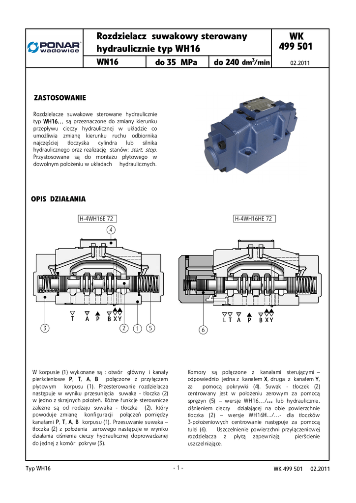 Rozdzielacz suwakowy sterowany hydraulicznie typ WH16 WN16 do 35 MPa WK 499 501 do 240 dm3/min 02.2011 ZASTOSOWANIE Rozdzielacze suwakowe sterowane hydraulicznie typ WH16… WH16… są przeznaczone do zmiany kierunku przepływu cieczy hydraulicznej w układzie co umożliwia zmianę kierunku ruchu odbiornika najczęściej tłoczyska cylindra lub silnika hydraulicznego oraz realizację stanów: start, stop. Przystosowane są do montażu płytowego w dowolnym położeniu w układach hydraulicznych. OPIS DZIAŁANIA H-4WH16E 72 H-4WH16HE 72 4 T 3 A P B XY L T A 2 1 5 B XY 6 W korpusie (1) wyk onane są : otwór główny i kanały pierścieniowe P , T, A, B połączone z przyłączem płytowym korpusu (1). Przesterowanie rozdzielacza następuje w wyniku przesunięcia suwaka - tłoczka (2) w jedno z skrajnych położeń. Różne funkcje sterownicze zależne są od rodzaju suwaka - tłoczka (2), który powoduje zmianę konfiguracji połączeń pomiędzy kanałami P , T , A, B korpusu (1). Przesuwanie suwaka – tłoczka (2) z położenia zerowego następuje w wyniku działania ciśnienia cieczy hydraulicznej doprowadzanej do jednej z komór pokryw (3). Typ WH16 P Komory są połączone z kanałami sterującymi – odpowiednio jedna z kanałem X, druga z kanałem Y , za pomocą pokrywki (4). Suwak - tłoczek (2) centrowany jest w położeniu zerowym za pomocą sprężyn (5) – wersje WH16…/… lub hydraulicznie, ciśnieniem cieczy działającej na obie powierzchnie tłoczka (2) – wersje WH16H H .../…- dla tłoczków 3-położeniowych centrowanie następuje za pomocą tulei (6). Uszczelnienie powierzchni przyłączeniowej rozdzielacza z płytą zapewniają pierścienie uszczelniające. -1- WK 499 501 02.2011 OPIS DZIAŁANIA ...WH16E 72/... 18 18... ...WH16E 72/...11... ...WH16E 72/...S... 8 9 Rozdzielacze mogą być wyposażone w nastawnik czasu przesterowania (8), nastawnik skoku tłoczka (9), zespół kontroli krańcowych położeń tłoczka (10) 10 Możliwości montażu wyposażenia dodatkowego w zależności od wersji rozdzielacza uwidocznione są na ark. 3- 5 oraz 9 -13. DANE TECHNICZNE Ciecz hydrauliczna Rodzaj cieczy hydraulicznej Lepkość nominalna cieczy Zakres lepkości Zakres temperatury cieczy (w zbiorniku) Zakres temperatury otoczenia Wymag Wymaga agana fi f iltracj ltr acja acja ciec cieczy iec zy Zalecana filtracja cieczy olej mineralny 37mm2 /s 2,8 do 380 mm 2 /s o zalecany 40 C do 55 oC max -20 oC do +70 oC - 20 do +70 oC 16 16 µm 10 µm Max dop dopu opuszcz zczalne ci c iśnien ienie pracy pr acy kanały P, A, B: • wersja HH-4 WH 16.../.. 6... /.. . • wersja 4 WH 16.../... 6... /... k anał T 35 3 5 MPa 28 MPa 2 5 M Pa Max ciś ci śnien ienie stero s terow tero wania 25 M P a Min. ci ciśnien ienie stero sterow tero wania • rozdzielacze 3-położeniowe • rozdzielacze 2-położeniowe ustalane sprężyną • rozdzielacze 2-położeniowe ustalane hydraulicznie 0,8 MPa 1,0 MPa 0,5 MPa Objęto Objęt ość cieczy s terującej teruj ącej Rozdzielacz 3-położeniowy centrowany sprężynami Rozdzielacz 3-położeniowy centrowany hydraulicznie • z położenia 0 w położenie a • z położenia 0 w położenie b • z polożenia a w położenie 0 • z polożenia b w położenie 0 Rozdzielacz 2-położeniowy WK 499 501 02.2011 5,75 cm 3 2,85 cm 3 5,75 cm 3 2,9 cm 3 2,3 cm 3 11,5 cm 3 -2- Typ WH16 DANE TECHNICZNE Zespó espół kontrol tro li po p ołożen żenia tł t łocz oczka Rod Rodz odzaj cz c zujn ujników po p ołożen żenia Zakres nap n apięc apięci ięcia zasilania Max prąd pr ąd obci obc iążen żenia Rod odzzaj pr przy zyłłąc ączza cczzuj ujn R od zy nika Rod Rodz przył ącza prze przew odu cz czujn ujnika odzaj przy zyłącz zewodu zespó zblliże żen wych zesp ół 2 czuj cz ujn ujników indu ndukcyjnych, zb niowyc h P NP : norm orma n ormalnie zamk amknięty - NC N C (rozwierny) + norma ormalnie otwarty twarty - NO (zwierny) 10 1 0 - 30 V D C 200 mA czujnik z gwi gwintem zew ze wnętrz nętrznym M12 x 1; 4 bieg b iegu ieguny (piny piny) wtyczka z gwi gw intem wew we wnętrz nętr znym M12 x 1; 4 biegu ieguny guny (żeń żeńska) prosta - konfiguracja przyłącza wg PN-E N-EN-6 N-61076 -2-101 Średn Śred nica ica zew zewnętrz nętr zna prze przew zewodu odu Stop opie ień ochr hro St op ie ń oc hr ony φ 2,5 2, 5 - 6,5 6, 5 mm (PG7) IP I P 68 Masa rozdzielacza 7,5 kg WYPOSAŻENIE ROZDZIELACZA W WERSJACH PODSTAWOWYCH Nastawnik czasu przesterowania wersje: ...4WH16...72.S... ...4WH16...72/S2... ...4WH16...72/S2... Rozdzielacze typ ...WH16... mogą być wyposażone w montowany jako opcja nastawnik czasu przesterowania (zawór zwrotno-dławiący podwójny typ Z2FS 2FS6... wg karty katalogowej WK 450 232), który umożliwia regulację czasu przesterowania rozdzielacza. 3 1 ...4WH16...72/S... 2 Zmianę sposobu regulacji czasu przesterowania (dławienia przepływu): • na dopływie (wersja ...4WH16...72/S...) • na odpływie (wersja ...4WH16...72/S2...) uzyskuje się przy montażu przez obrót nastawnika czasu przesterowania (1) o 180 stopni wokół jego osi podłużnej. Zwiekszenie czasu przesterowania uzyskuje się przez obrót śruby nastawczej (3) w prawo a zmniejszenie czasu przez obrót sruby nastawczej (3) w lewo. Śruby M5 x 40 - 10.9 0. 9 wg PN/M-82302 - szt. 4 mocujące nastawnik (3) należy dokręcać momentem Md = 5 Nm . WK 499 501 02.2011 -3- 1 - Nastawnik czasu przesterowania z efektem regulacji czasu przesterowania na odpływie 2 - Sposób montażu nastawnika z efektem regulacji czasu przesterowania na dopływie 3 - Śruba nastawcza Typ WH16 WYPOSAŻENIE DODATKOWE ROZDZIELACZA Nastawnik skoku tłoczka ...4WH16...72/...12... Możliwości mo m ontaż tażu nasta stawnika skoku tłoc tłocz oczka: • nastawnik od strony kanałów A i B wersja...4WH16...72/...10... • nastawnik od strony kanału A wersja ...4WH16...72/...11... • nastawnik od strony kanału B wersja ...4WH16...72/...12... 10 (max) S 24 S6 2 Nastawianie skoku t