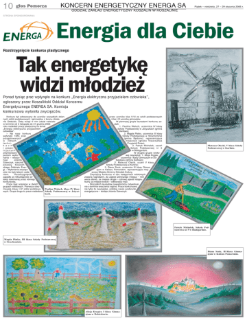 10 KONCERN ENERGETYCZNY ENERGA SA Pi¹tek – niedziela, 27 – 29 stycznia 2006 r. ODDZIA£ ZAK£AD ENERGETYCZNY KOSZALIN W KOSZALINIE STRONA SPONSOROWANA Energia dla Ciebie Tak energetykę widzi młodzież Rozstrzygniêcie konkursu plastycznego Ponad tysi¹c prac wp³ynê³o na konkurs „Energia elektryczna przyjacielem cz³owieka”, og³oszony przez Koszaliñski Oddzia³ Koncernu Energetycznego ENERGA SA. Komisja konkursowa wy³oni³a zwyciêzców. Konkurs by³ adresowany do uczniów wszystkich dziennych szkó³ podstawowych i gimnazjów z terenu dzia³ania Oddzia³u. ¯eby wzi¹æ w nim udzia³ nale¿a³o w terminie od 3 listopada do 31 grudnia 2005 roku nades³aæ pracê plastyczn¹ na temat „Energia elektryczna przyjacielem cz³owieka”. – Na nasz konkurs wp³ynê³o 1055 prac przygotowanych w ró¿nych technik a c h i prezentuj¹cych zró¿nicowany poziom wykonania – relacjonuje Jolanta Szewczyk, rzecznik prasowy Koszaliñskiego Oddzia³u Energi. – Wy³onienie zwyciêzców nie by³o ³atwym zadaniem. Rozstrzygniêcie zapad³o po kilkuetapowej selekcji dokonanej przez komisjê konkursow¹. Prace by³y oceniane w dwóch grupach wiekowych. Pierwsza obejmowa³a klasy I-IV szkó³ podstawo- Paulina Waluch, klasa IV klasy wych. Grupa druga to prace nades³ane Szko³y Podstawowej w Je¿yczkach. przez uczniów klas V-VI ze szkó³ podstawowych i klas I-III uczniów gimnazjów. W pierwszej grupie laureatami konkursu zostali: 1. Paulina Waluch, uczennica IV klasy Szko³y Podstawowej w Je¿yczkach (gmina Dar³owo); 2. Magda P³atko, uczennica III klasy Szko³y Podstawowej w Strachominie (gmina Bêdzino), reprezentuj¹ca miejscowe ognisko Towarzystwa Przyjació³ Dzieci; 3. Patryk Micha³ek, uczeñ Szko³y Podstawowej nr 5 w Bia³ogardzie. W drugiej grupie wiekowej zwyciê¿yli: 1. Alicja Krygier, uczennica I klasy Gimnazjum w Dobies³awiu (gmina Dar³owo); 2. Mateusz Olecki, uczeñ V klasy Szko³y Podstawowej w Karlinie; 3. Diana Szulc, uczennica III klasy Gimnazjum w Kaliszu Pomorskim, reprezentuj¹ca miejscowy Miejsko-Gminny Oœrodek Kultury. Zwyciêzcy konkursu w obu kategoriach wiekowych zostan¹ nagrodzeni. Za zajêcie pierwszego miejsca – mini wie¿a stereo, za miejsce drugie – cyfrowy aparat fotograficzny, za miejsce trzecie – odtwarzacz mp3. – Wszystkich laureatów powiadomimy indywidualnie o terminie wrêczenia nagród. Prace konkursowe, nie tylko te zwyciêskie, ozdobi¹ nasze posterunki energetyczne – dodaje Jolanta Szewczyk. Mateusz Olecki, V klasa Szko³y Podstawowej w Karlinie. Patryk Micha³ek, Szko³a Podstawowa nr 5 w Bia³ogardzie. Magda P³atko, III klasa Szko³y Podstawowej w Strachominie. Diana Szulc, III klasa Gimnazjum w Kaliszu Pomorskim. Alicja Krygier, I klasa Gimnazjum w Dobies³awiu.