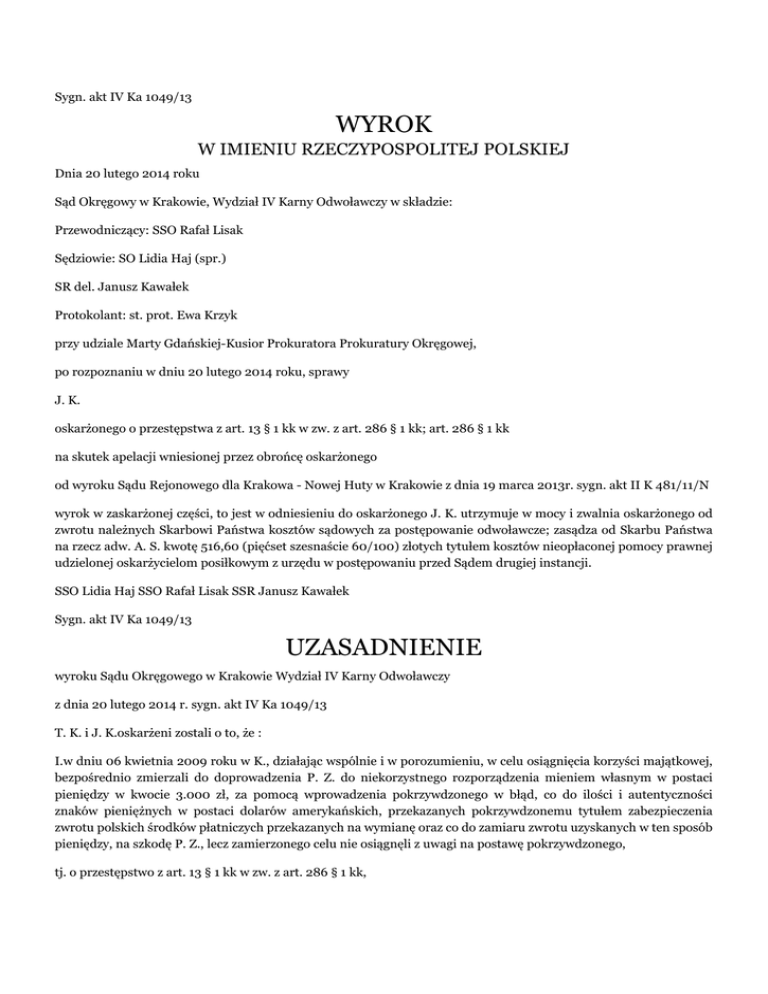 Sygn. akt IV Ka 1049/13 WYROK W IMIENIU RZECZYPOSPOLITEJ POLSKIEJ Dnia 20 lutego 2014 roku Sąd Okręgowy w Krakowie, Wydział IV Karny Odwoławczy w składzie: Przewodniczący: SSO Rafał Lisak Sędziowie: SO Lidia Haj (spr.) SR del. Janusz Kawałek Protokolant: st. prot. Ewa Krzyk przy udziale Marty Gdańskiej-Kusior Prokuratora Prokuratury Okręgowej, po rozpoznaniu w dniu 20 lutego 2014 roku, sprawy J. K. oskarżonego o przestępstwa z art. 13 § 1 kk w zw. z art. 286 § 1 kk; art. 286 § 1 kk na skutek apelacji wniesionej przez obrońcę oskarżonego od wyroku Sądu Rejonowego dla Krakowa - Nowej Huty w Krakowie z dnia 19 marca 2013r. sygn. akt II K 481/11/N wyrok w zaskarżonej części, to jest w odniesieniu do oskarżonego J. K. utrzymuje w mocy i zwalnia oskarżonego od zwrotu należnych Skarbowi Państwa kosztów sądowych za postępowanie odwoławcze; zasądza od Skarbu Państwa na rzecz adw. A. S. kwotę 516,60 (pięćset szesnaście 60/100) złotych tytułem kosztów nieopłaconej pomocy prawnej udzielonej oskarżycielom posiłkowym z urzędu w postępowaniu przed Sądem drugiej instancji. SSO Lidia Haj SSO Rafał Lisak SSR Janusz Kawałek Sygn. akt IV Ka 1049/13 UZASADNIENIE wyroku Sądu Okręgowego w Krakowie Wydział IV Karny Odwoławczy z dnia 20 lutego 2014 r. sygn. akt IV Ka 1049/13 T. K. i J. K.oskarżeni zostali o to, że : I.w dniu 06 kwietnia 2009 roku w K., działając wspólnie i w porozumieniu, w celu osiągnięcia korzyści majątkowej, bezpośrednio zmierzali do doprowadzenia P. Z. do niekorzystnego rozporządzenia mieniem własnym w postaci pieniędzy w kwocie 3.000 zł, za pomocą wprowadzenia pokrzywdzonego w błąd, co do ilości i autentyczności znaków pieniężnych w postaci dolarów amerykańskich, przekazanych pokrzywdzonemu tytułem zabezpieczenia zwrotu polskich środków płatniczych przekazanych na wymianę oraz co do zamiaru zwrotu uzyskanych w ten sposób pieniędzy, na szkodę P. Z., lecz zamierzonego celu nie osiągnęli z uwagi na postawę pokrzywdzonego, tj. o przestępstwo z art. 13 § 1 kk w zw. z art. 286 § 1 kk, II.nieustalonego dnia i miesiąca, jednak nie później niż w lutym 2009 roku w K., działając wspólnie i w porozumieniu, w celu osiągnięcia korzyści majątkowej, doprowadzili B. S. do niekorzystnego rozporządzenia mieniem własnym w postaci pieniędzy w kwocie 1.200 zł, za pomocą wprowadzenia pokrzywdzonego w błąd, co do ilości i autentyczności znaków pieniężnych w postaci dolarów amerykańskich, przekazanych pokrzywdzonemu tytułem zabezpieczenia zwrotu polskich środków płatniczych przekazanych na wymianę oraz co do zamiaru zwrotu uzyskanych w ten sposób pieniędzy, na szkodę B. S., tj. o przestępstwo z art. 286 § 1 kk, III.w dniu 14 marca 2009 roku w K., działając wspólnie i w porozumieniu z J. K., w celu osiągnięcia korzyści majątkowej, doprowadzili Z. D. do niekorzystnego rozporządzeniem mieniem własnym i żony D. D.w postaci pieniędzy w łącznej kwocie 32.000 zł, za pomocą wprowadzenia pokrzywdzonego w błąd, co do ilości i autentyczności znaków pieniężnych w postaci dolarów amerykańskich, przekazanych pokrzywdzonemu tytułem zabezpieczenia zwrotu polskich środków płatniczych przekazanych na wymianę oraz co do zamiaru zwrotu uzyskanych w ten sposób pieniędzy, na szkodę Z. D. i D. D., tj. o przestępstwo z art. 286 § 1 kk, a nadto J. K. oskarżony został o to, że: IV.w dniu 16 października 2008 roku w K., działając wspólnie i w porozumieniu z inną, nieustaloną osobą, co, do której materiały wyłączono do odrębnego prowadzenia, w celu osiągnięcia korzyści majątkowej, doprowadził J. S. do niekorzystnego rozporządzenia mieniem własnym w postaci pieniędzy w kwocie 2.800 zł, za pomocą wprowadzenia pokrzywdzonego w błąd, co do ilości i autentyczności znaków pieniężnych w postaci dolarów amerykańskich, przekazanych pokrzywdzonemu tytułem zabezpieczenia zwrotu polskich środków płatniczych przekazanych na wymianę oraz co do zamiaru zwrotu uzyskanych w ten sposób pieniędzy, na szkodę J. S., tj. o przestępstwo z art. 286 § 1 kk, Sąd Rejonowy dla Krakowa Nowej Huty w Krakowie wyrokiem z dnia 19 marca 2013 r. sygn. akt II K 481/11/N, orzekł w tym przedmiocie następująco : I.uznaje oskarżonych T. K. i J. K. za winnych tego, że w dniu 06 kwietnia 2009 roku w K., działając wspólnie i w porozumieniu, w celu osiągnięcia korzyści majątkowej, za pomocą wprowadzenia w błąd, co do zamiaru wymiany waluty obcej, tj. dolarów amerykańskich na polskie środki płatnicze usiłowali doprowadzić P. Z. do niekorzystnego rozporządzenia mieniem w postaci pieniędzy w kwocie 3.000,00 złotych, lecz zamierzonego celu nie osiągnęli z uwagi na postawę pokrzywdzonego, tj. popełnienia występku z art. 13 § 1 kk w zw. z art. 286 § 1 kk i za czyn ten na mocy art. 14 § 1 kk w zw. z art. 286 § 1 kk wymierza oskarżonym następujące kary, a to oskarżonej T. K. karę 8 (ośmiu) miesięcy pozbawienia wolności a oskarżonemu J. K. karę 8 (ośmiu) miesięcy pozbawienia wolności; II.uznaje oskarżonych T. K. i J. K. za winnych tego, że w nieustalonym dniu stycznia 2009r., bądź lutego 2009r. w K., działając wspólnie i w porozumieniu, w celu osiągnięcia korzyści majątkowej, za pomocą wprowadzenia w błąd, co do zamiaru wymiany waluty obcej, tj. dolarów amerykańskich na polskie środki płatnicze doprowadzili B. S. do niekorzystnego rozporządzenia mieniem własnym w postaci pieniędzy w kwocie 1.200,00 złotych, tj. popełnienia występku z art. 286 § 1 kk i za czyn ten na mocy art. 286 § 1 kk oraz na mocy art. 33 § 2 kk w zw. z art. 33 § 1 i 3 kk wymierza oskarżonym następujące kary, a to oskarżonej T. K. karę 10 (dziesięciu) miesięcy pozbawienia wolności oraz karę 50 (pięćdziesięciu) stawek dziennych grzywny, ustalając wysokość jednej stawki dziennej na kwotę 20,00 (dwudziestu 00/100) złotych a oskarżonemu J.