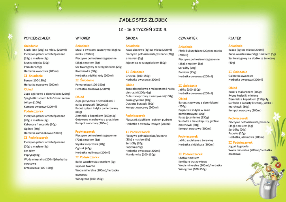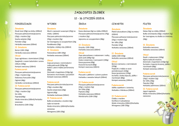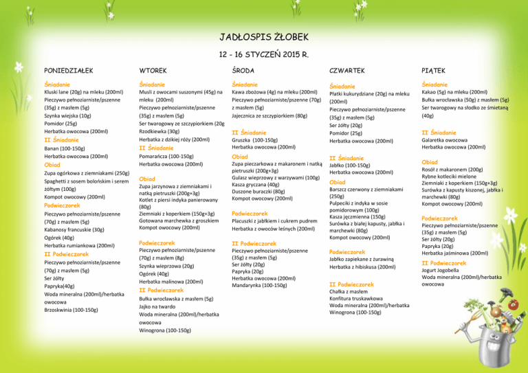 JADŁOSPIS ŻŁOBEK 12 - 16 STYCZEŃ 2015 R. PONIEDZIAŁEK WTOREK ŚRODA CZWARTEK PIĄTEK Śniadanie Kluski lane (20g) na mleku (200ml) Pieczywo pełnoziarniste/pszenne (35g) z masłem (5g) Szynka wiejska (10g) Pomidor (25g) Herbatka owocowa (200ml) Śniadanie Musli z owocami suszonymi (45g) na mleku (200ml) Pieczywo pełnoziarniste/pszenne (35g) z masłem (5g) Ser twarogowy ze szczypiorkiem (20g Rzodkiewka (30g) Herbatka z dzikiej róży (200ml) Śniadanie Kawa zbożowa (4g) na mleku (200ml) Pieczywo pełnoziarniste/pszenne (70g) z masłem (5g) Jajecznica ze szczypiorkiem (80g) Śniadanie Płatki kukurydziane (20g) na mleku (200ml) Pieczywo pełnoziarniste/pszenne (35g) z masłem (5g) Ser żółty (20g) Pomidor (25g) Herbatka owocowa (200ml) Śniadanie Kakao (5g) na mleku (200ml) Bułka wrocławska (50g) z masłem (5g) Ser twarogowy na słodko ze śmietaną (40g) II Śniadanie Banan (100-150g) Herbatka owocowa (200ml) Obiad Zupa ogórkowa z ziemniakami (250g) Spaghetti z sosem bolońskim i serem żółtym (100g) Kompot owocowy (200ml) Podwieczorek Pieczywo pełnoziarniste/pszenne (70g) z masłem (5g) Kabanosy francuskie (30g) Ogórek (40g) Herbatka rumiankowa (200ml) II Podwieczorek Pieczywo pełnoziarniste/pszenne (70g) z masłem (5g) Ser żółty Papryka(40g) Woda mineralna (200ml)/herbatka owocowa Brzoskwinia (100-150g) II Śniadanie Pomarańcza (100-150g) Herbatka owocowa (200ml) Obiad Zupa jarzynowa z ziemniakami i natką pietruszki (200g+3g) Kotlet z piersi indyka panierowany (80g) Ziemniaki z koperkiem (150g+3g) Gotowana marchewka z groszkiem Kompot owocowy (200ml) Podwieczorek Pieczywo pełnoziarniste/pszenne (70g) z masłem (8g) Szynka wieprzowa (20g) Ogórek (40g) Herbatka malinowa (200ml) II Podwieczorek Bułka wrocławska z masłem (5g) Jajko na twardo Woda mineralna (200ml)/herbatka owocowa Winogrona (100-150g) II Śniadanie Gruszka (100-150g) Herbatka owocowa (200ml) Obiad Zupa pieczarkowa z makaronem i natką pietruszki (200g+3g) Gulasz wieprzowy z warzywami (100g) Kasza gryczana (40g) Duszone buraczki (80g) Kompot owocowy (200ml) Podwieczorek Placuszki z jabłkiem i cukrem pudrem Herbatka z owoców leśnych (200ml) II Podwieczorek Pieczywo pełnoziarniste/pszenne (35g) z masłem (5g) Ser żółty (20g) Papryka (20g) Herbatka owocowa (200ml) Mandarynka (100-150g) II Śniadanie Jabłko (100-150g) Herbatka owocowa (200ml) Obiad Barszcz czerwony z ziemniakami (250g) Pulpeciki z indyka w sosie pomidorowym (100g) Kasza jęczmienna (150g) Surówka z białej kapusty, jabłka i marchewki (80g) Kompot owocowy (200ml) Podwieczorek Jabłko zapiekane z żurawiną Herbatka z hibiskusa (200ml) II Podwieczorek Chałka z masłem Konfitura truskawkowa Woda mineralna (200ml)/herbatka Winogrona (100-150g) II Śniadanie Galaretka owocowa Herbatka owocowa (200ml) Obiad Rosół z makaronem (200g) Rybne kotleciki mielone Ziemniaki z koperkiem (150g+3g) Surówka z kapusty kiszonej, jabłka i marchewki (80g) Kompot owocowy (200ml) Podwieczorek Pieczywo pełnoziarniste/pszenne (35g) z masłem (5g) Ser żółty (20g) Papryka (20g) Herbatka jaśminowa (200ml) II Podwieczorek Jogurt Jogobella Woda mineralna (200ml)/herbatka owocowa