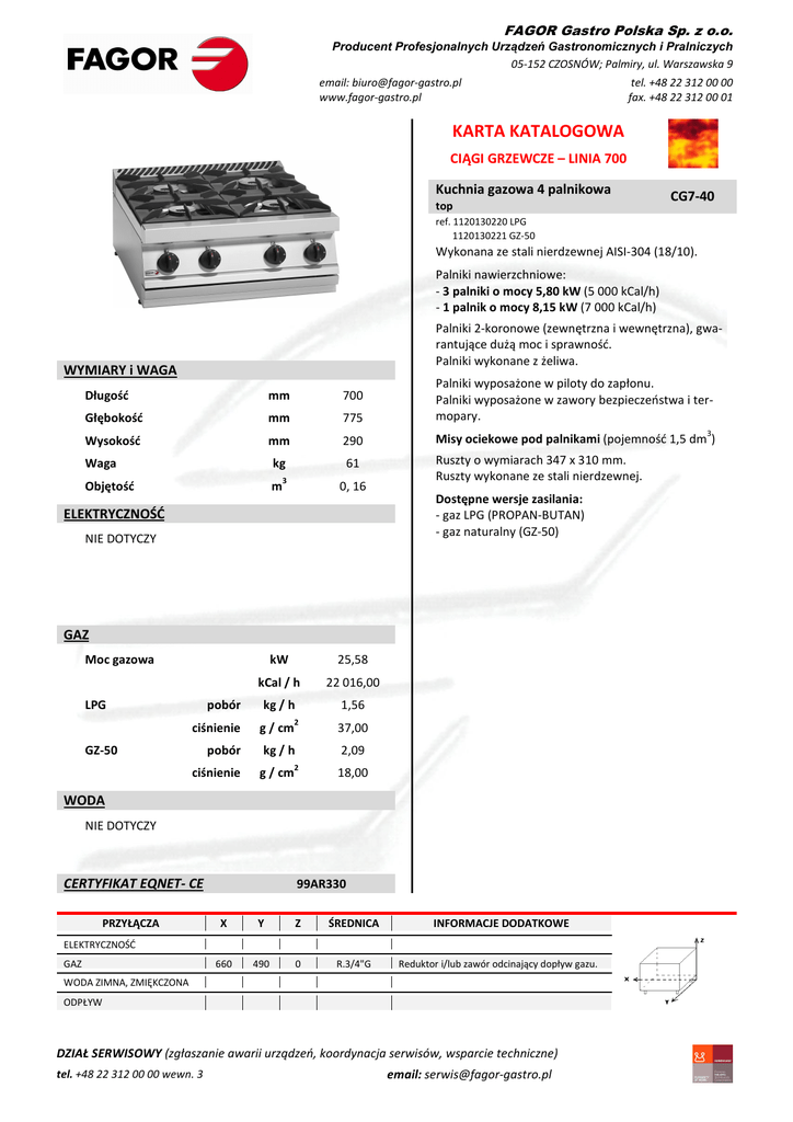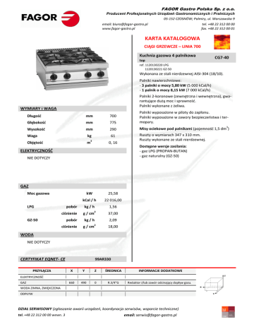 FAGOR Gastro Polska Sp. z o.o. Producent Profesjonalnych Urządzeń Gastronomicznych i Pralniczych 05-152 CZOSNÓW; Palmiry, ul. Warszawska 9 email: [email protected] www.fagor-gastro.pl tel. +48 22 312 00 00 fax. +48 22 312 00 01 KARTA KATALOGOWA CIĄGI GRZEWCZE – LINIA 700 Kuchnia gazowa 4 palnikowa top CG7-40 ref. 1120130220 LPG 1120130221 GZ-50 Wykonana ze stali nierdzewnej AISI-304 (18/10). Palniki nawierzchniowe: - 3 palniki o mocy 5,80 kW (5 000 kCal/h) - 1 palnik o mocy 8,15 kW (7 000 kCal/h) Palniki 2-koronowe (zewnętrzna i wewnętrzna), gwarantujące dużą moc i sprawność. Palniki wykonane z żeliwa. WYMIARY i WAGA Długość mm 700 Głębokość mm 775 Palniki wyposażone w piloty do zapłonu. Palniki wyposażone w zawory bezpieczeństwa i termopary. Wysokość mm 290 Misy ociekowe pod palnikami (pojemność 1,5 dm ) kg 61 Ruszty o wymiarach 347 x 310 mm. Ruszty wykonane ze stali nierdzewnej. Waga Objętość m 3 0, 16 3 Dostępne wersje zasilania: - gaz LPG (PROPAN-BUTAN) - gaz naturalny (GZ-50) ELEKTRYCZNOŚĆ NIE DOTYCZY GAZ Moc gazowa LPG pobór kW 25,58 kCal / h 22 016,00 kg / h 1,56 2 ciśnienie g / cm pobór kg / h GZ-50 ciśnienie g / cm 37,00 2,09 2 18,00 WODA NIE DOTYCZY CERTYFIKAT EQNET- CE PRZYŁĄCZA 99AR330 X Y Z ŚREDNICA 660 490 0 R.3/4"G INFORMACJE DODATKOWE ELEKTRYCZNOŚĆ GAZ Reduktor i/lub zawór odcinający dopływ gazu. WODA ZIMNA, ZMIĘKCZONA ODPŁYW DZIAŁ SERWISOWY (zgłaszanie awarii urządzeń, koordynacja serwisów, wsparcie techniczne) tel. +48 22 312 00 00 wewn. 3 email: [email protected]