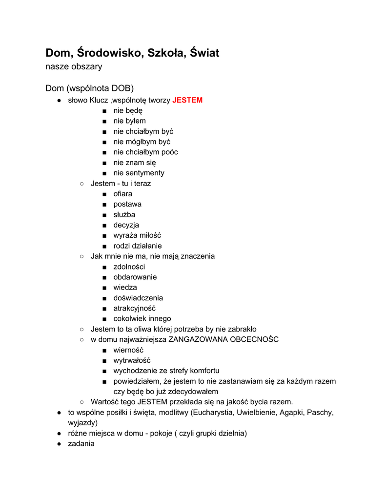 Dom, Środowisko, Szkoła, Świat nasze obszary Dom (wspólnota DOB) ● słowo Klucz ,wspólnotę tworzy JESTEM ■ nie będę ■ nie byłem ■ nie chciałbym być ■ nie mógłbym być ■ nie chciałbym poóc ■ nie znam się ■ nie sentymenty ○ Jestem tu i teraz ■ ofiara ■ postawa ■ służba ■ decyzja ■ wyraża miłość ■ rodzi działanie ○ Jak mnie nie ma, nie mają znaczenia ■ zdolności ■ obdarowanie ■ wiedza ■ doświadczenia ■ atrakcyjność ■ cokolwiek innego ○ Jestem to ta oliwa której potrzeba by nie zabrakło ○ w domu najważniejsza ZANGAZOWANA OBCECNOŚC ■ wierność ■ wytrwałość ■ wychodzenie ze strefy komfortu ■ powiedziałem, że jestem to nie zastanawiam się za każdym razem czy będę bo już zdecydowałem ○ Wartość tego JESTEM przekłada się na jakość bycia razem. ● to wspólne posiłki i święta, modlitwy (Eucharystia, Uwielbienie, Agapki, Paschy, wyjazdy) ● różne miejsca w domu pokoje ( czyli grupki dzielnia) ● zadania ● domownicy akceptują zasady i elementy wspólnego życia : ○ Eucharystię ○ Uwielbienia ○ Małe Grupy ○ Wyjazdy ● uczestniczą w życiu domowym w całości, Jesteś gdy bierzesz to co dom Ci daje ● czasem może ich nie być ( na czyiść urodzinach) bo są w pracy, bo są chorzy , na wyjeździe, na długiej delegacji, bardzo chcieli, ale czasem nie mogą, starają się być i podjemują ofiary by być ( jak Józek) ● jestem domownikiem gdy mam pokój w którym mieszkam( należysz do grupki jesteś we wspólnocie) ● staramy się, żeby pokoje i warunki były jak najlepsze, ale często nasz dom, nasze pokoje nie przypomina tych z katalogów, ikei czy z opowieści lub wspomnień ● w domu są starsi i młodsi ale wszyscy są równi. W domu nie ma domowników hornorowych, ekspertów, wszyscy są zaangażowani dopóki żyją w domu. ● domownicy mają zadania (diakonie), ○ wypełnianie tych działań wpływa na funkcjonowanie domu ○ są domownicy wyznaczeni do odpowiedzialnośći za poszczególne zadania (liderzy diakoni) ○ w zadaniach mogą pomagać przyjacieleśrodowisko ○ ale nie mogą brać za nie odpowiedzialności ( być liderami ) , ze względu na ich “nie pełną” realację z domem. Nie mają dobrej oceny rzeczywistości domu. Mogło by to być szkodliwe/ nie uczciwe/ zniechęcające dla wiernych i oddanych domowników ○ ważne jest żeby odpowiedzialnym się chciało ( mieli Ducha) oraz ich skuteczność ○ odpowiedzialni za pokoje i zadania zbierają się co jakiś czas razem by rozmawiać o funkcjonowaniu domu ○ to są ludzie “ubrudzeni”, “spoceni”, “przepłakani” odpowiedzialnością za swoje zadania a przez to Ci, którym zależy, bo przepracowani. Dlatego oni najlepiej zatroszczą się o dobro wspólne, byli wierni w małych rzeczach. ● w domu jest autorytet i hierarchia ● jesteśmy otwartym domem, wychodzimy na zewnątrz, zapraszamy gości Gość w dom Bóg w dom ○ trudne zadanie ○ otwartość na każdego: wiek, wykształcenie, styl bycia, ● zadaniem domowników jest być gościnnym: każdy domownik ma się czuć gospodarzem odpowiedzialnym za to by goście byli dobrze przyjęci i czuli sie dobrze ● być domownikiem to powołanie, wolny wybór wolnych ludzi jak modlitwa ty dajesz to Bogu i się nie targujesz, nie wybrzydzasz bierzesz w pakiecie, Bóg odpowiada i błogosławi, ale jesteś w tym dawaniu wolny. ● dom nie jest korporacją, grupą wspólnych interesów, zainteresowań. Domownicy nie wybierają sobie współdomowników, ani tych z którymi są w pokojach. ● decyzja życia w domu to decyzja na opuszczenie strefy własnego komfortu trudno się żyje w domu ( Łomnica ) łatwiej samemu chodzisz swoimi drogami ● w domu jest też miejsce dla tych, którzy przyglądają się bo nie znają nas, mieszkają z nami. taki stan tylko raz, potem należą do środowiska albo do domu Środowisko ( środowisko DOB) ● ● ● ● ● ● ● ● ● ● ● nasi bliscy i dalsi znajomi niektórzy są u nas prawie codziennie, spędzają całe dnie są tacy co są na chwile, są od czasu do czasu są zaproszeni do uczestniczenia w funkcjonowaniu domu ( mogą się czasem nawet przenocować) często utożsamiają się z domownikami mają szacunek domowników jeśli chcą pomagają nam, pracują w naszym domu, czasem karmią się u nas czasem przynoszą nam dobre jedzenie to nasze ciocie, wójkowie, krewni albo po prostu koledzy, albo Ci co kiedyś z nami mieszkali nie są domownikami z różnych powodów ○ nie mają takiej potrzeby ○ nie mogą sobie na to pozwolić ○ zajmują się czymś innym ○ mieszkają daleko ○ nie chcę się im aż tak bardzo ○ mają inne zasady ○ nie odpowiadają im warunki (zasady) w naszym domu, ○ dom nie spełnia ich wymagań ○ odrzucają któryś z elementów życia w domu ( Eucharystie, Małą grupę, uwielbienie, wyjazdy). Są u nas na obiadach, ale na śniadaniach ● ● ● ● ● ● wyjątkowo, na urodziny jednego z domowników chętnie przyjdą innego nie za bardzo ○ nie przyjmują domowego autorytetu i hierarchi zawsze mogą się przeprowadzić do domu słuchamy ich gdy to co mówią buduje nasz dom i domowników nie słuchamy gdy to co mówią i robią dewastuje nasz dom, niszczy domowe relacje pytamy się ich o opinie i słuchamy nie ustalają zasad życia w naszym domu ( bo nie są domownikami ) inicjatywy/wydarzenie stworzone przez osoby ze środowiska nie sa z założenia działaniami (firmowanymi) domu(wspólnoty) chyba, że dom jako dom włączy się w nie. Szkoła ( Szkoła życie Chrześcijańskiego św. Maryi) ● nasz dom jest bardzo mocno związany ze szkoła jakby przyklejony do szkoły, nie wyobrażamy sobie w tym momencie funkcjonowania szkoły ● szkoła stoi na Doświadczeniu i wiedzy ( inne akcenty niż dom) ● szkoła nas uczy, rozwija i inspiruje ● dzięki szkole widzimy “trochę świata” ( wycieczki, ludzie) ● dzięki szkole mamy p
