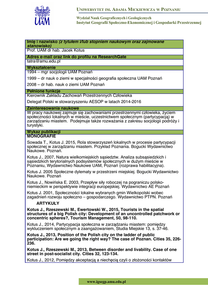 UNIWERSYTET IM. ADAMA MICKIEWICZA W POZNANIU Wydział Nauk Geograficznych i Geologicznych Instytut Geografii Społeczno-Ekonomicznej i Gospodarki Przestrzennej Imię i nazwisko (z tytułem i/lub stopniem naukowym oraz zajmowane stanowisko) Prof. UAM dr hab. Jacek Kotus Adres e-mail oraz link do proflu na ResearchGate [email protected] Wykształcenie 1994 – mgr socjologii UAM Poznań 1999 – dr nauk o ziemi w specjalności geografa społeczna UAM Poznań 2008 – dr hab. nauk o ziemi UAM Poznań Pełnione funkcje Kierownik Zakładu Zachowań Przestrzennych Człowieka Delegat Polski w stowarzyszeniu AESOP w latach 2014-2016 Zainteresowania naukowe W pracy naukowej zajmuje się zachowaniami przestrzennymi człowieka, życiem społeczności lokalnych w mieście, uczestnictwem społecznym (partycypacją) w zarządzaniu miastem. Podejmuje także rozważania z zakresu socjologii podróży i turystyki. Wykaz publikacji MONOGRAFIE Sowada T., Kotus J. 2015, Rola stowarzyszeń lokalnych w procesie partycypacji społecznej w zarządzaniu miastem. Przykład Poznania. Bogucki Wydawnictwo Naukowe. Poznań. Kotus J., 2007, Natura wielkomiejskich sąsiedztw. Analiza subsąsiedzkich i sąsiedzkich terytorialnych podsystemów społecznych w dużym mieście w Poznaniu, Wydawnictwo Naukowe UAM, Poznań (rozprawa habilitacyjna). Kotus J. 2005 Społeczne dylematy w przestrzeni miejskiej. Bogucki Wydawnictwo Naukowe. Poznań Kotus J., Nowińska E. 2003, Przepływ siły roboczej na pograniczu polskoniemieckim w perspektywie integracji europejskiej. Wydawnictwo AE Poznań Kotus J. 2001, Społeczności lokalne wybranych gmin Wielkopolski wobec zagadnień rozwoju społeczno – gospodarczego. Wydawnictwo PTPN. Poznań ARTYKUŁY Kotus J., Rzeszewski M., Ewertowski W., 2015, Tourists in the spatial structures of a big Polish city: Development of an uncontrolled patchwork or concentric spheres?, Tourism Management, 50, 98-110. Kotus J., 2014, Partycypacja społeczna w zarządzaniu miastem: pomiędzy wykluczeniem społecznym a zaangażowaniem, Studia Miejskie 13, s. 37-46. Kotus J., 2013, Position of the Polish city on the ladder of public participation: Are we going the right way? The case of Poznan. Cities 35, 226236. Kotus J., Rzeszewski M., 2013, Between disorder and livability. Case of one street in post-socialist city. Cities 32, 123-134. Kotus J., 2012, Pomiędzy akceptacją a niechęcią czyli o złożoności kontaktów www.igsegp.amu.edu.pl UNIWERSYTET IM. ADAMA MICKIEWICZA W POZNANIU Wydział Nauk Geograficznych i Geologicznych Instytut Geografii Społeczno-Ekonomicznej i Gospodarki Przestrzennej międzykulturowych w podróży, Turyzm/Tourism”, t. 22, z. 1, s. 5–9. Kotus J., 2012, Współczesny wymiar ulicy dużego miasta, Sagan I., Szmytkowska M. (red.) Miasto w dobie neoliberalnego urbanizmu, 106 – 119, Wyd. Uniwersytet Gdański, Gdańsk. Kotus J., 2011, Dokąd zmierza miasto polskie na początku nowego wieku?, W: Słodczyk J., Śmigielska M. (red.) Procesy urbanizacji i ich uwarunkowania na początku XXI wieku, Studia miejskie 4, s. 75 – 81, Uniwersytet Opolski. Kotus J., Hławka B., 2010, Urban neighbourhood communities organised online – social ephemeron or a new form of self-organisation in the Polish city? Cities, 27, 4, 204-214 Kotus J., 2009, Fragmenting and isolating neighbourhoods: a way of creating fexible spaces and fexible behaviours? Geojournal 74, 6 pp 551 – 566. Kotus J., 2009, Poznań wobec przyjezdnych – analiza struktur miejskich w kontekście teorii „city visitors”. W: Parysek J. (red.) Wybrane problemy miast i aglomeracji miejskich na początku XXI wieku. Seria Rozwój Regionalny i Polityka Regionalna nr 6. Biuletyn IGSEiGP UAM Poznań. Poznań, 27 – 46 Kotus J., 2008 - Od nostalgicznej „sezamkowej ulicy” po enklawy izolacji czyli o terytorialnych formach wielkomiejskiego sąsiedztwa. [W:] Terytorium, region, miejsce-czas i przestrzeń w geografi, Rembowska K., Suliborski A., Maik W. (red.). Wydawnictwo uczelniane WSG, Bydgoszcz, 131-145, ISBN 978-83-6103644-9 Kotus J., Hławka B., 2008 - Miejskie społeczności sąsiedzkie organizowane on-line – efemeryda społeczna czy nowa forma samoorganizacji na poziomie lokalnym?. Geopolis-Elektroniczne Czasopismo Geografczne 1: 57-82 Kotus J., Ewertowski M., A. Tomczyk, 2008, Czy Poznań może być miastem otwartym dla turysty? Analiza struktury przestrzennej miasta. XXI Konwersatorium wiedzy o mieście, Uniwersytet Łódzki, Łódź, 277 – 287. Kotus J., 2007, O naturze wielkomiejskich sąsiedztw. Jażdżewska I. (red.) Polska geografa osadnictwa. Dotychczasowy dorobek. Program Badań Wydawnictwo. XX Konwersatorium wiedzy o mieście, Uniwersytetu Łódzkiego, Łódź, 120-131. Kotus J., 2006, Changes in the Spatial Structure of a Large Polish City - the Case of Poznan Cities 23, 5, 364-381. Kotus J., 2006, Terytorialne podsystemy społeczne o charakterze wspólnotowym w mieście. Przegląd Geografczny 78, 2, 231-245. Kotus J., 2006, Udział jednostek pomocniczych w zarządzaniu miastem. W: Słodczyk J., Klimek R. (red.) Przemiany przestrzeni miast i stref podmiejskich. Uniwersytet Opolski. Opole. 89-98. Kotus J., Ewertowski M., 2006, Perspektywy rozwoju CBD w Poznaniu wobec rzeczywistości. Słodczyk J., Klimek R. (red.) Przemiany przestrzeni miast i stref podmiejskich. Uniwersytet Opolski. Opole. 43-52. Kotus J., 2006, Pomiędzy nowym a starym wymiarem obszarów życia sąsiedzkiego w dużym mieście, W: Jażdżewska I. (red.) XIX Konwersatorium wiedzy o mieście- Nowe przestrzenie w mieście, ich organizacja i funkcje, s. 321335. Wyd. Uniwersytet Łódzki Dolata M., Kotus J., 2006, Social Production of Urban Space (A Case Study of www.igsegp.amu.edu.pl UNIWERSYTET IM. ADAMA MICKIEWICZA W POZNANIU Wydział Nauk Geograficznych i Geologicznych Instytut Geografii Społeczno-Ekonomicznej i Gospodarki Przestrzennej „Bad” Areas in Poznań). Geographia Polonica 79/2, 2-23. Kotus J., 2005, Sąsiedztwo w małym mieście
